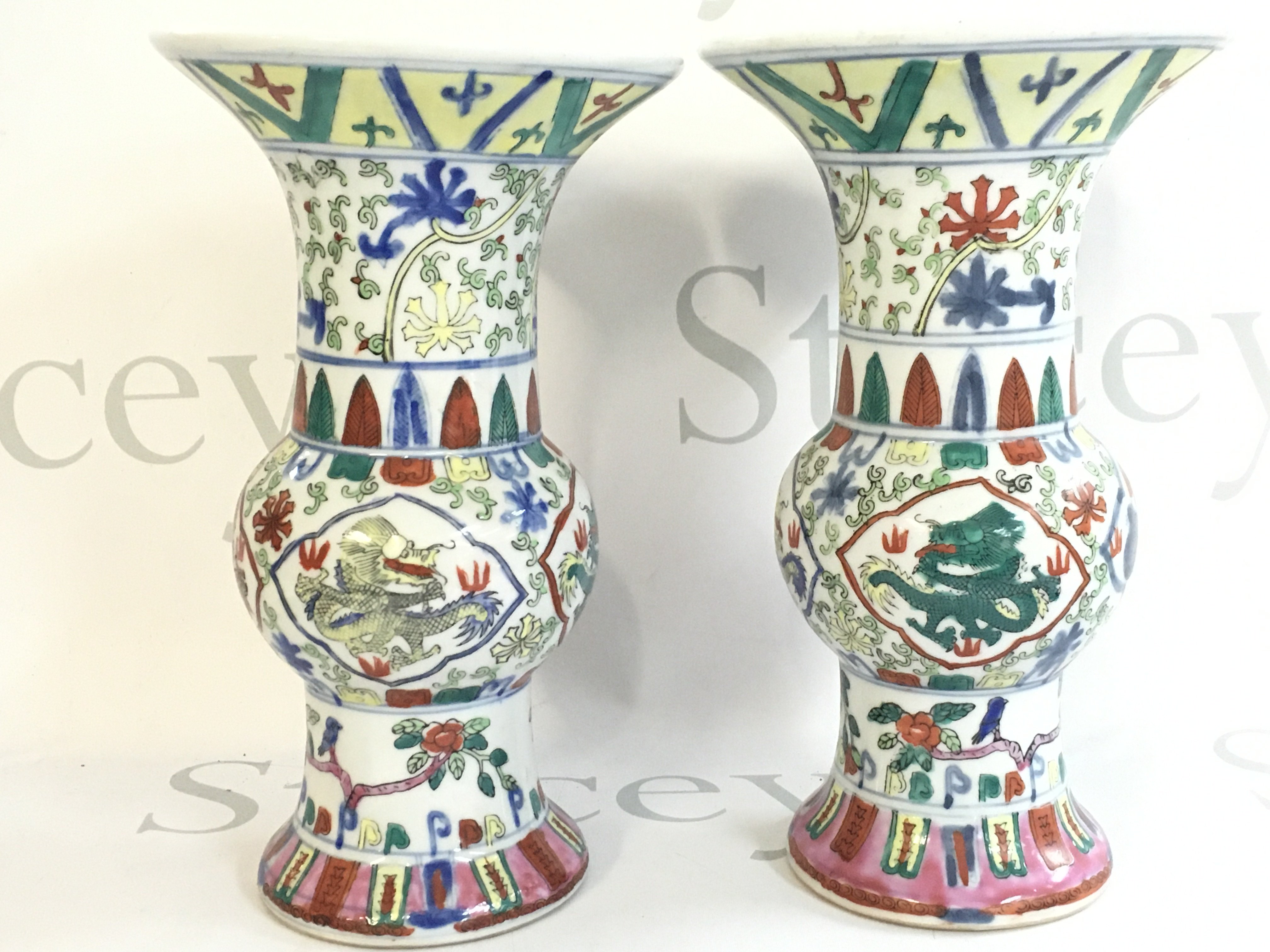 A pair of Chinese Wucai dragon vases, six character marks on the bases. 24cm tall. This lot cannot be posted