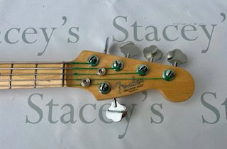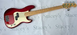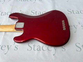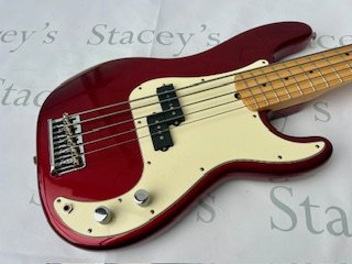 A 2009 Corona California 5 String Precision Bass Guitar in Candy Apple Red with maple fingerboard and chrome parts. All original with very little evidence of any playwear or tarnishing to chrome brightwork. Cream aged pickguard. Comes with non original Yamaha bass guitar hard case.
