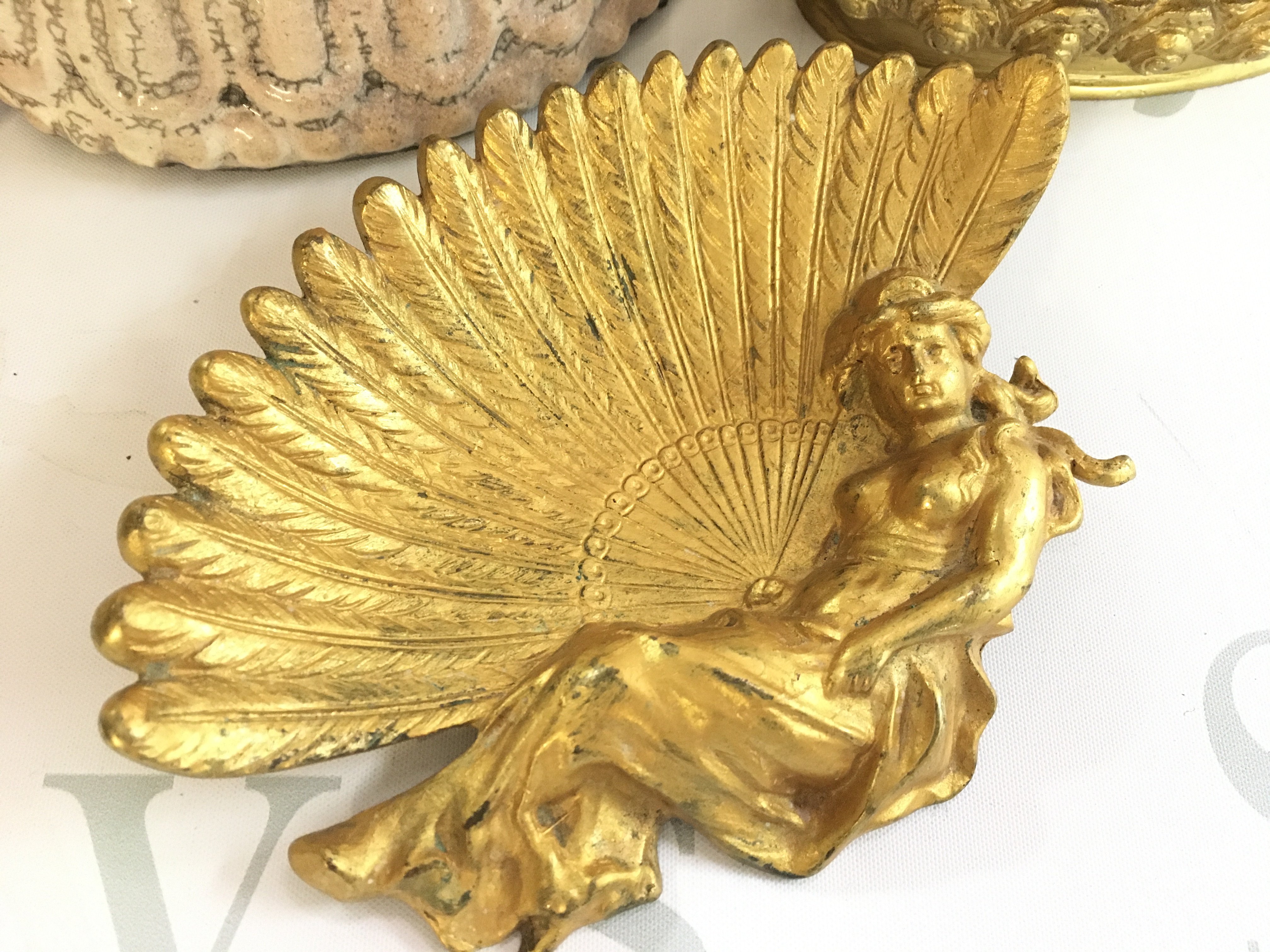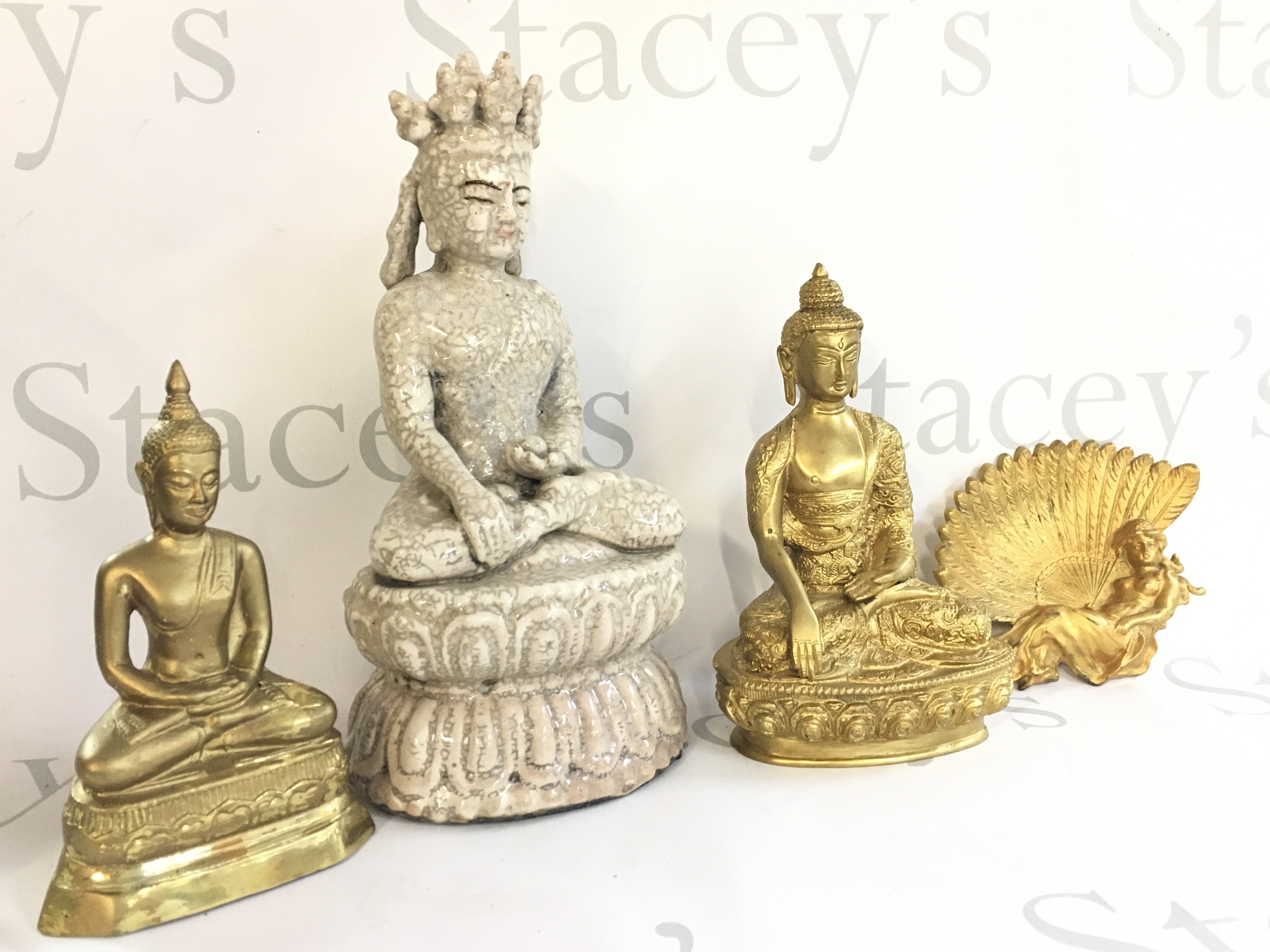 A collection of brass and ceramic buddha figures and an art nouveau style dish. This lot cannot be posted