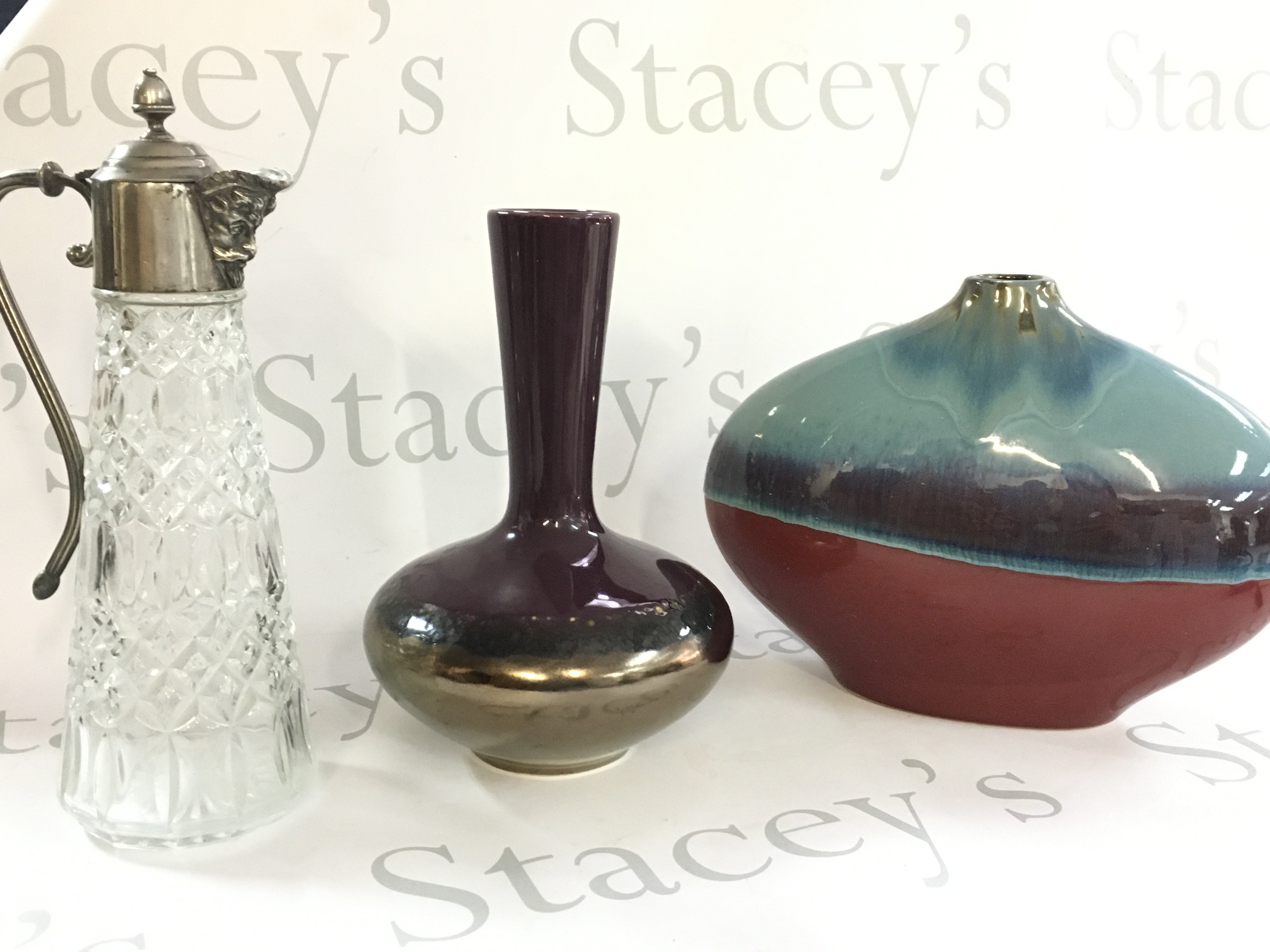 A collection of vases including art vases and a Falstaff cut glass vase with a silver plated top. This lot cannot be posted
