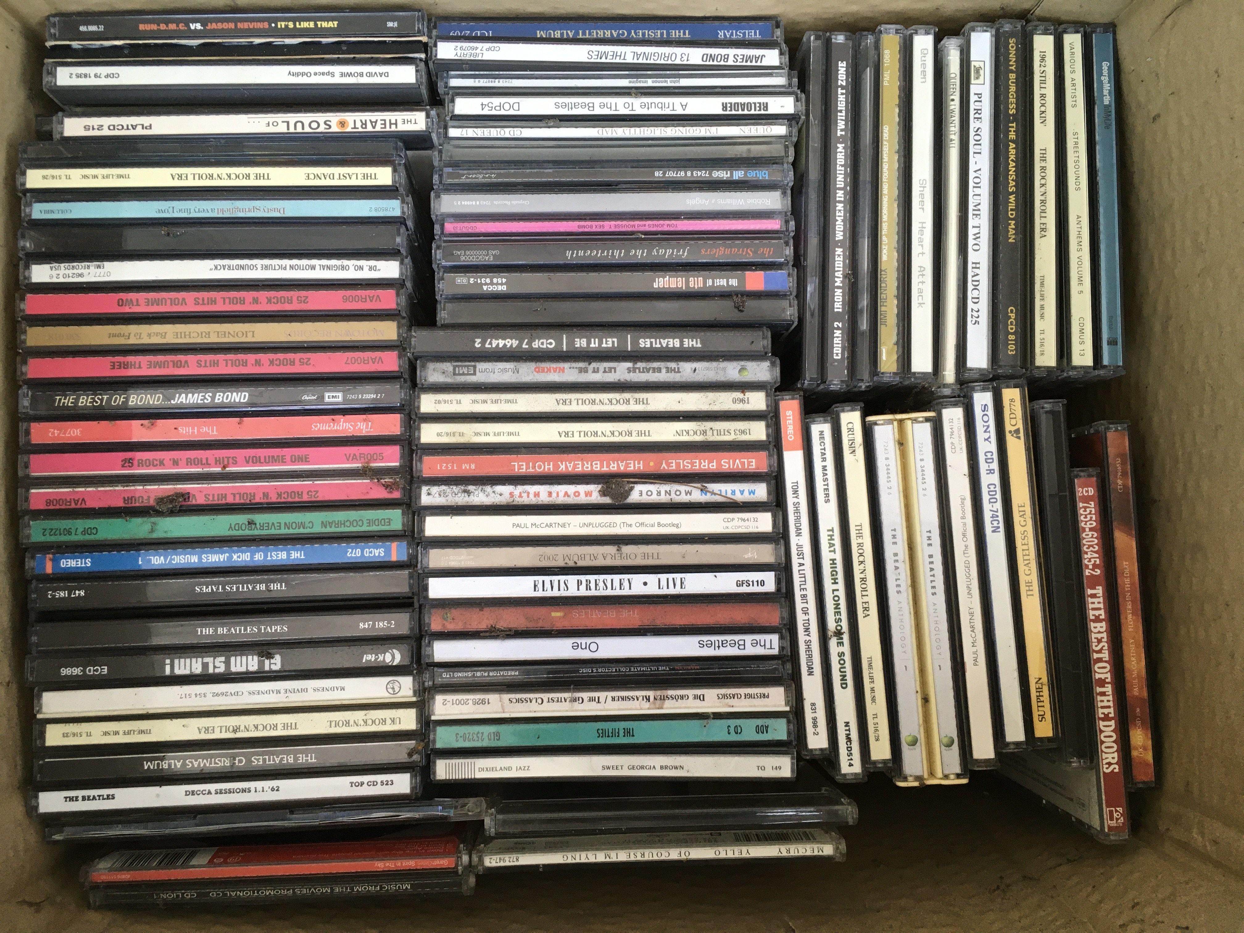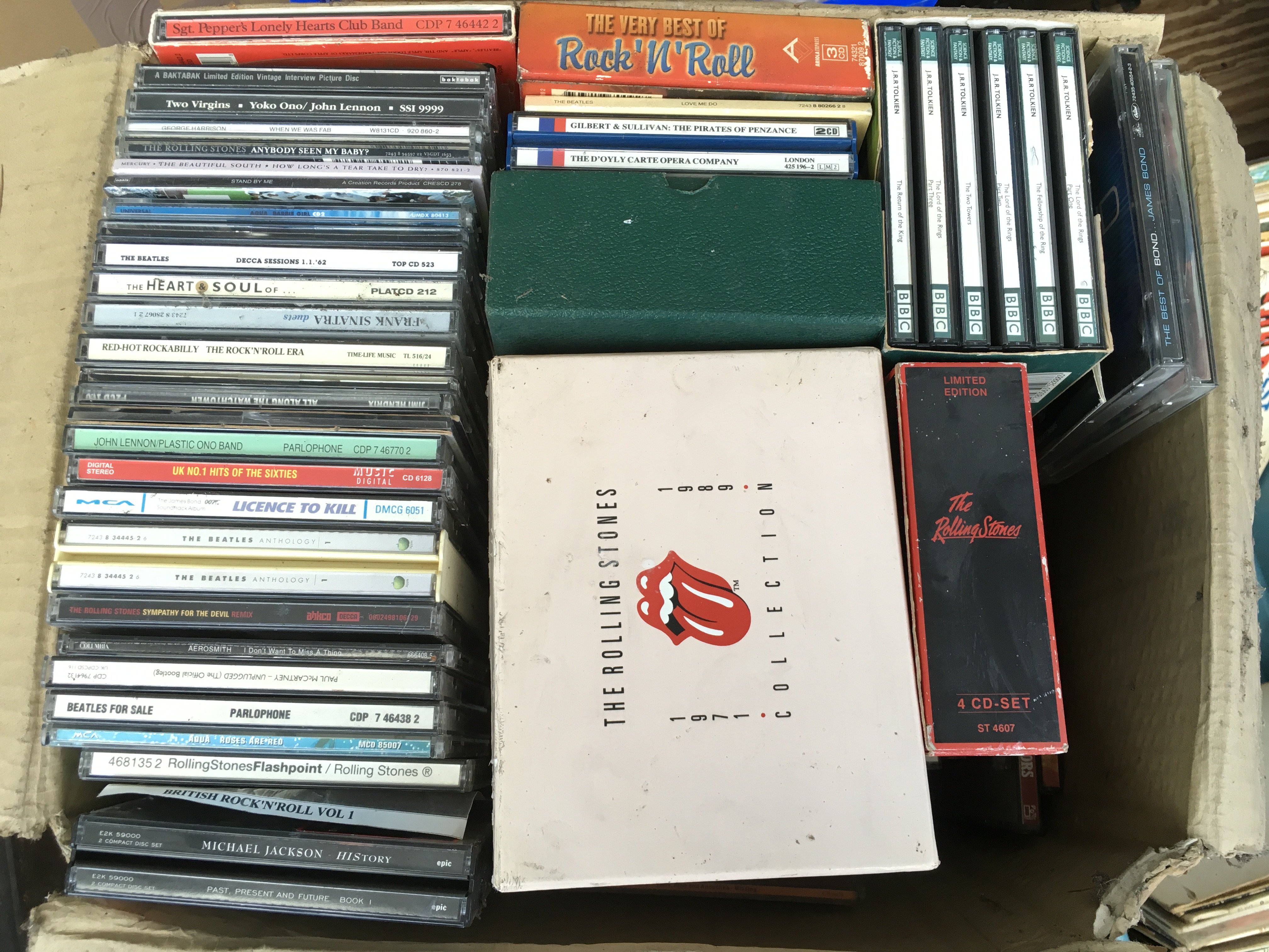 A box of CDs including a Rolling Stones 1971-1989 box set (Steel Wheels is not original) and various other artists.
