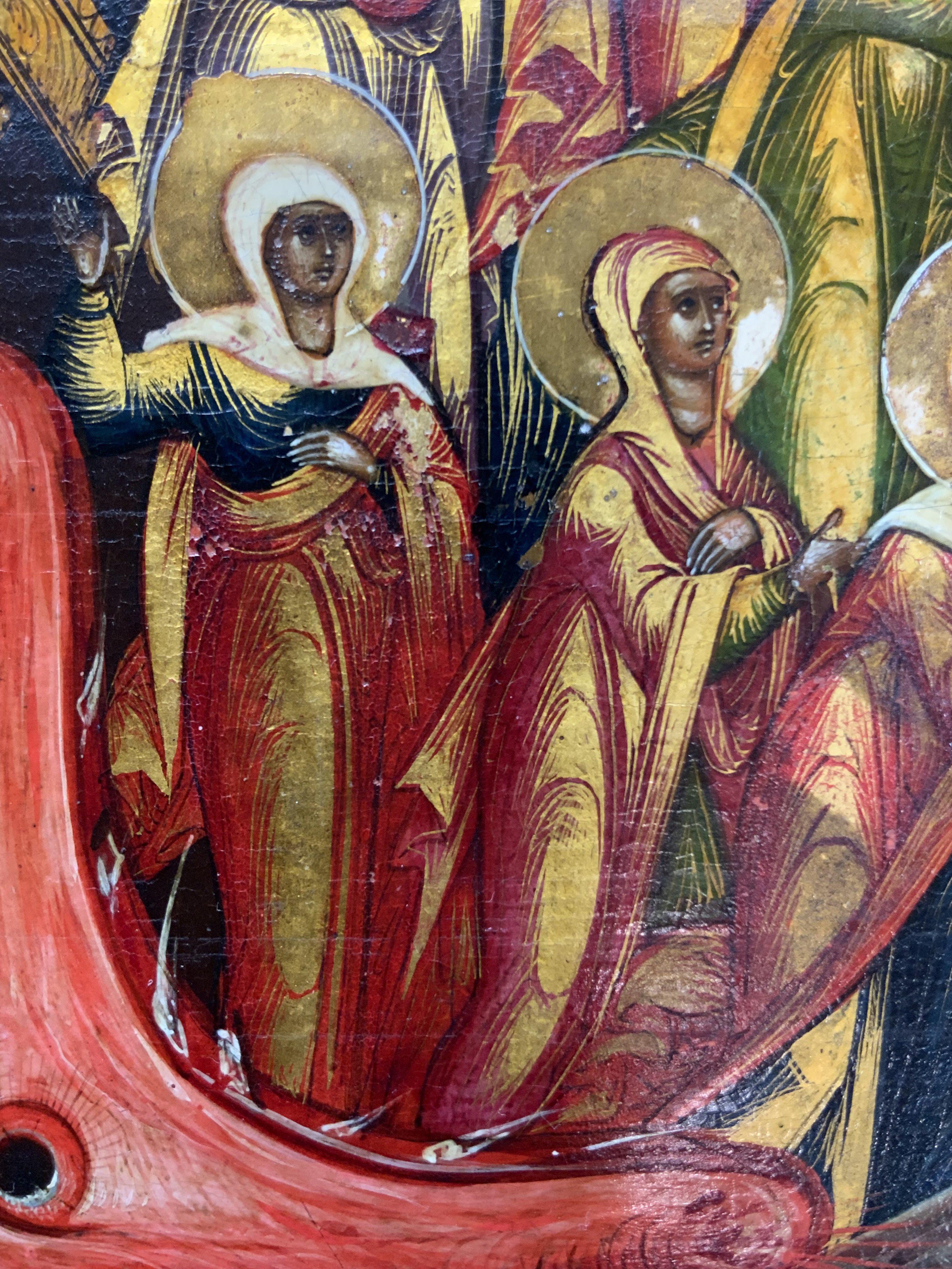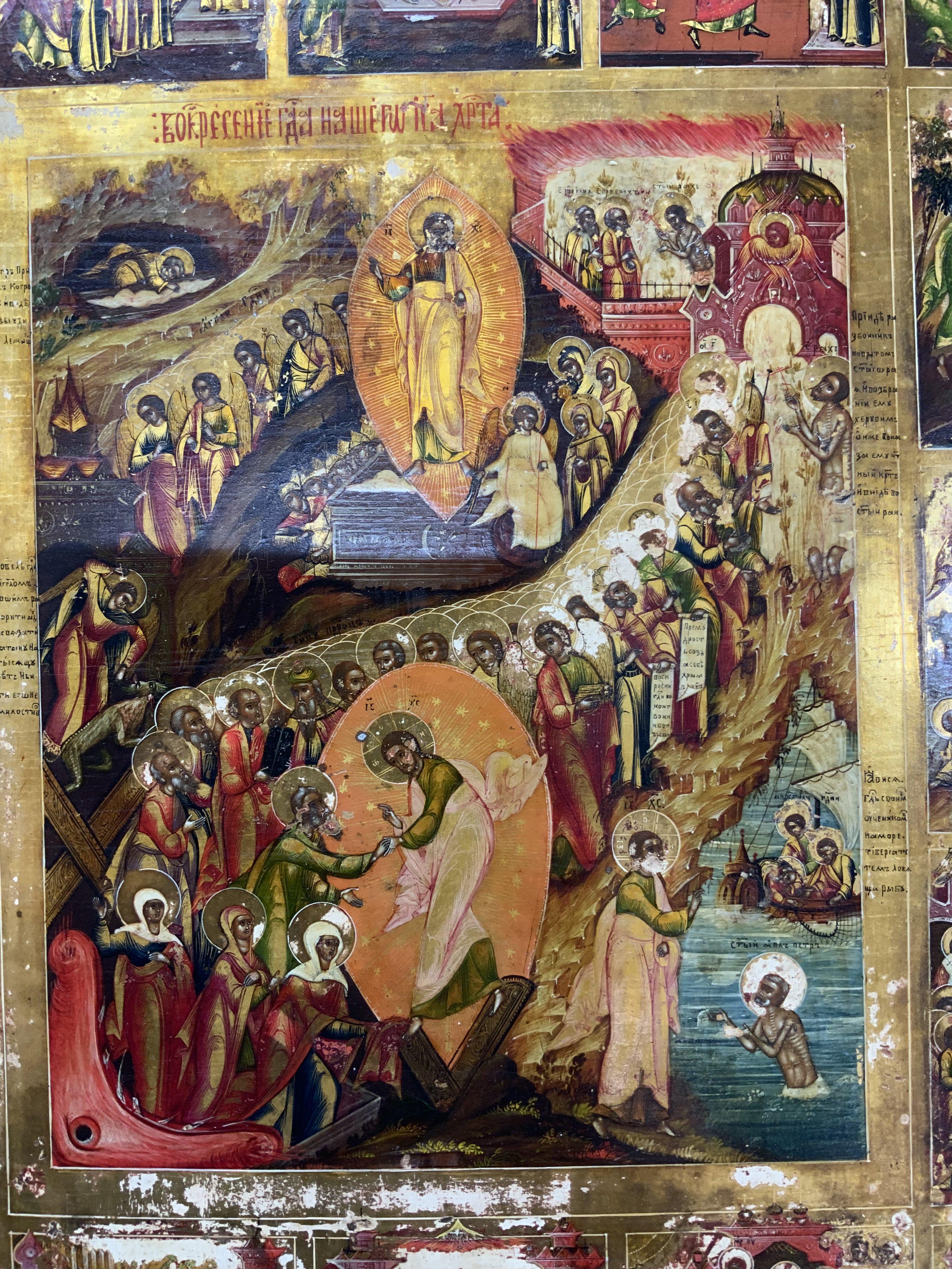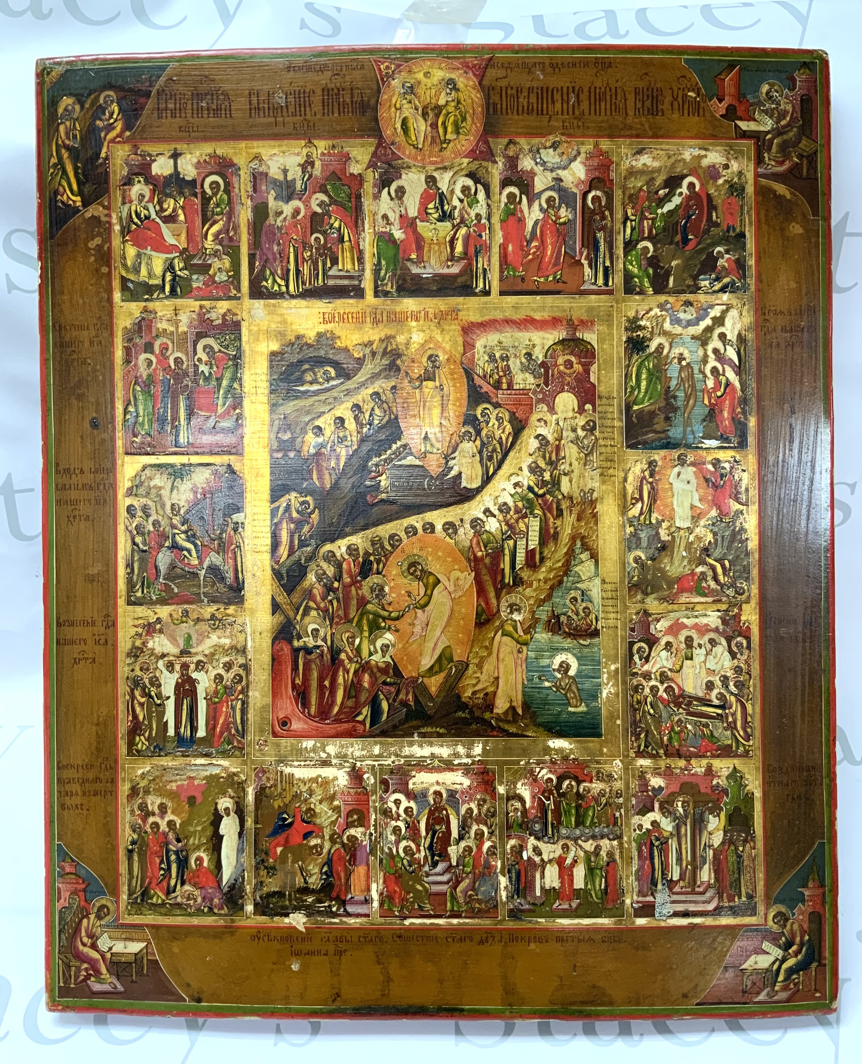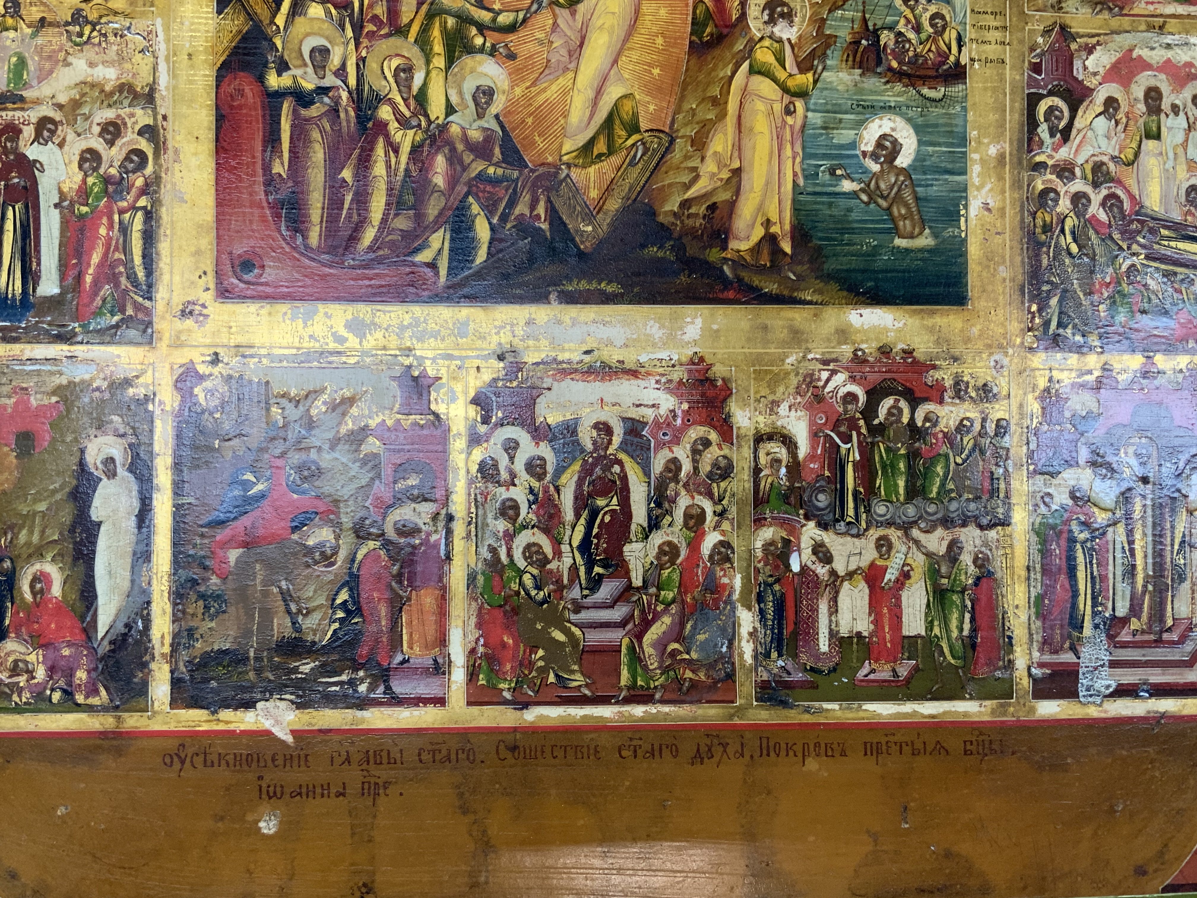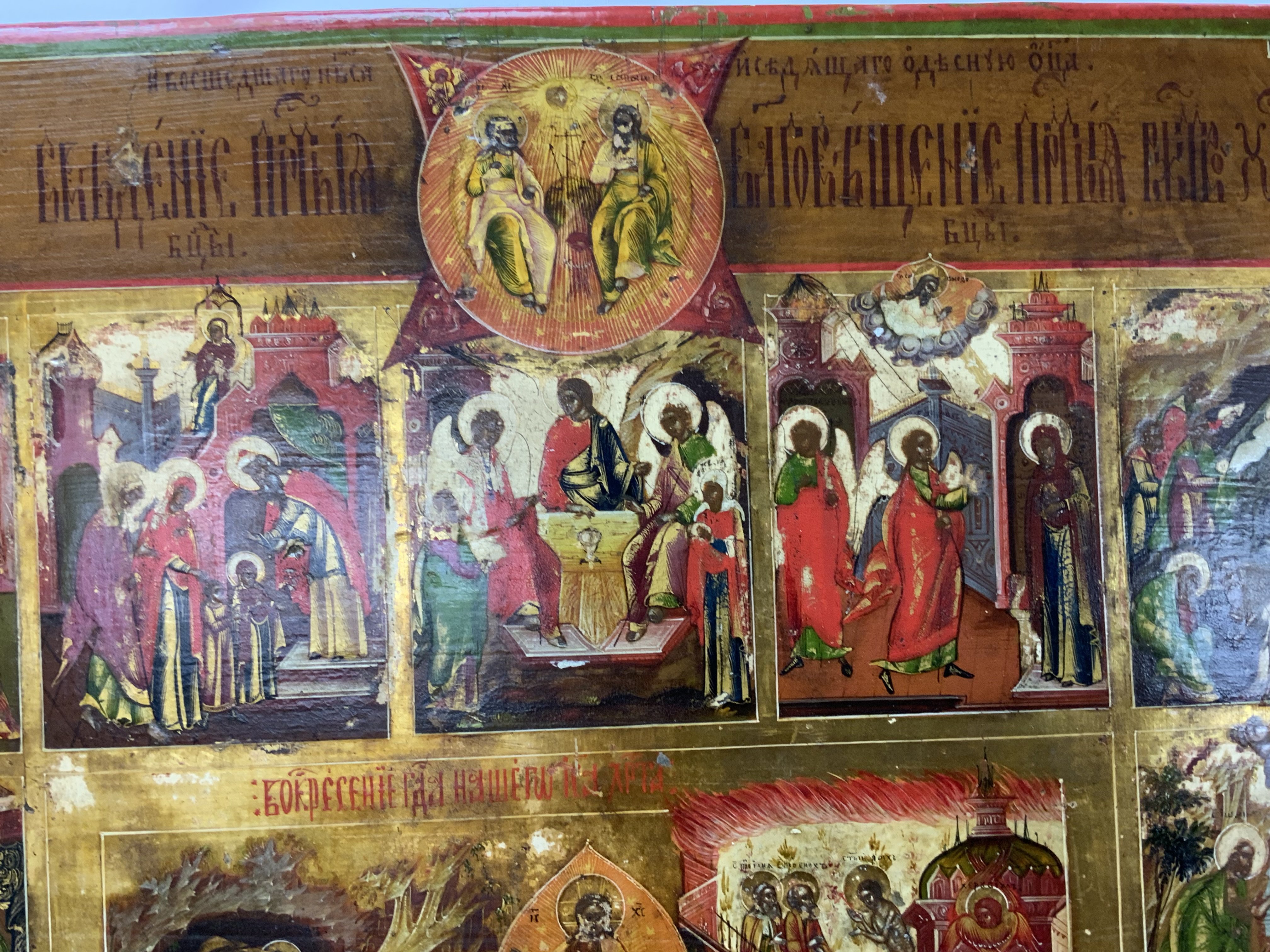 A large 19th Century Russian wooden panel Icon depicting The Great Feasts and Scenes from the Gospels and the Old Testament. 53.5cm x 44cm. (D)