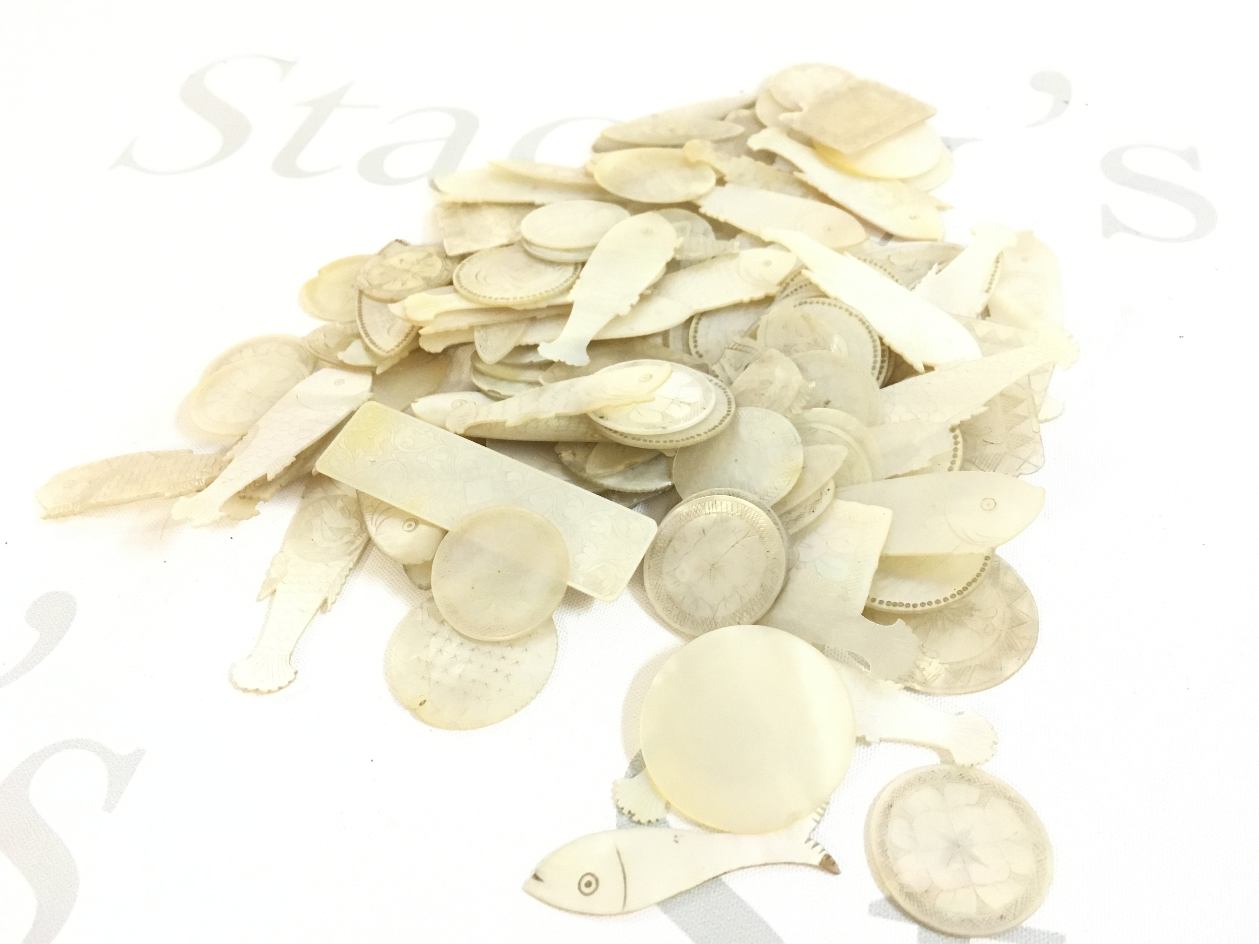 A collection of Chinese mother of pearl game counters including fish, rectangles, ovals, circle shapes etc. Postage category B