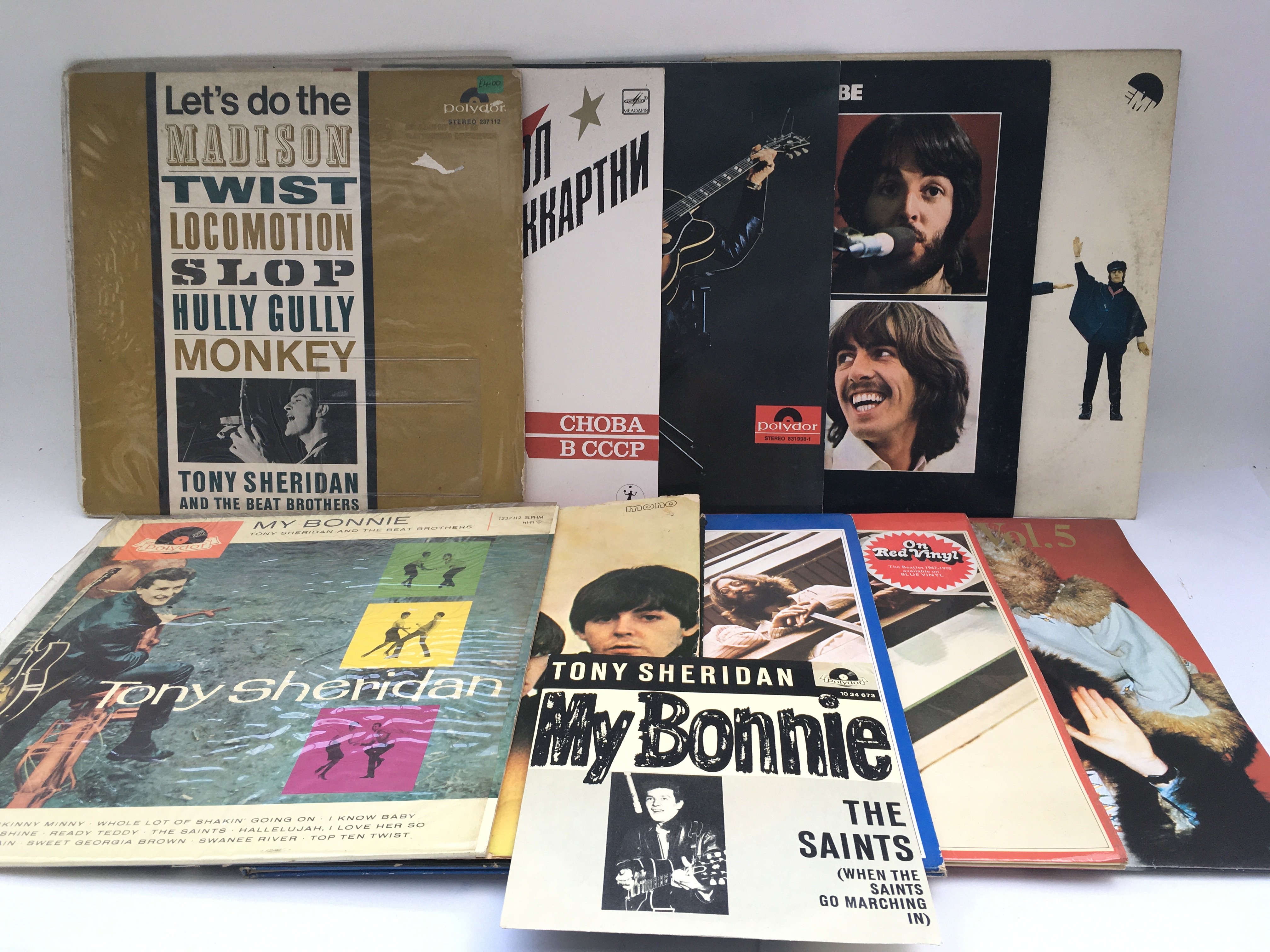 Ten Beatles and related LPs comprising some foreign pressings plus a Tony Sheridan 7" single.