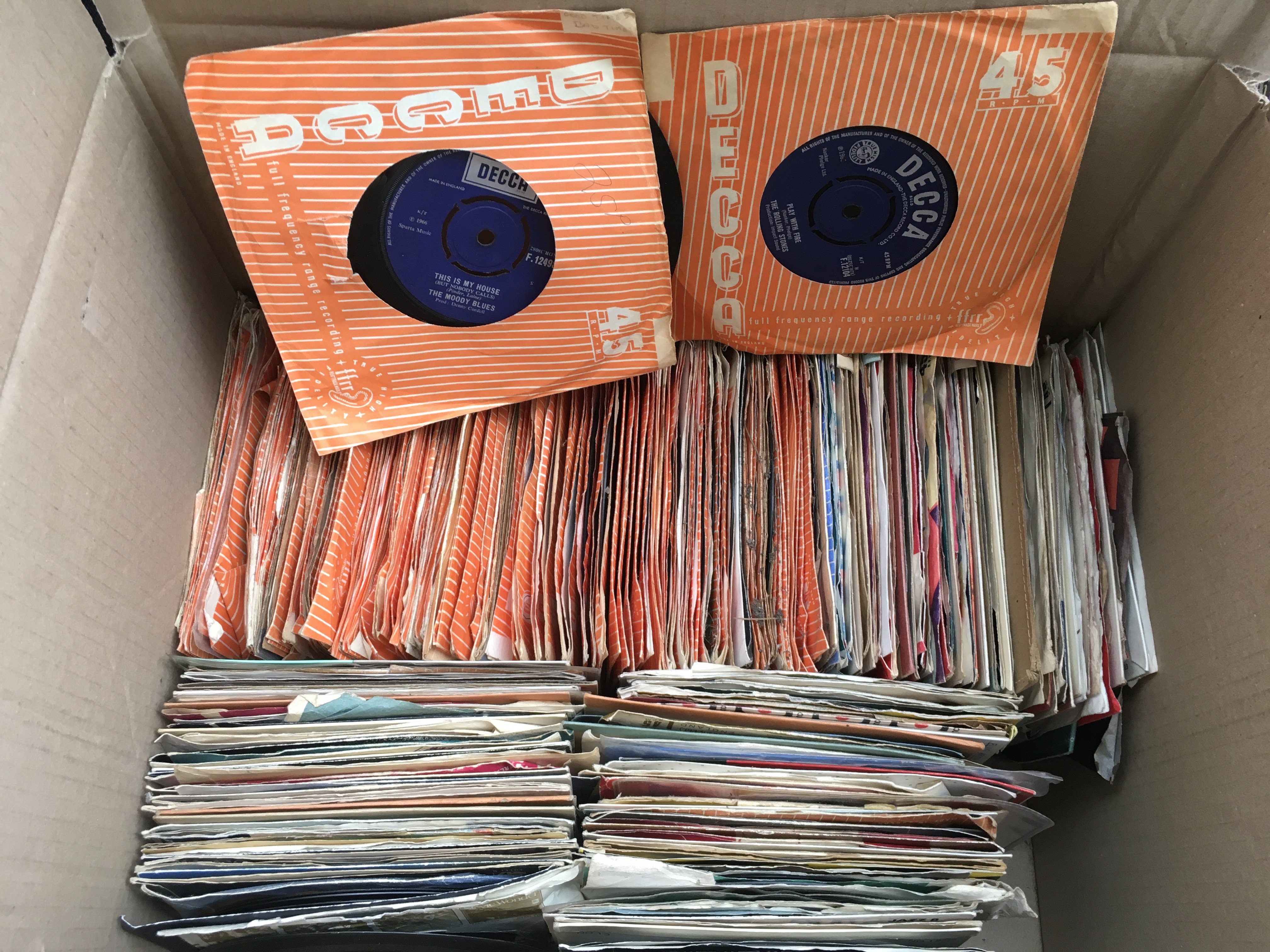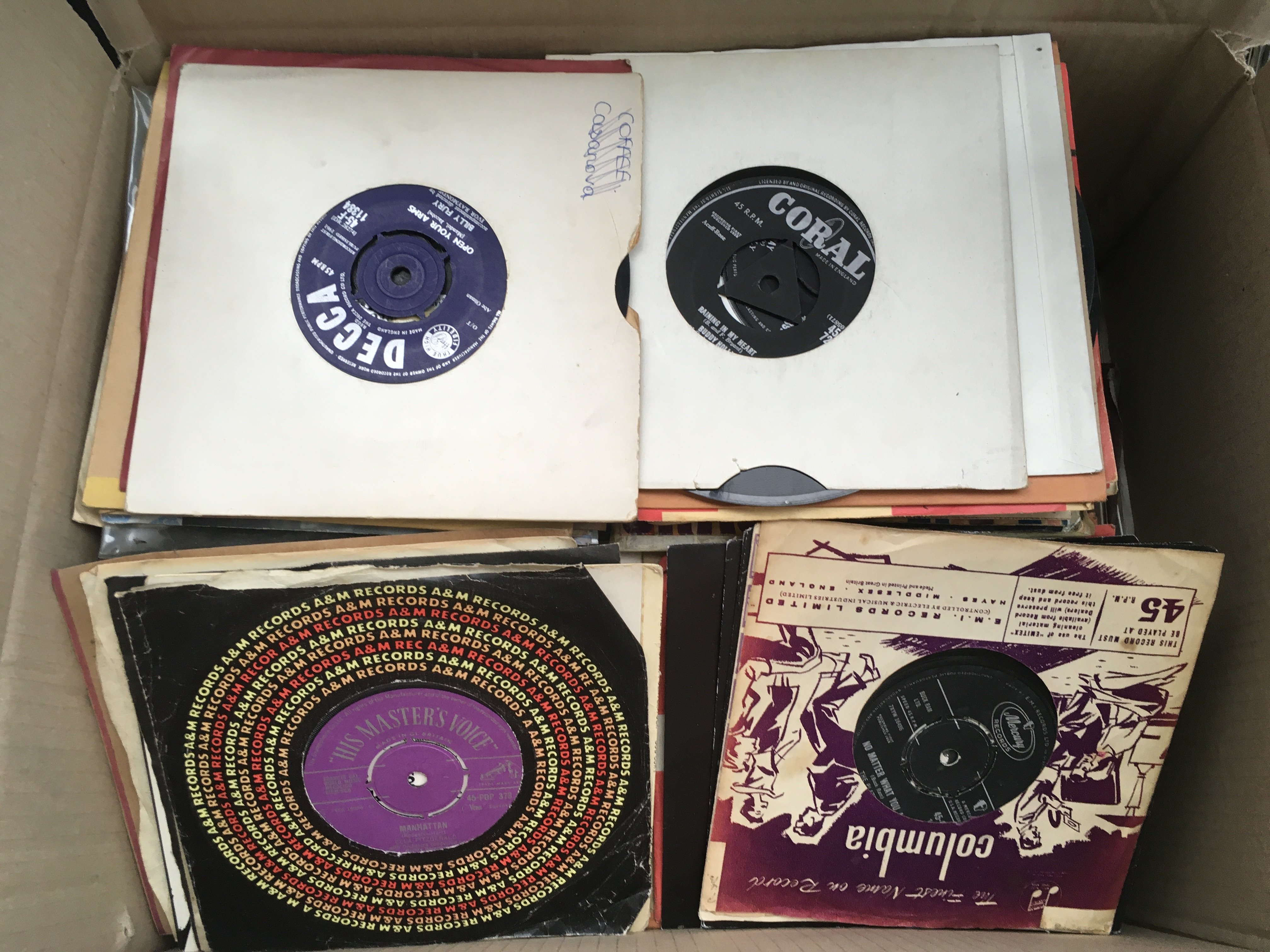 A box of 7" singles and EPs by various artists including The a Rolling Stones, Billy Fury, Buddy Holly and many more.
