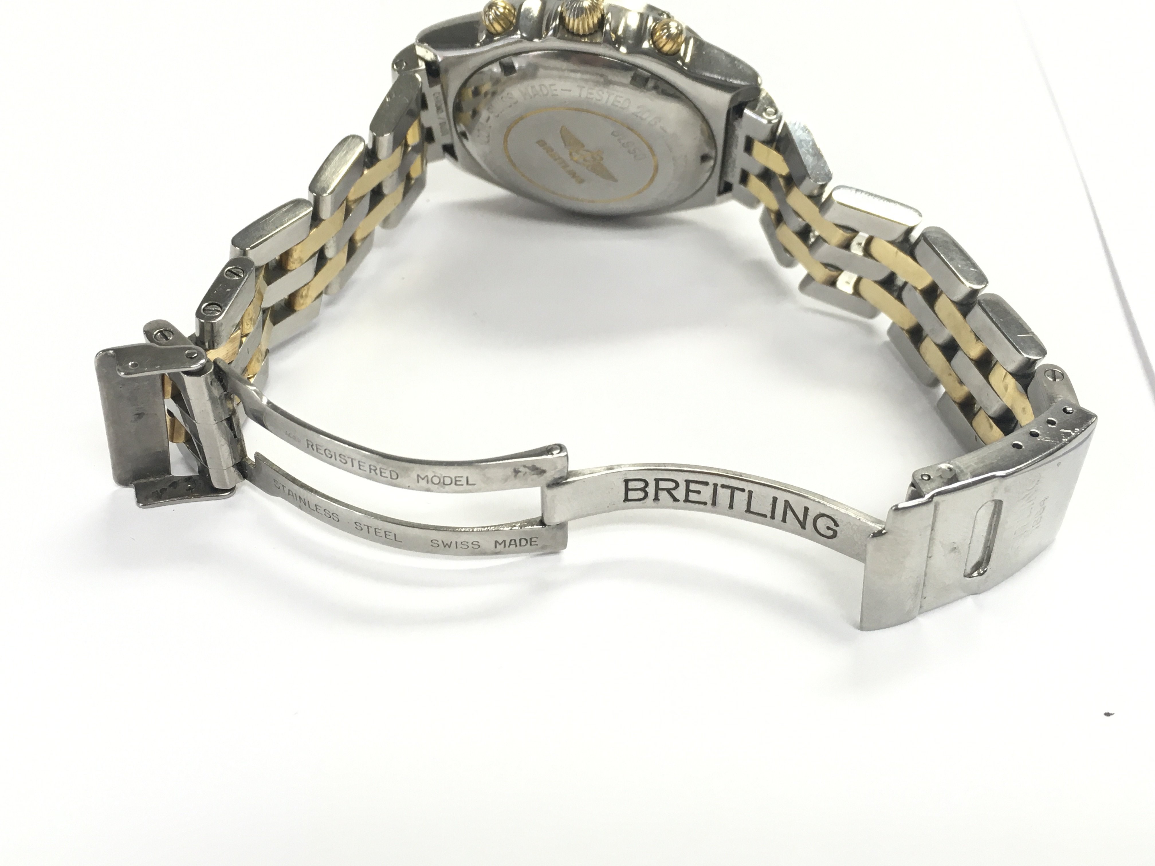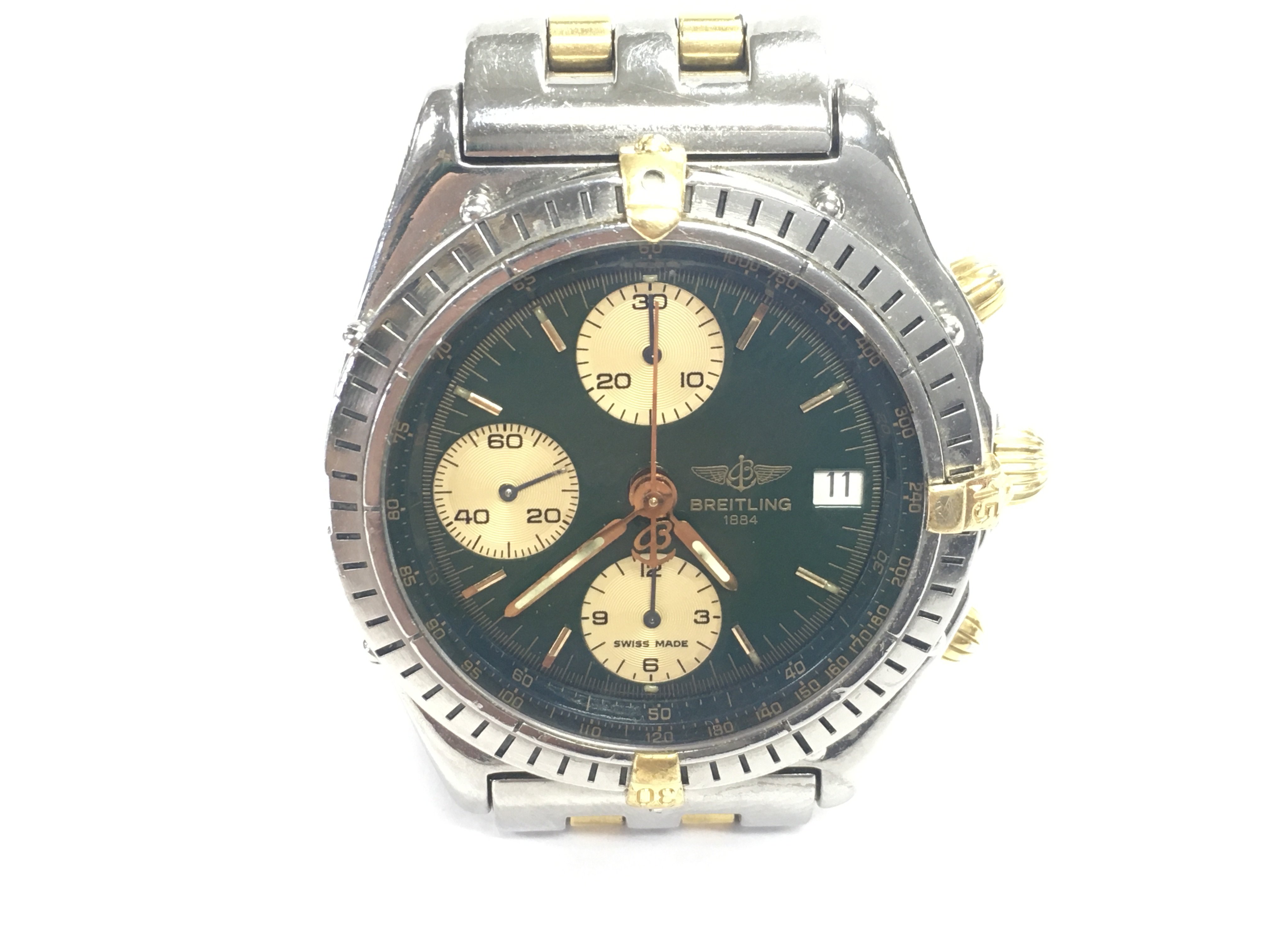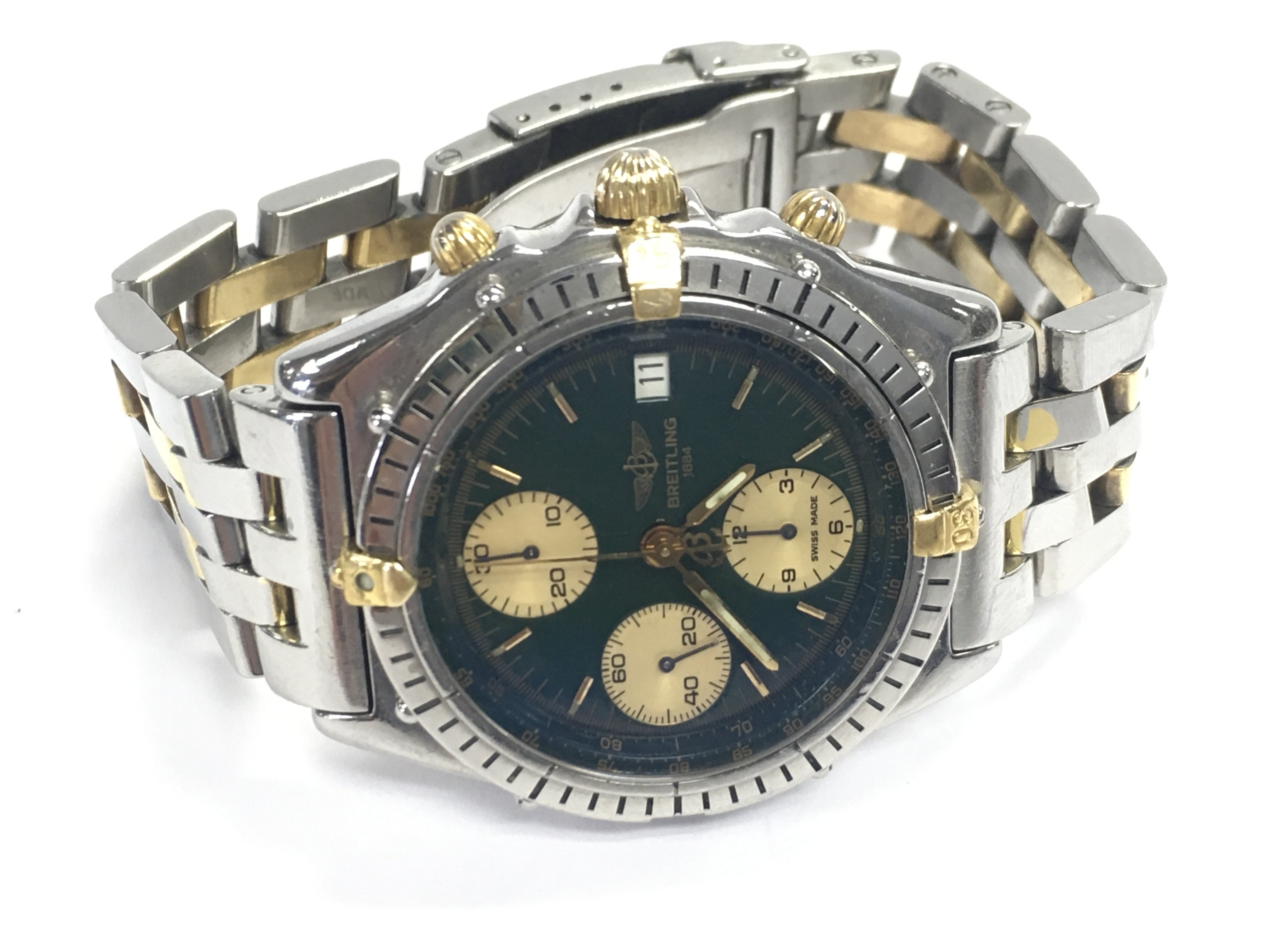 A Breitling chronomat wrist watch with green dial. Case is approximately 40mm excluding crown. Seen running.
