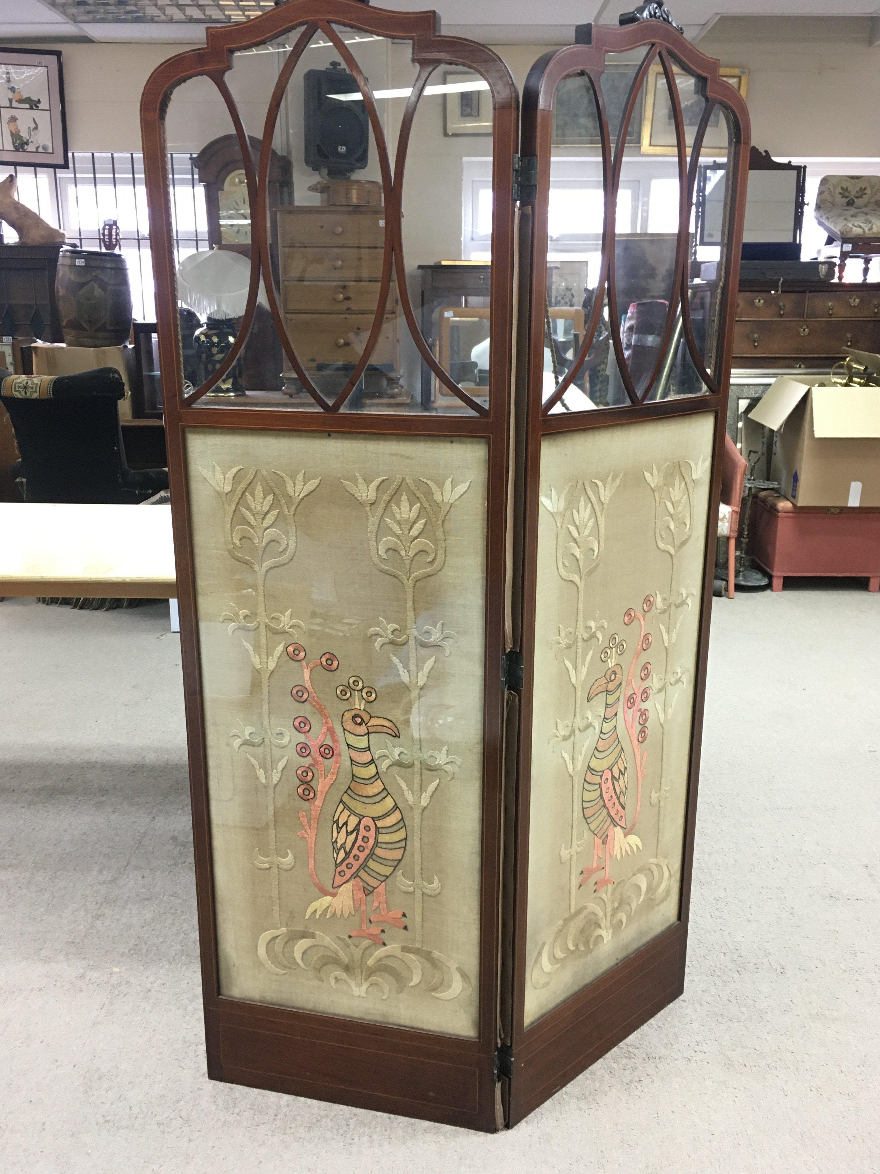 An Edwardian peacock panel mahogany inlaid design screen , 169cm tall approximate this lot cannot be posted