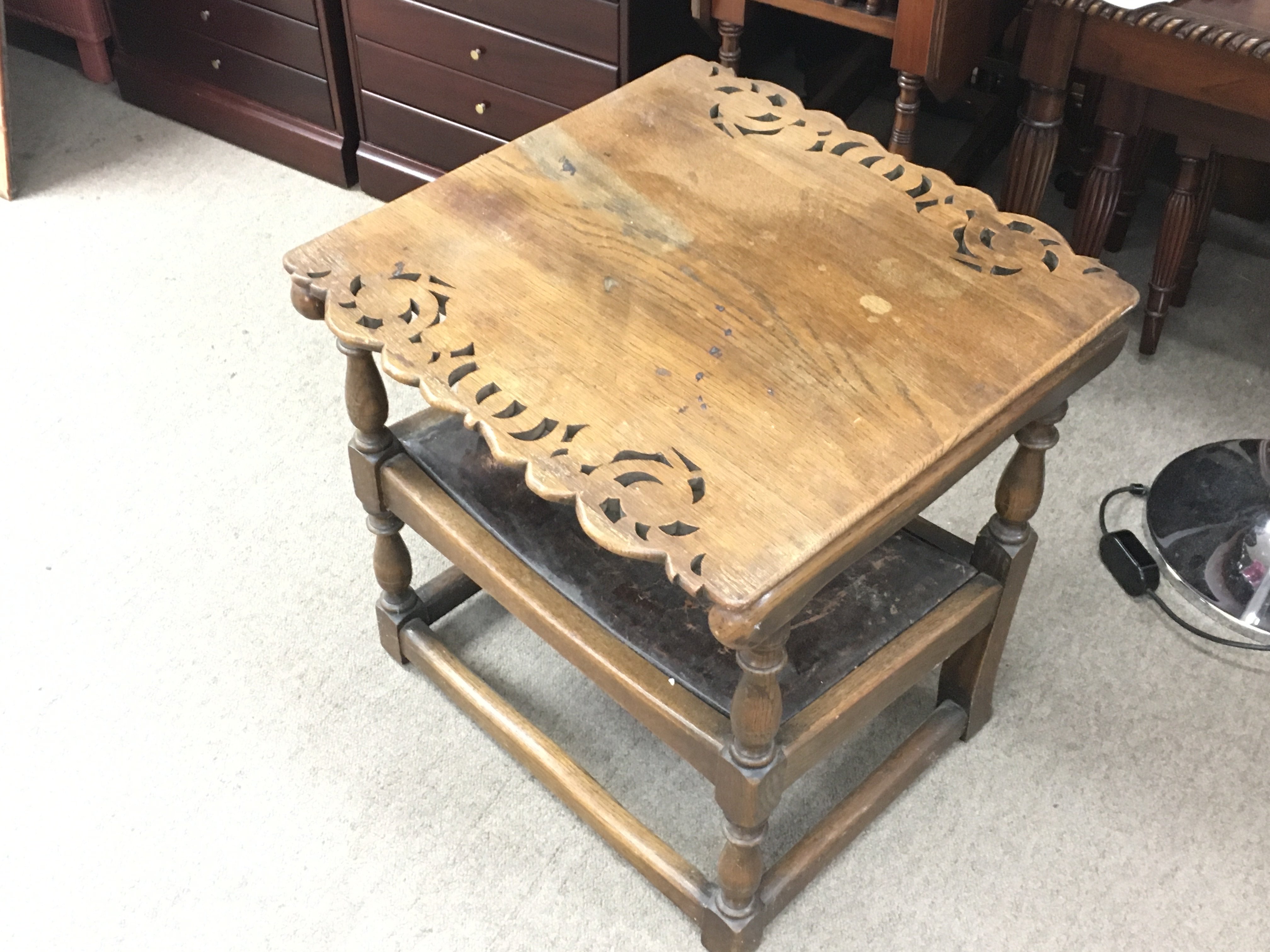 A vintage occasional chair that converts to a table. Approximately 54cm wide and 72cm tall. Postage D