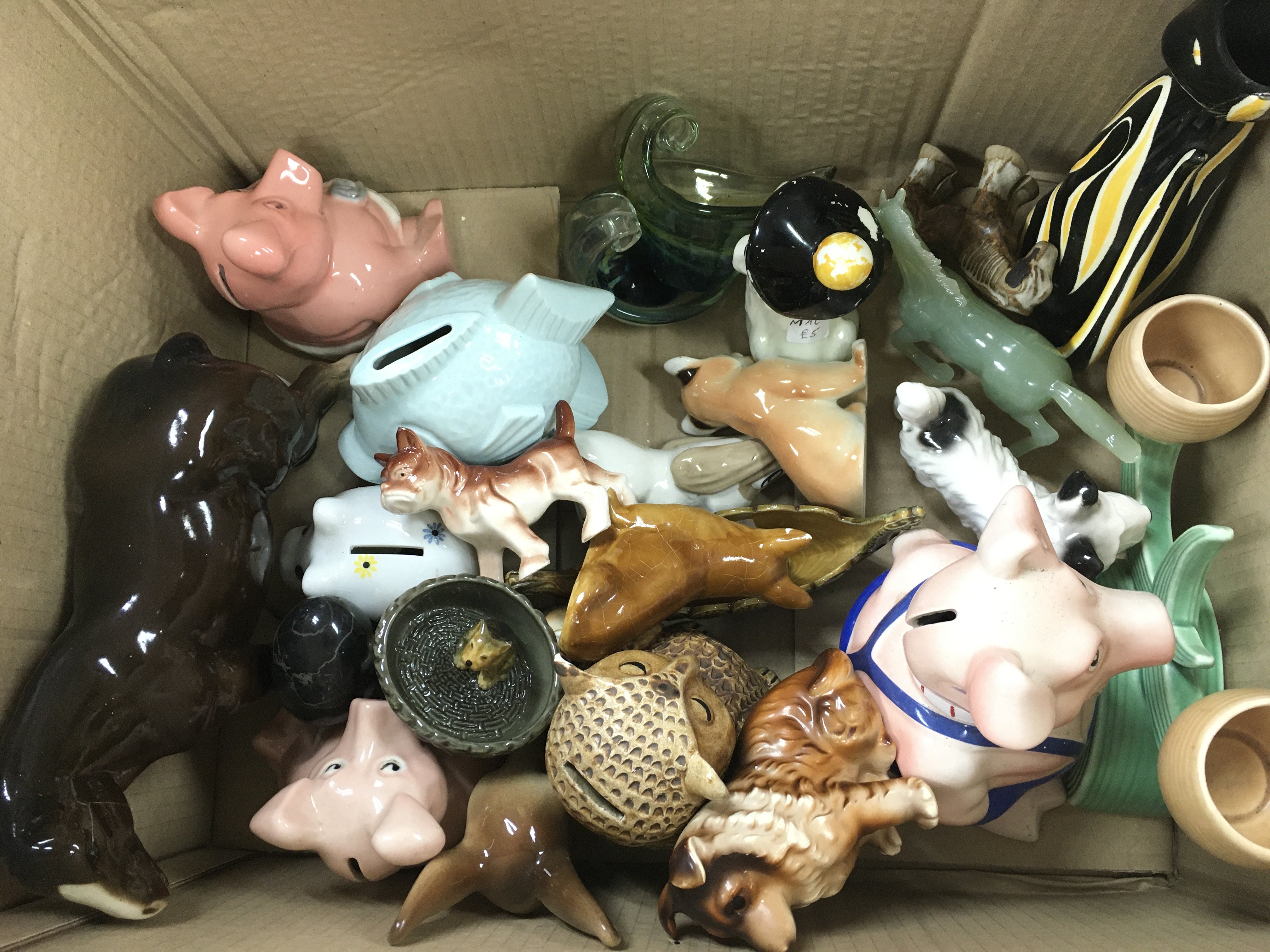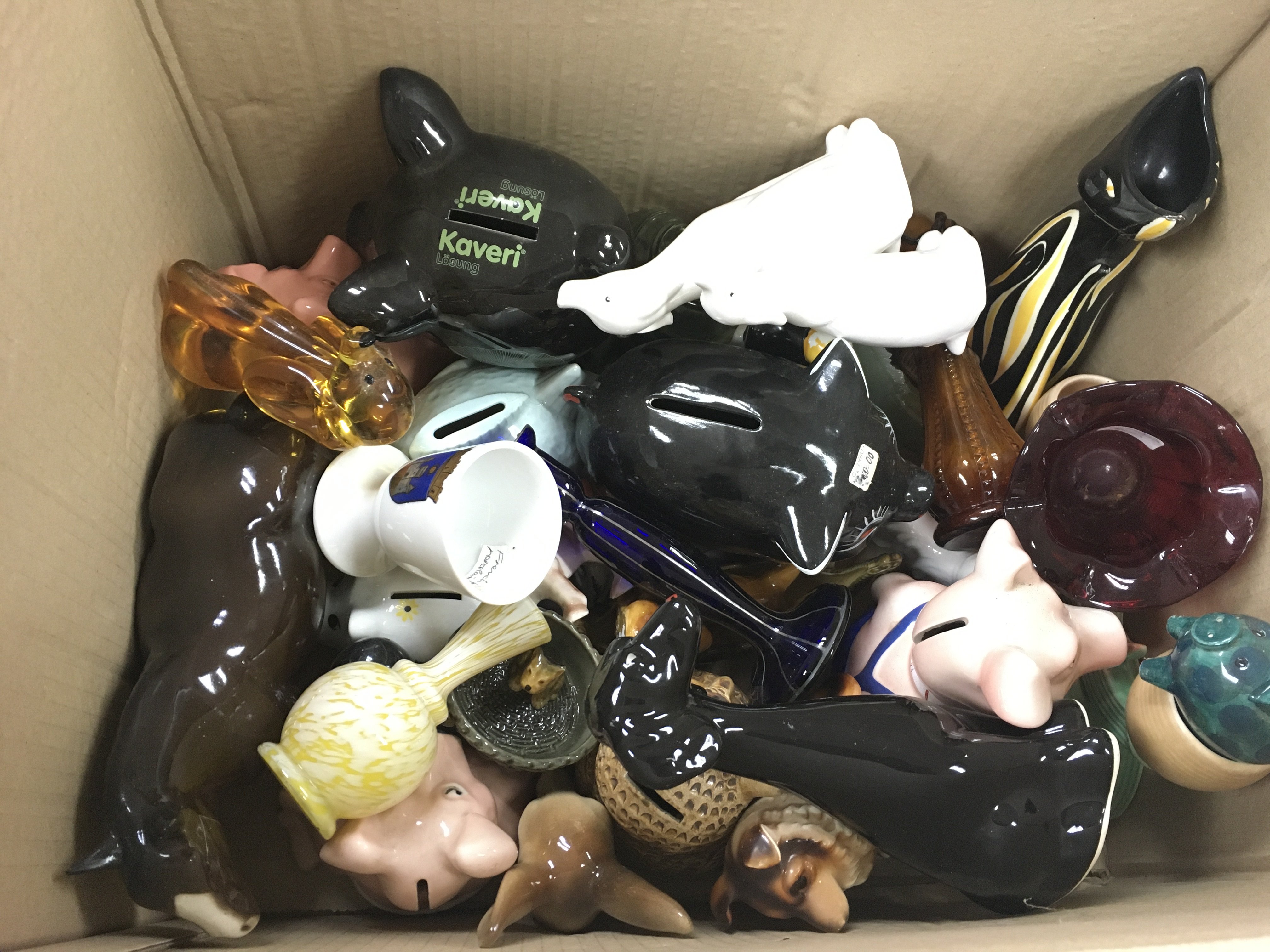 A box of assorted ceramic and glass items including money boxes and a beswick horse. Postage D