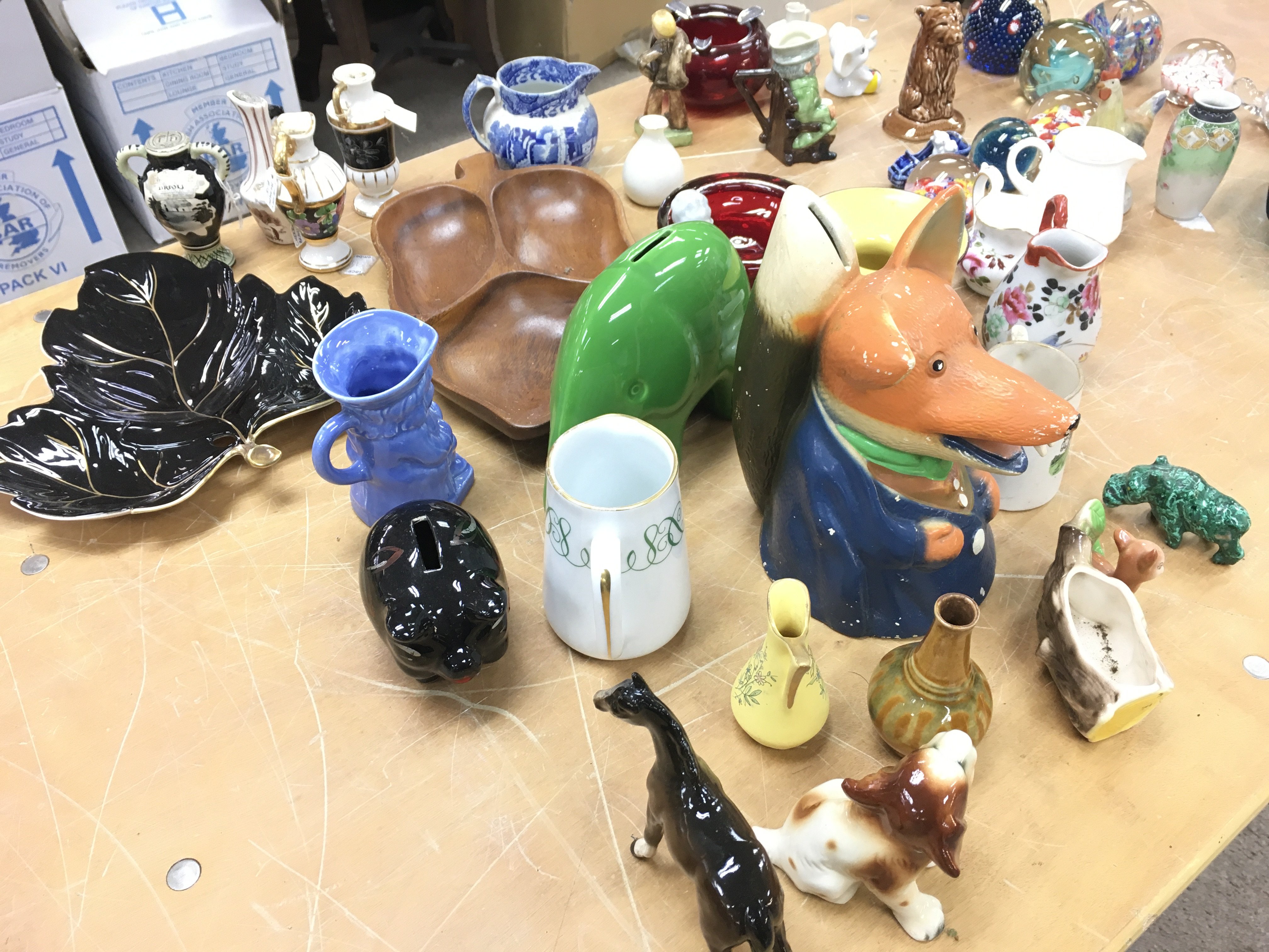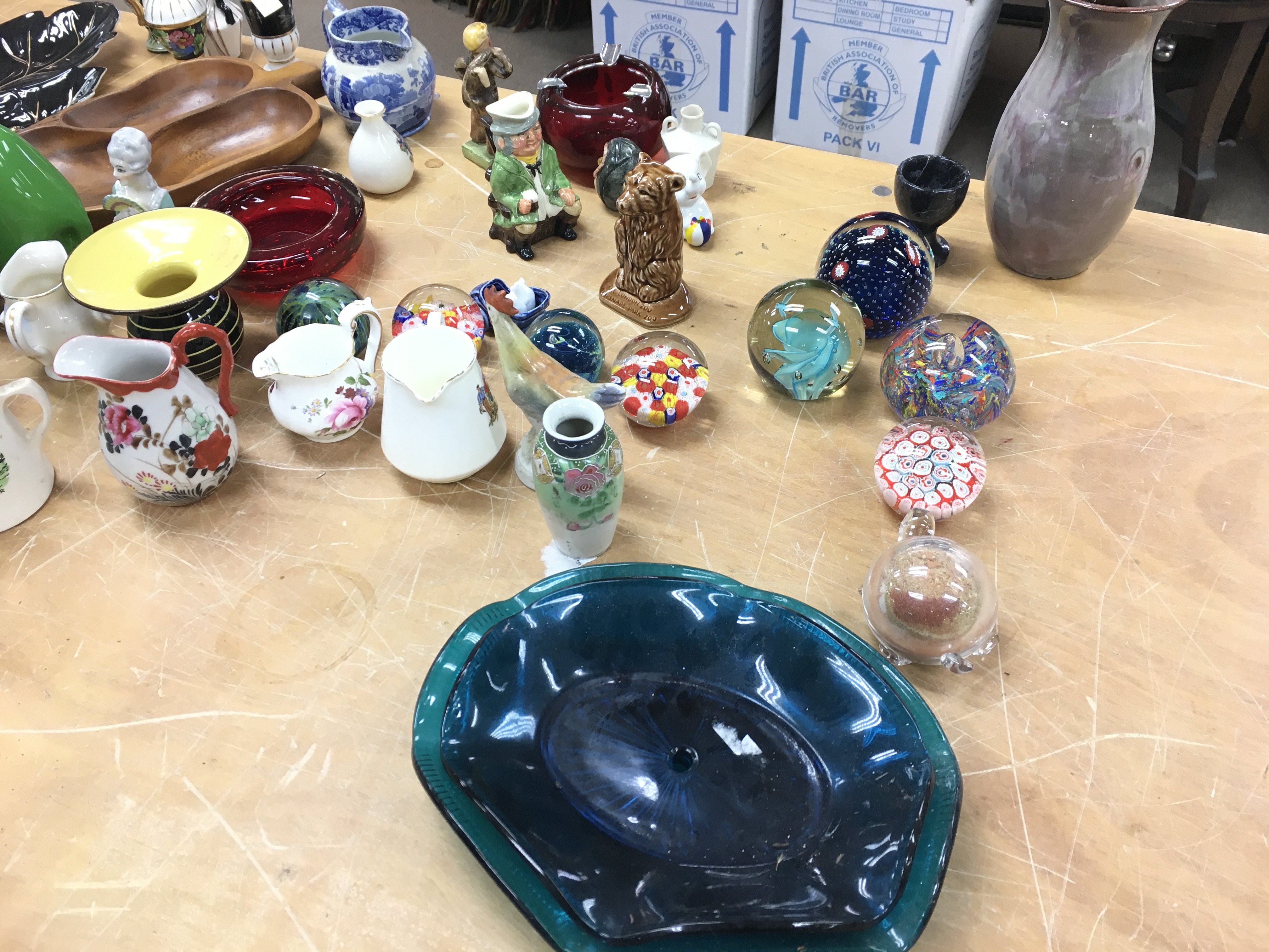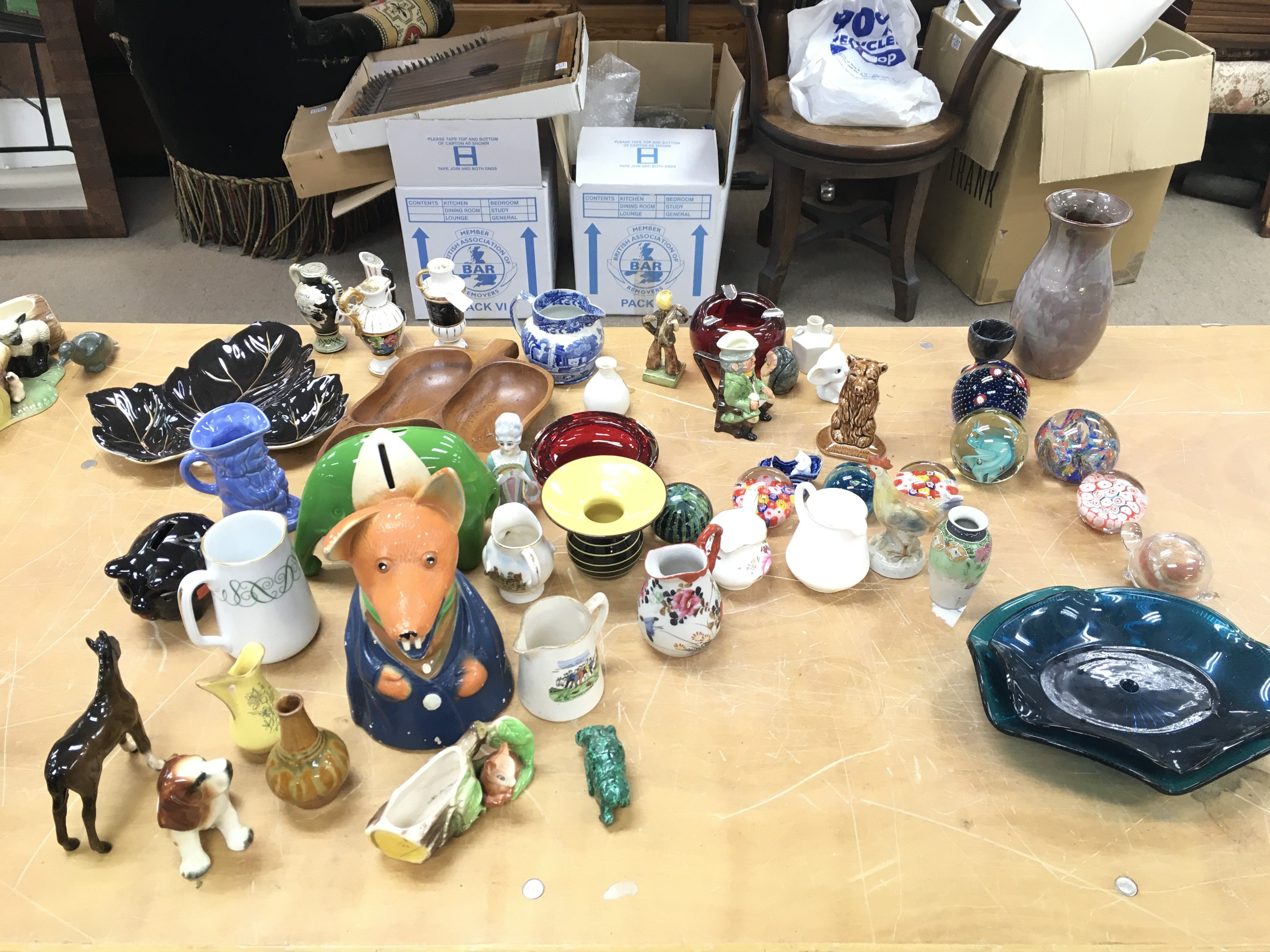 A collection of ceramics and glass ware including paperweights and a beswick horse.