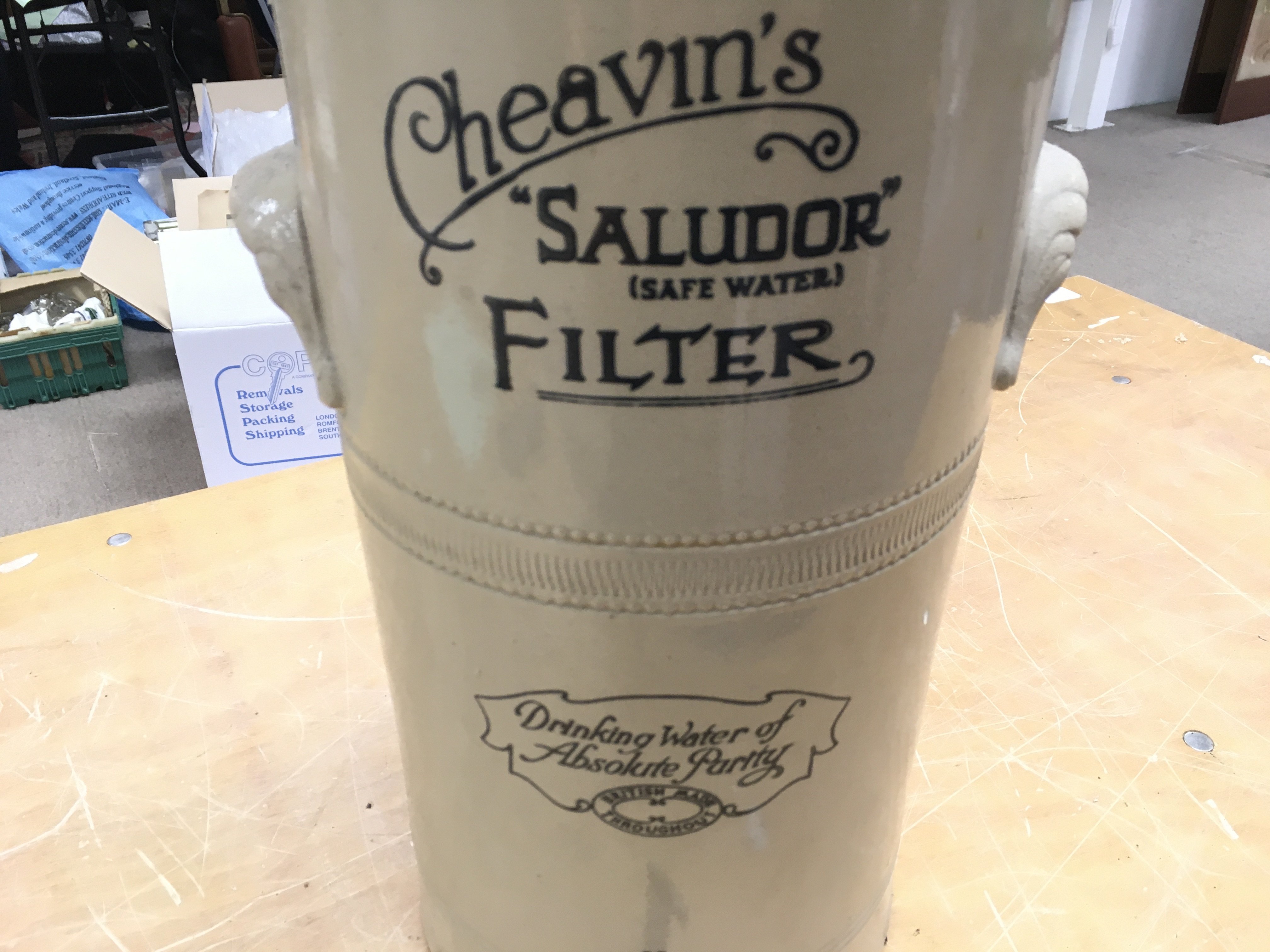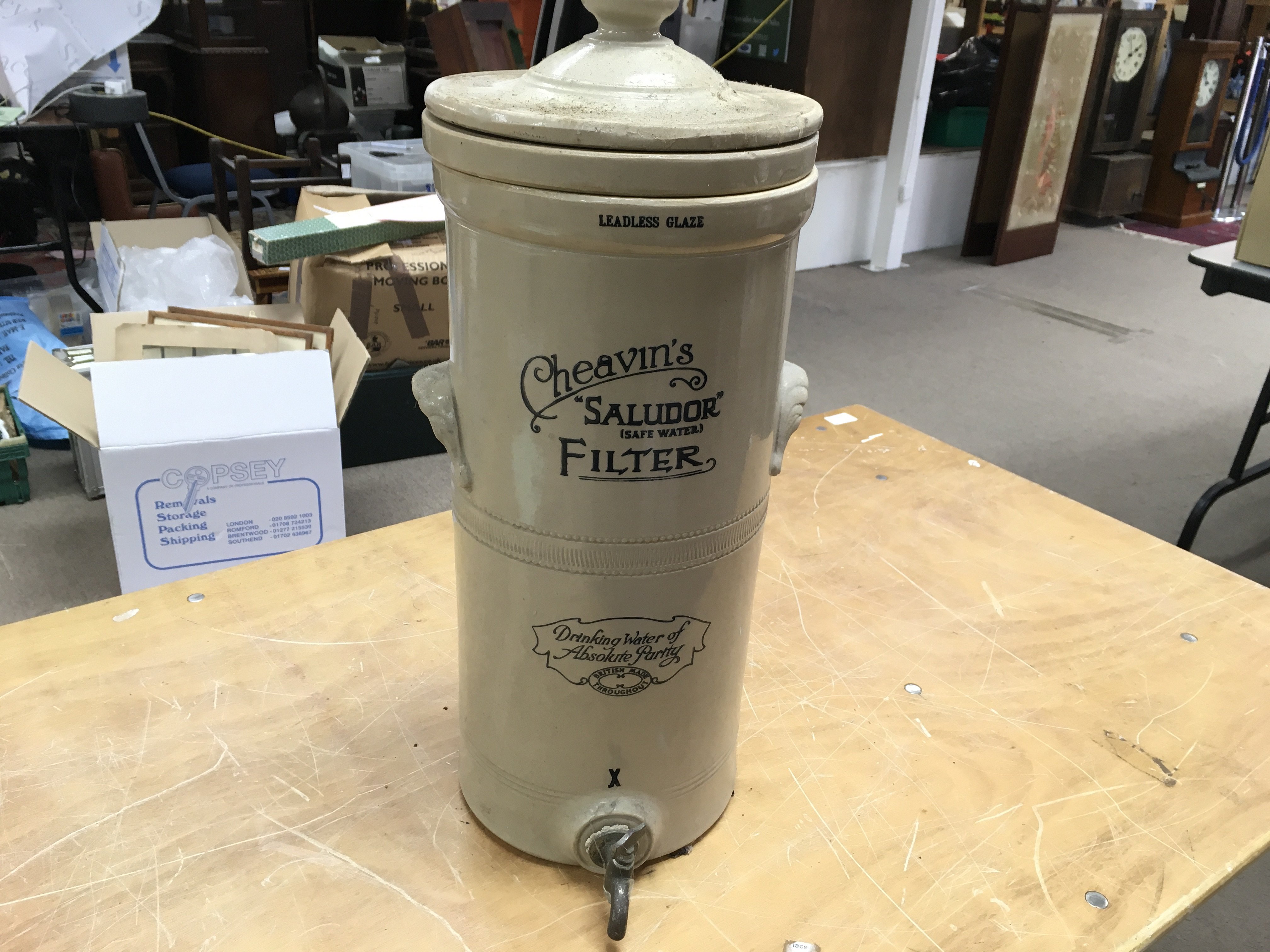A 19th century cheavins saludor stoneware water filter. Approximately 50cm tall.