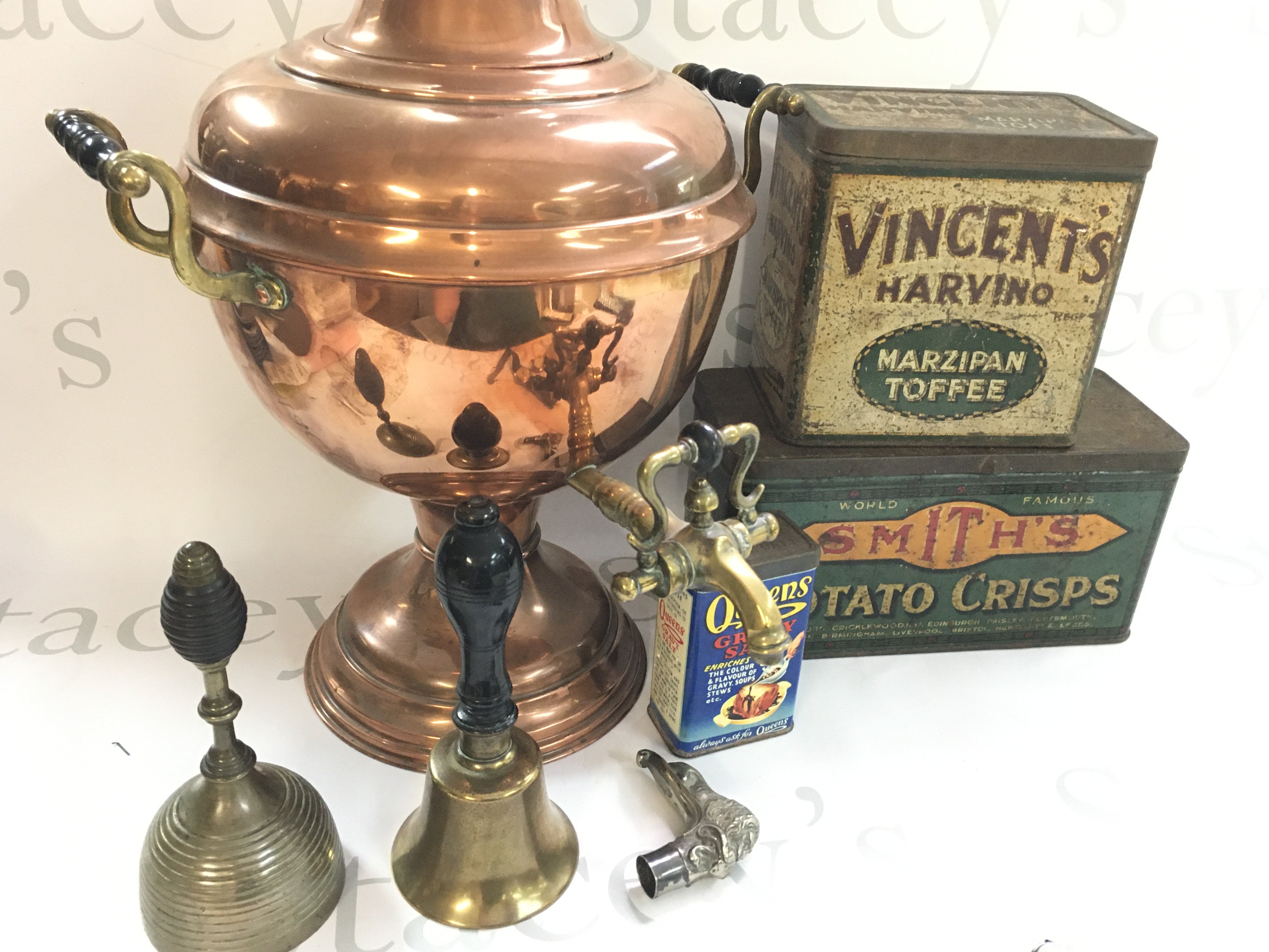 A copper Samovar, vintage tins, bells and a silver plated lion design walking stick topper. Samovar 36cm tall. Postage category C