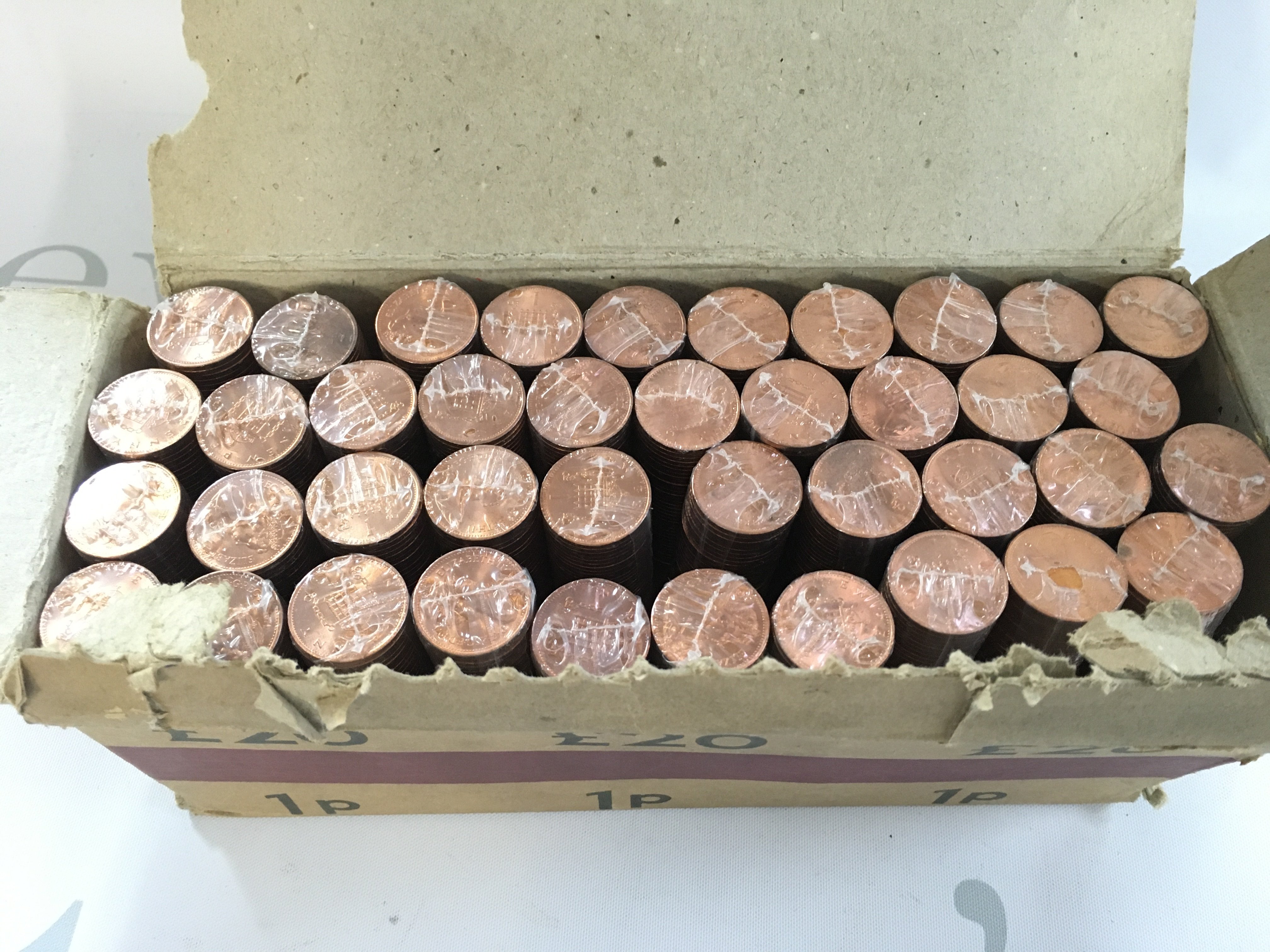 A boxed set of rolled sealed unused 1971 one penny coins. Postage category B