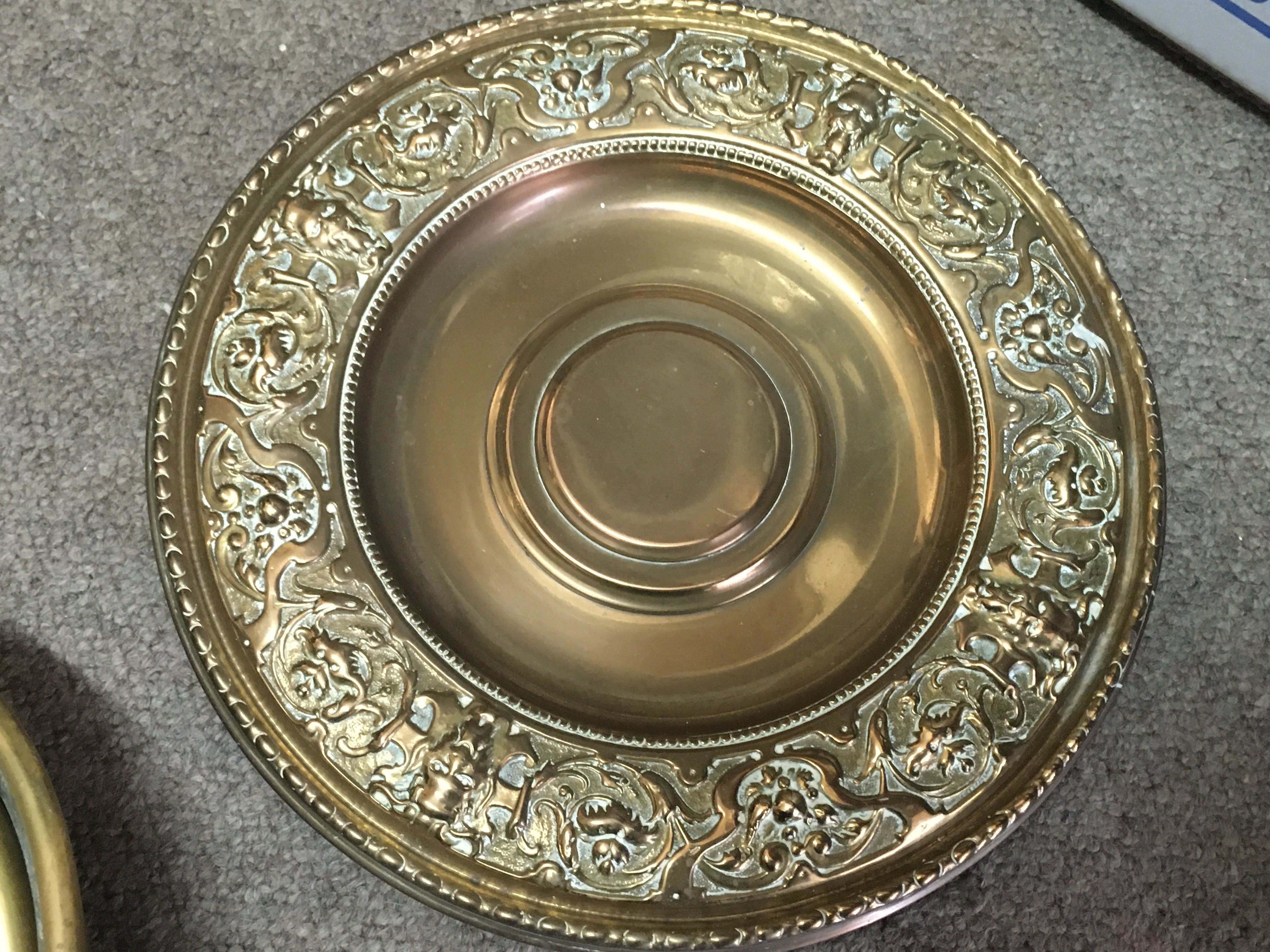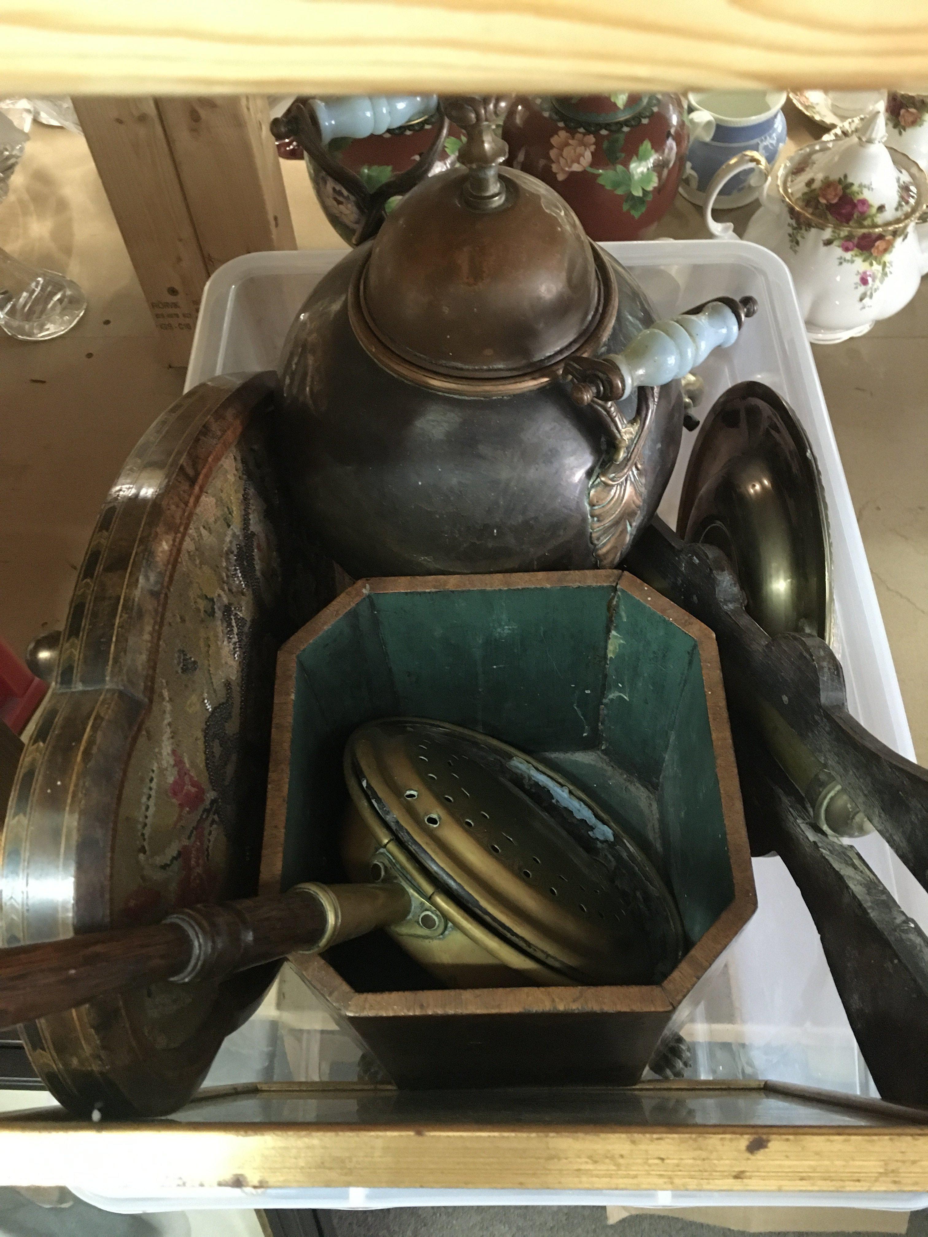 A box of oddments including brass charger, samovar, map, bed pan etc. this lot cannot be posted