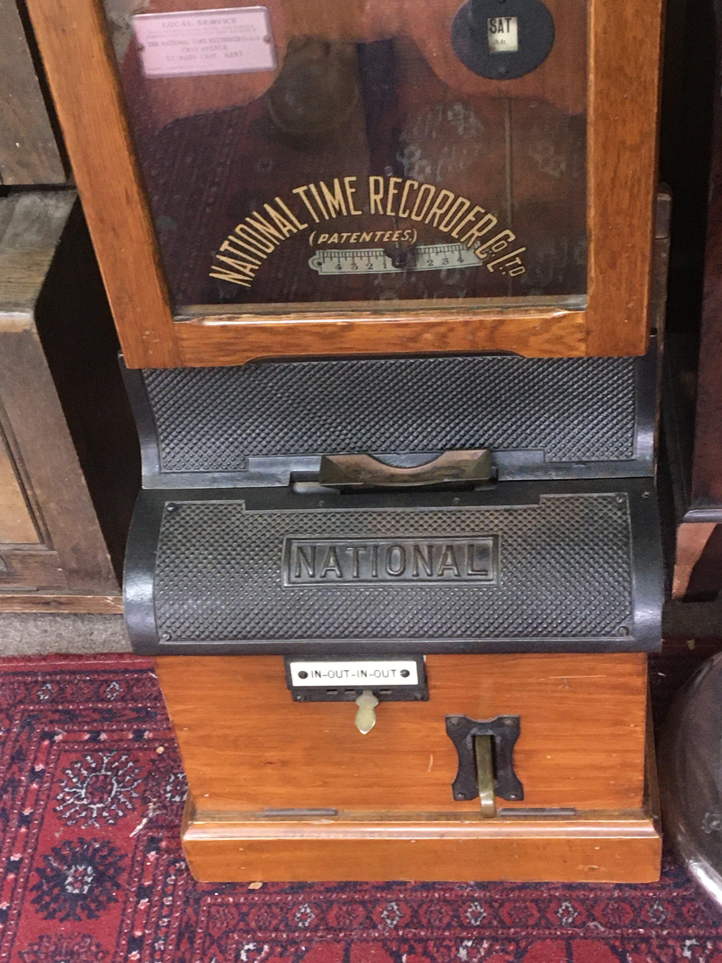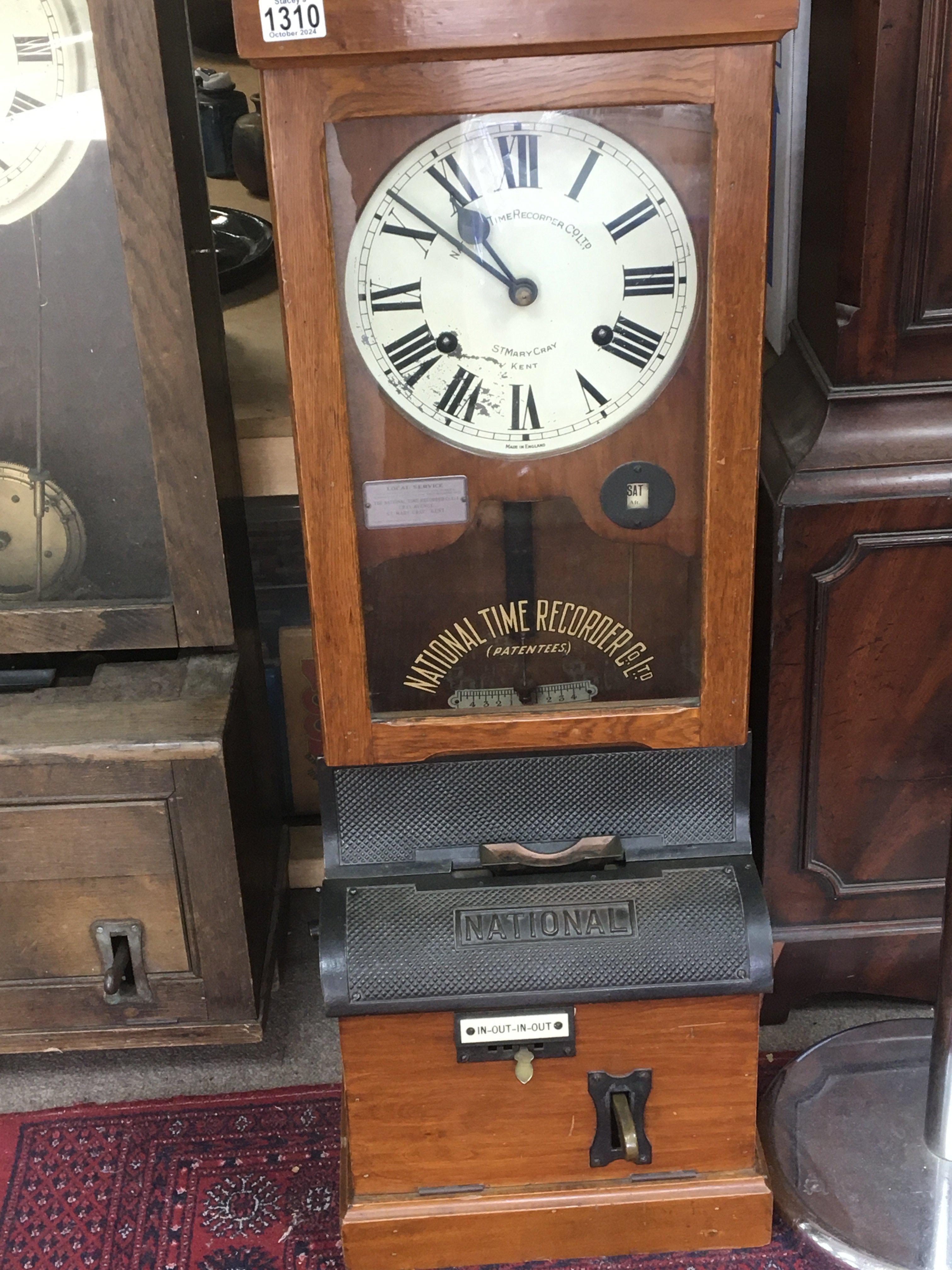 A National Time Record staff clock timing system in good condition with a metal mounted wood case St Mary Cray on the dial.