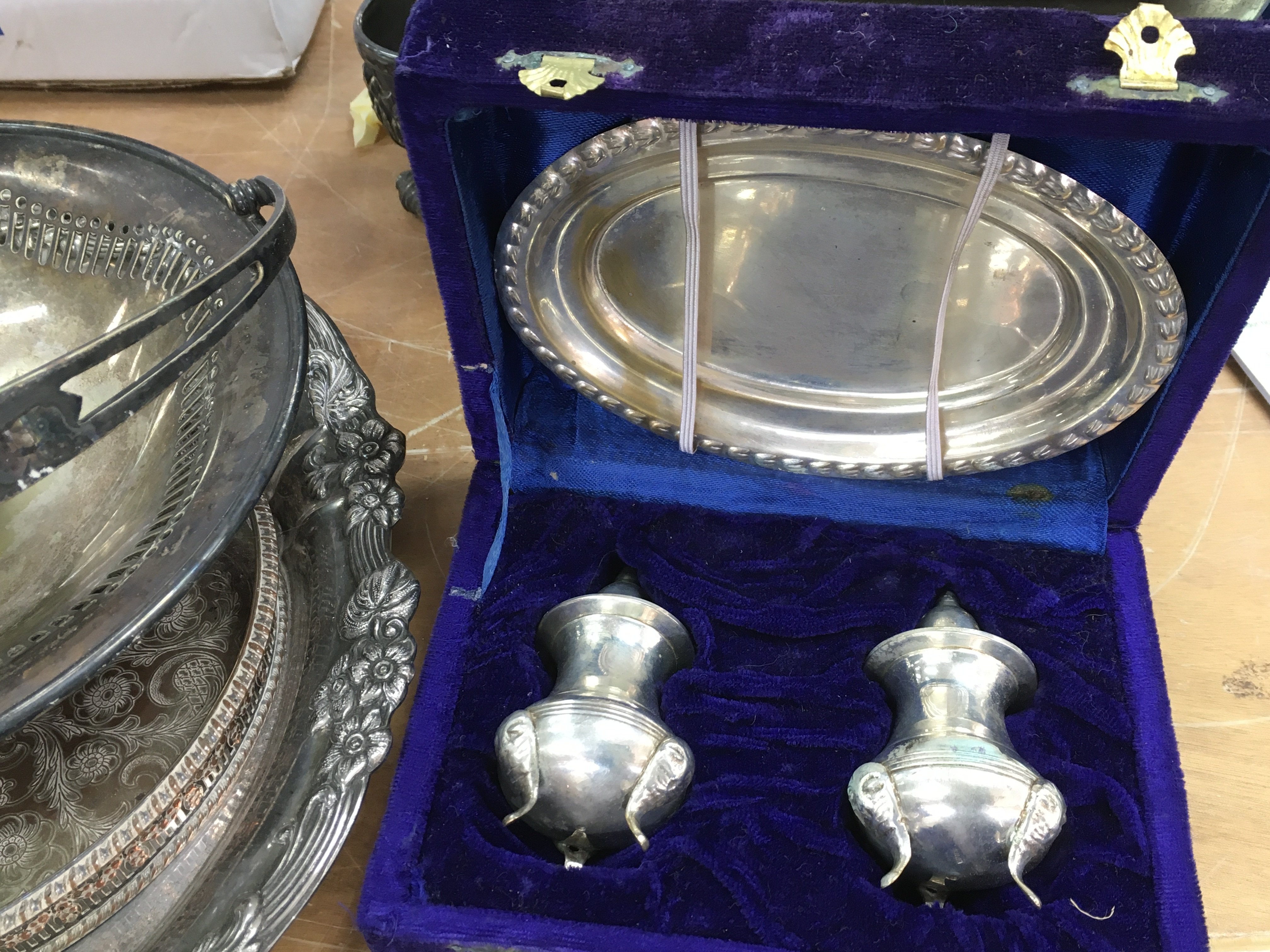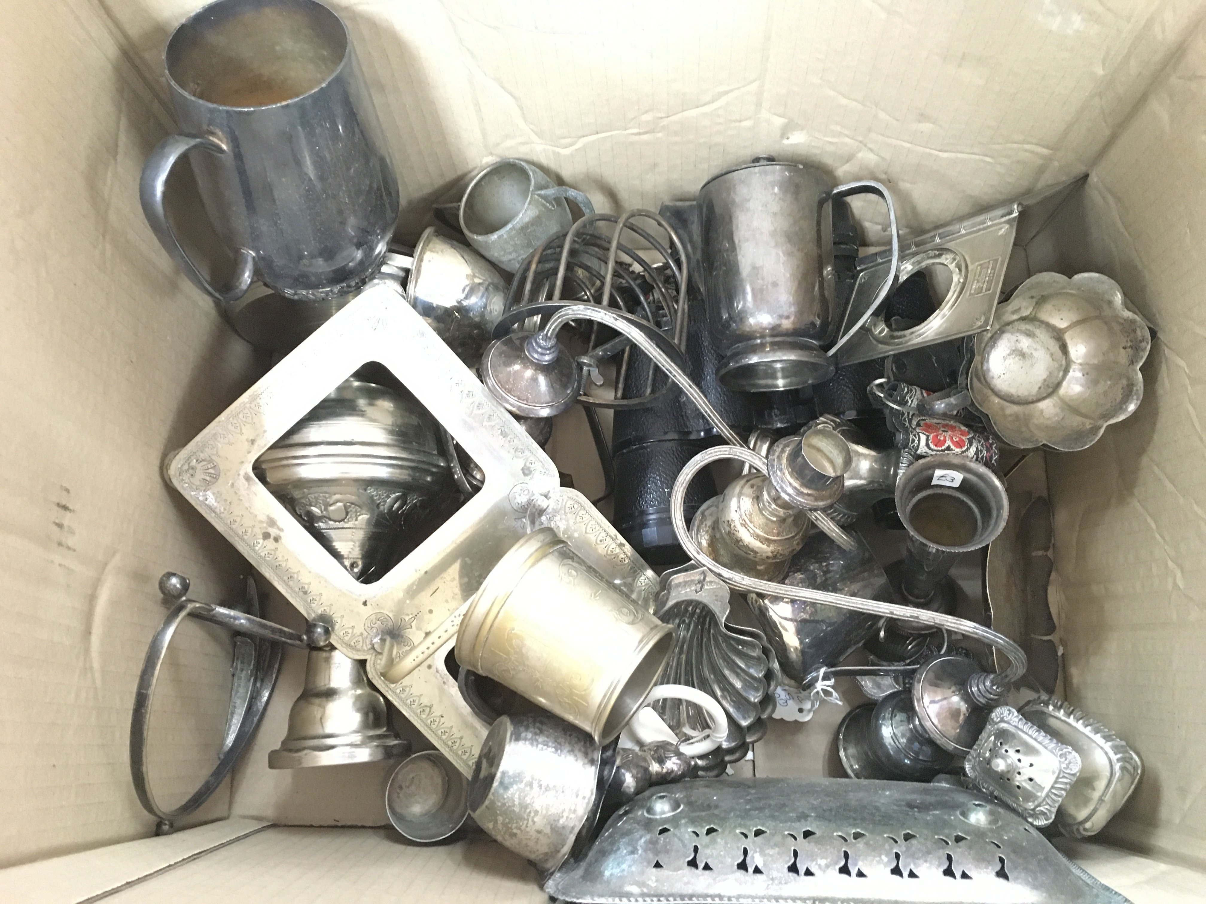 A large box of assorted silver plate and other metal items.