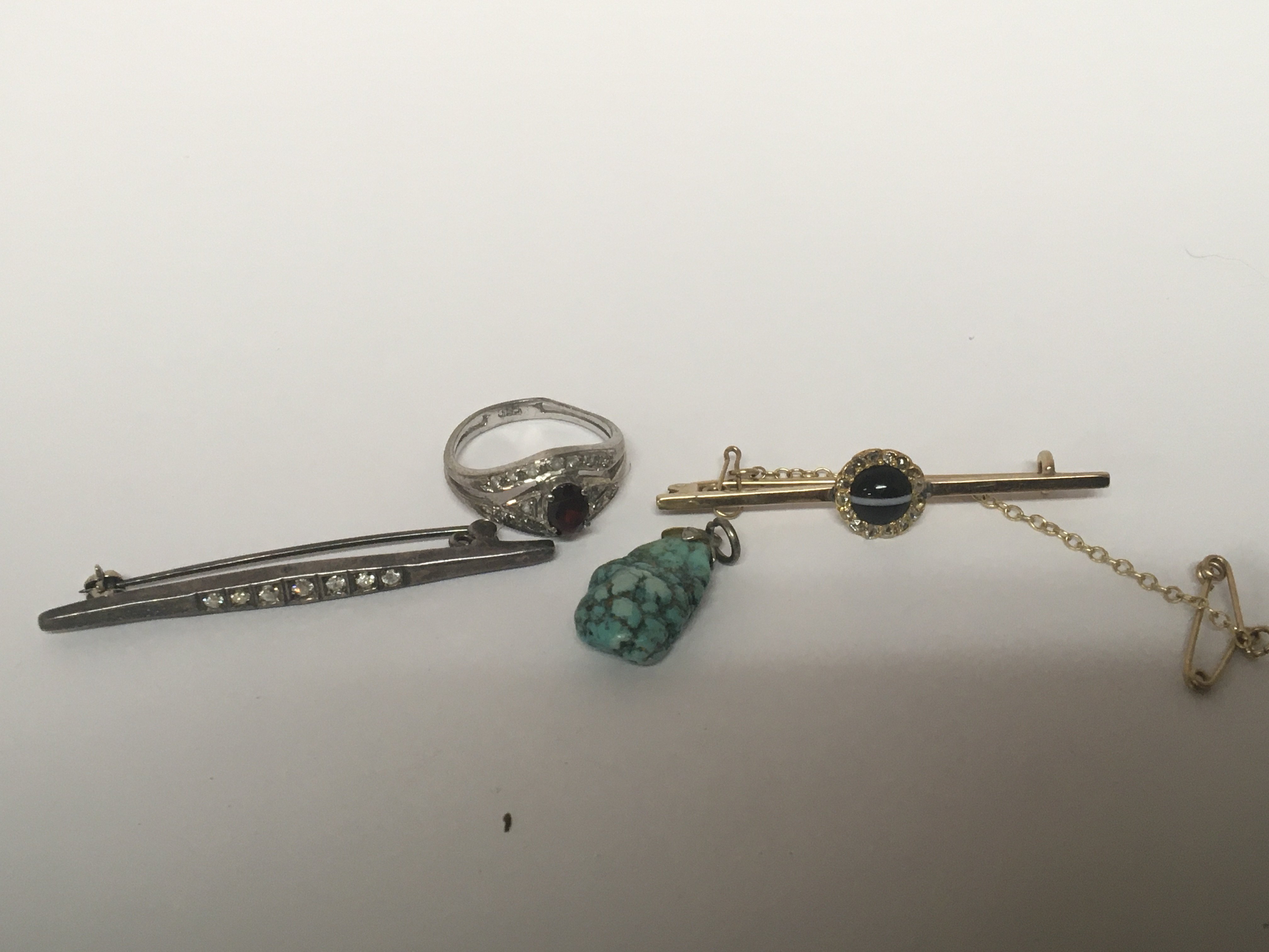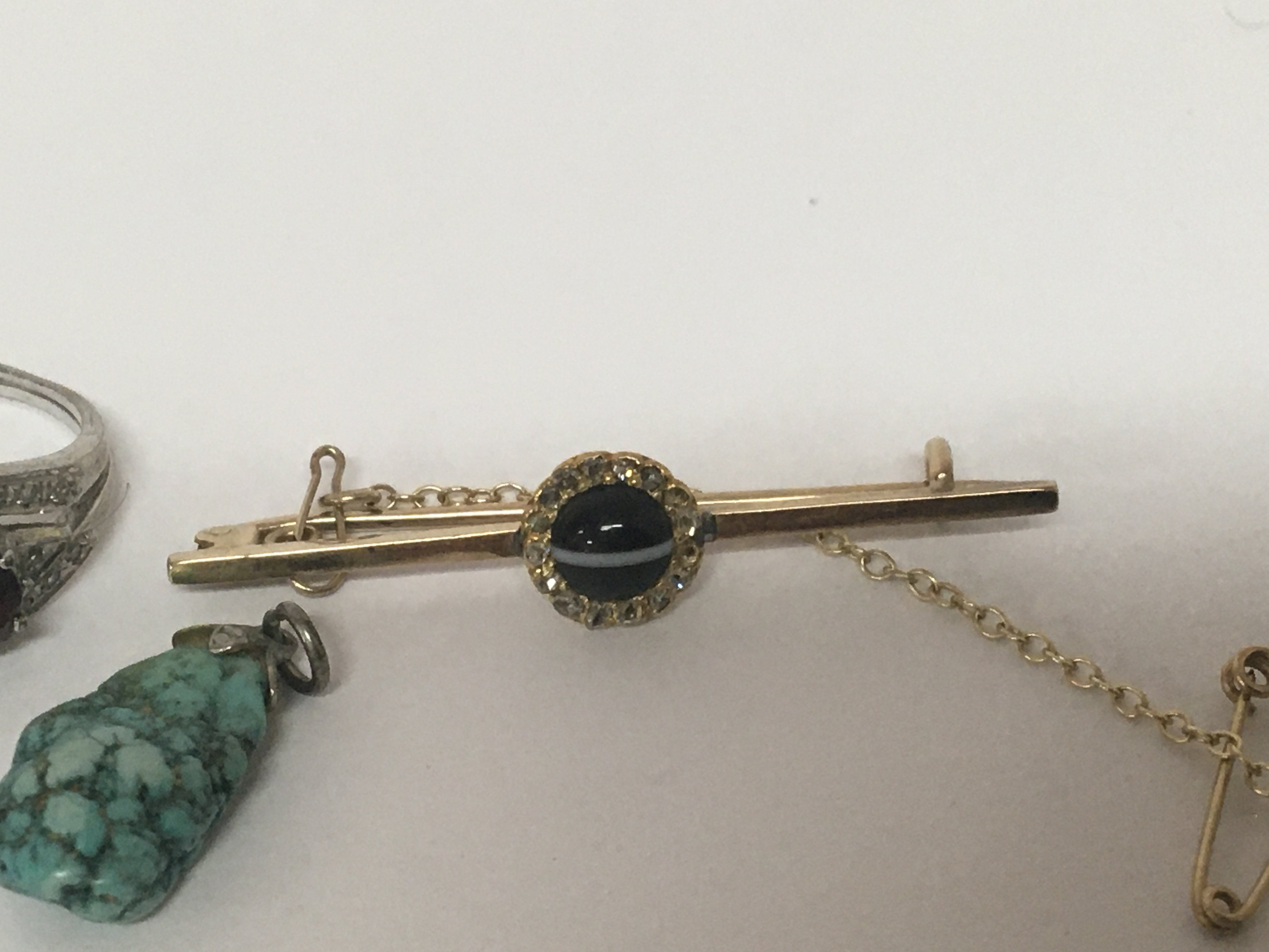 An unmarked gold bar brooch set with a striped polished cabochon stone and chip diamonds. a silver ring small pendent and bar brooch.
