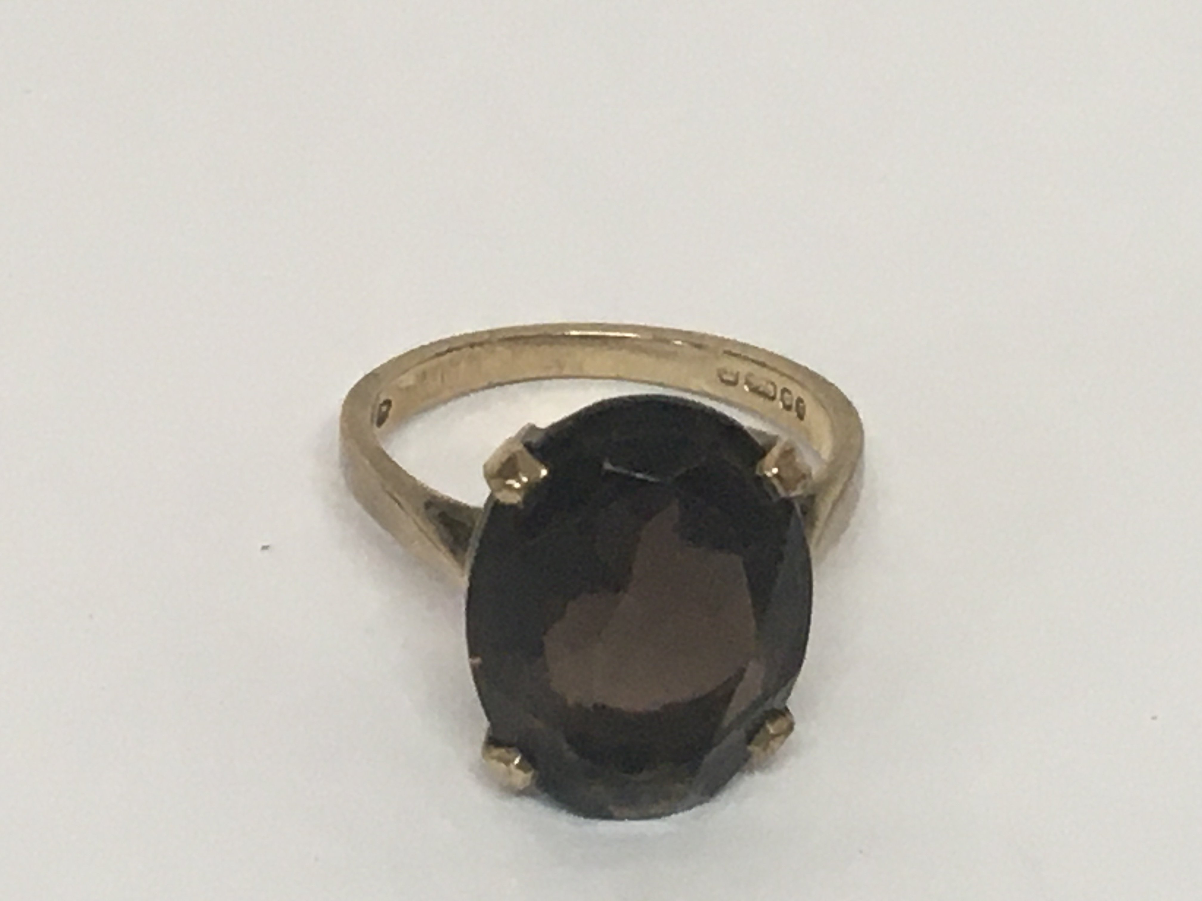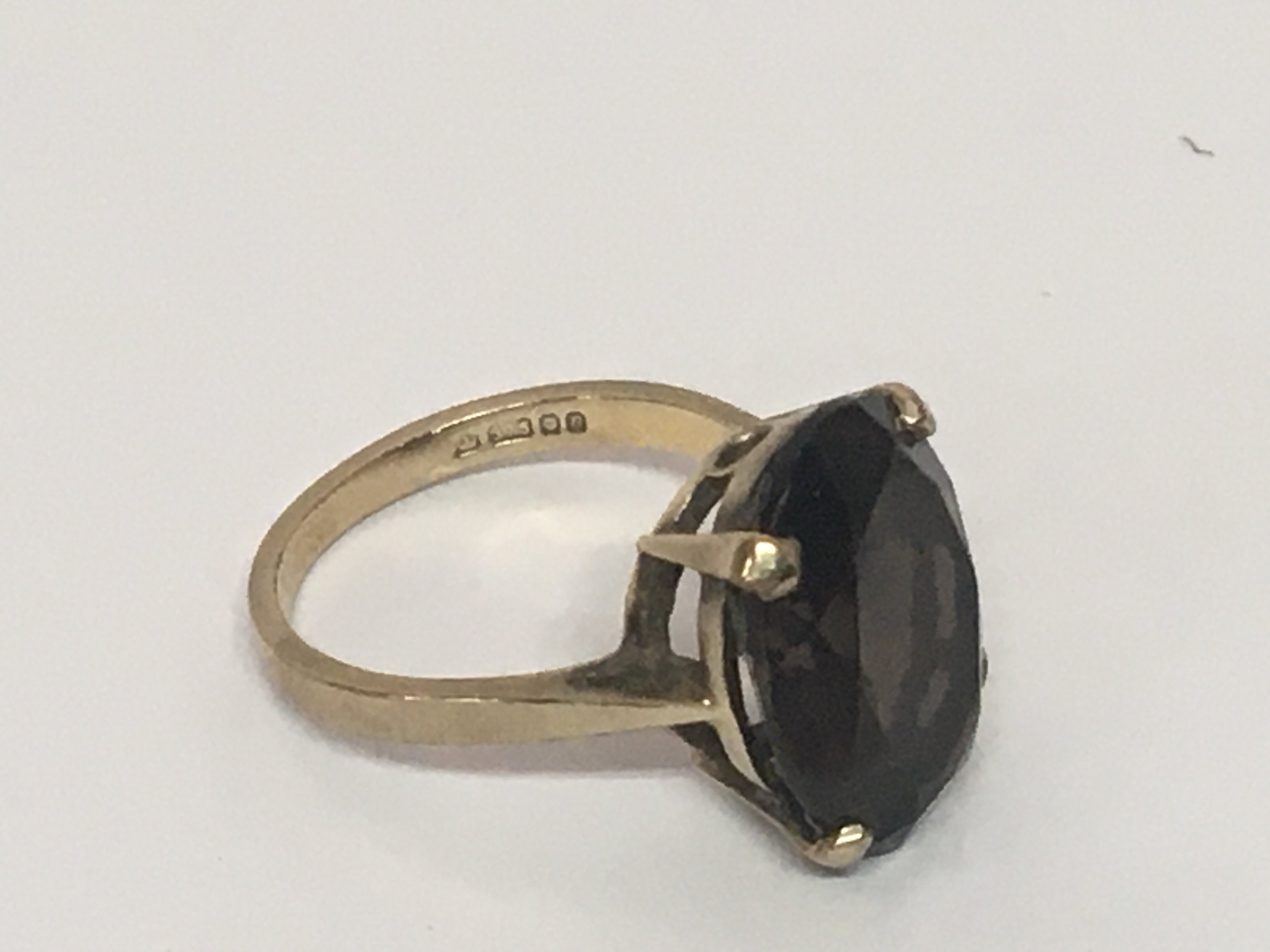 A 9carat gold ring set with a good size cut smoked Quartz. Ring size N weight 4g