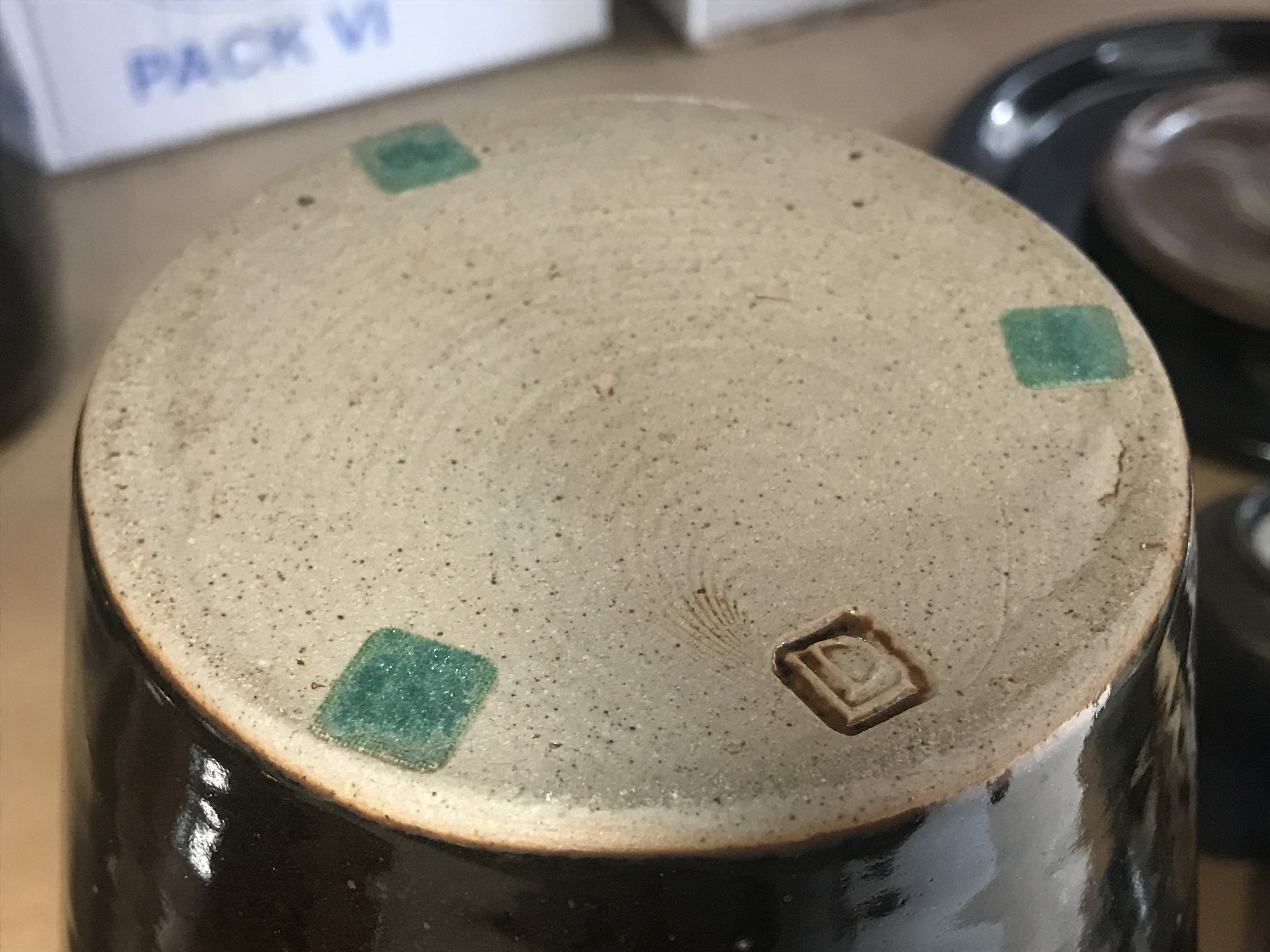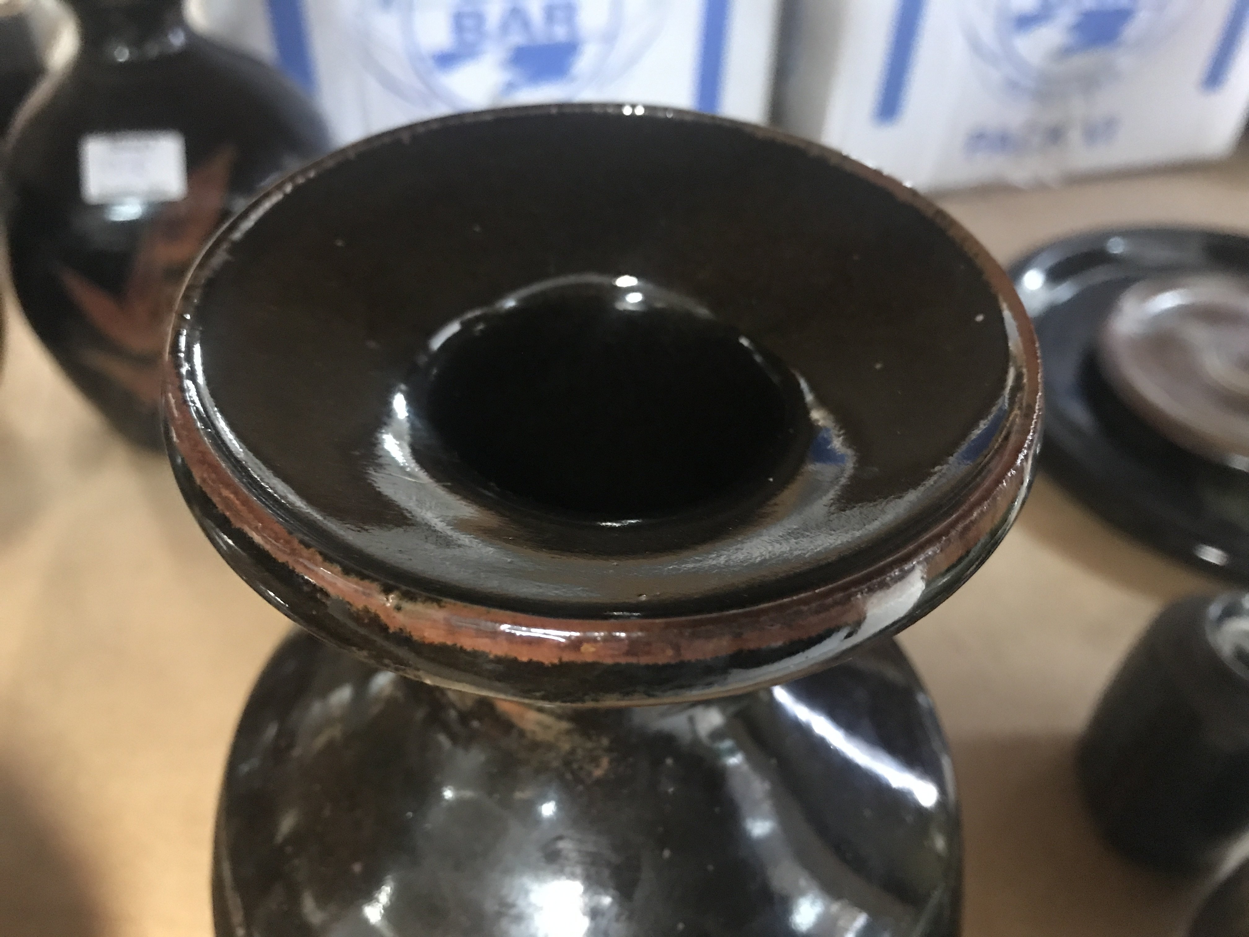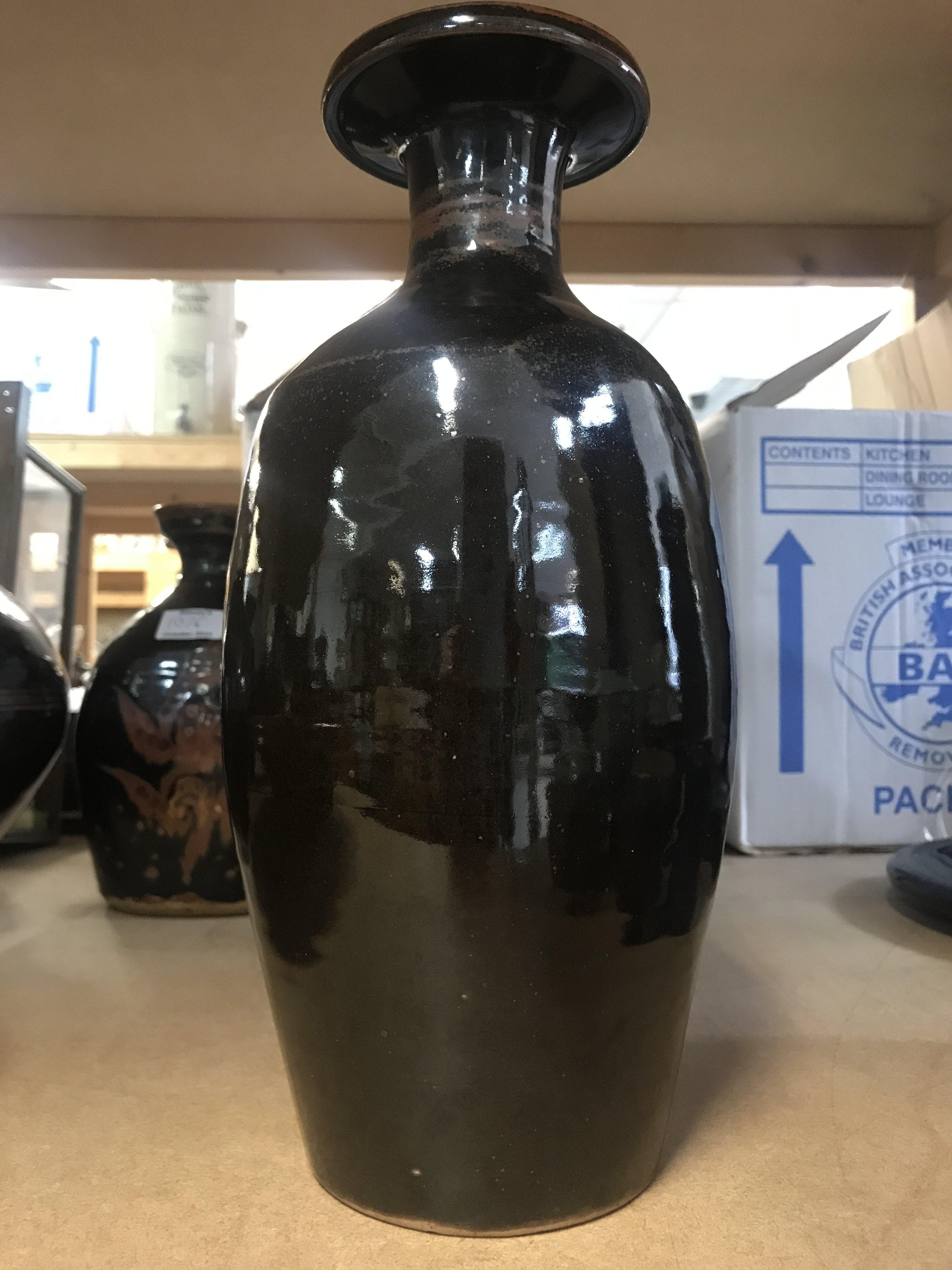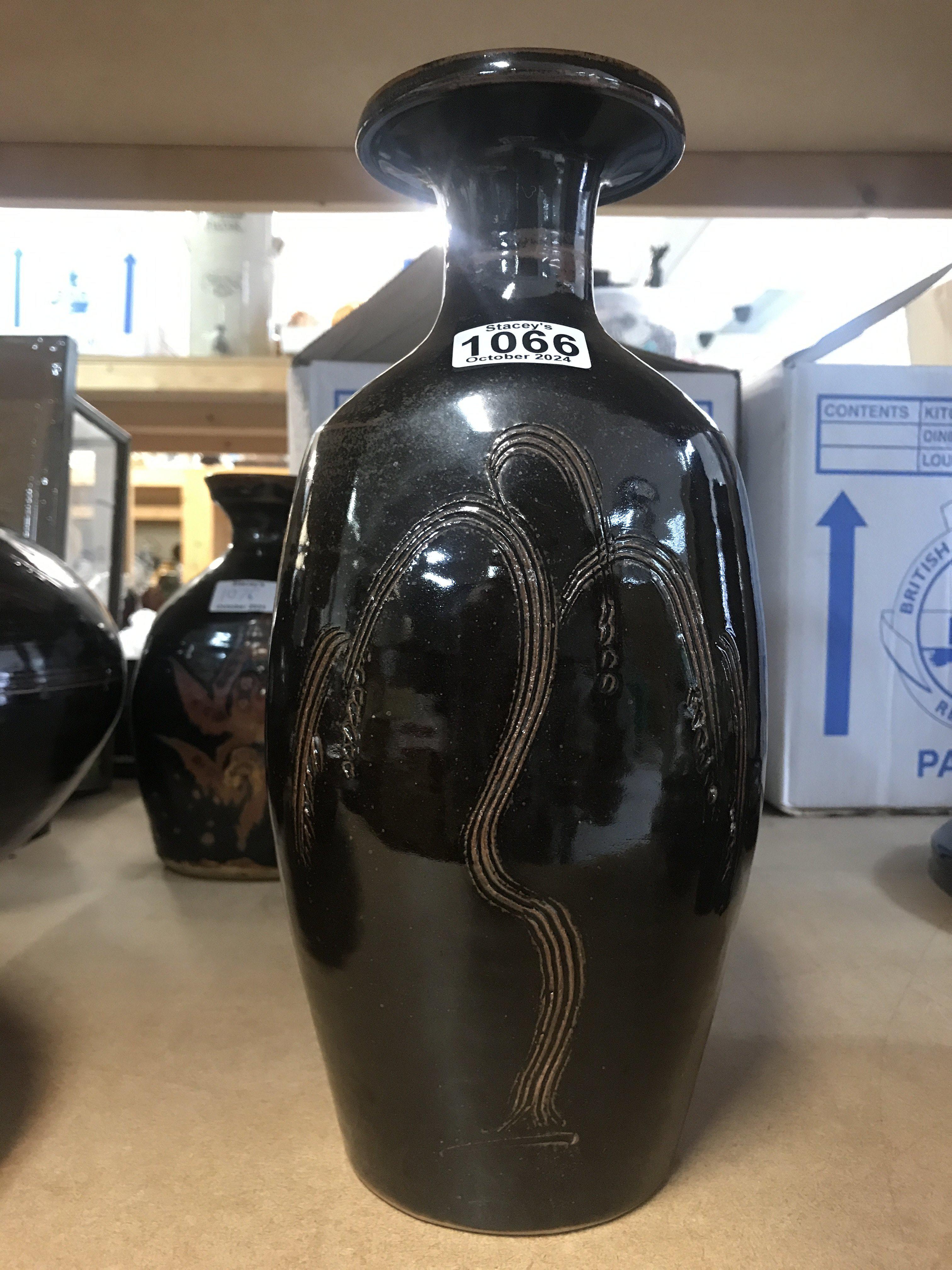 A David Leach Stoneware vase. Resist decorated in Tenmoku glaze. 32cm height