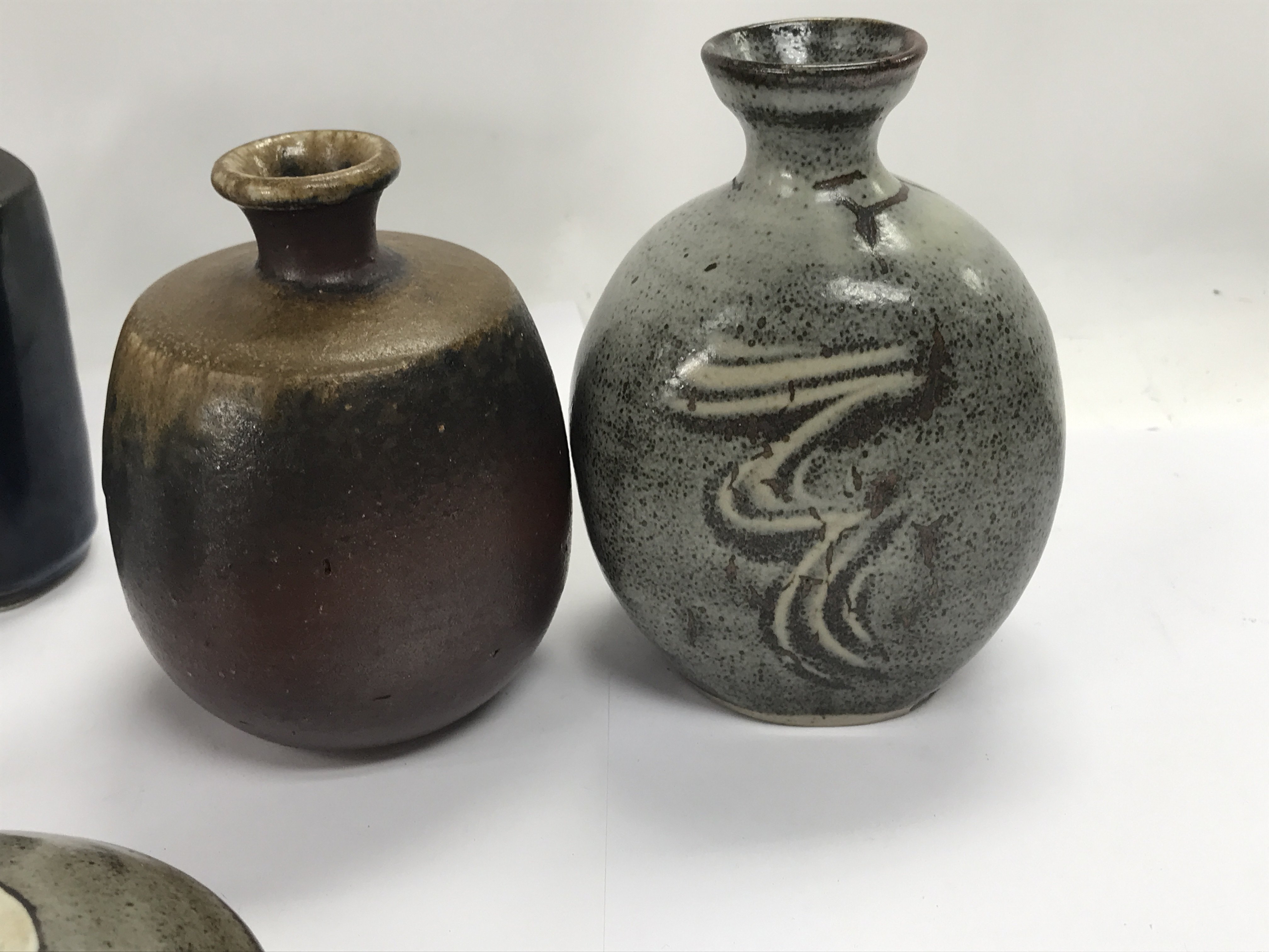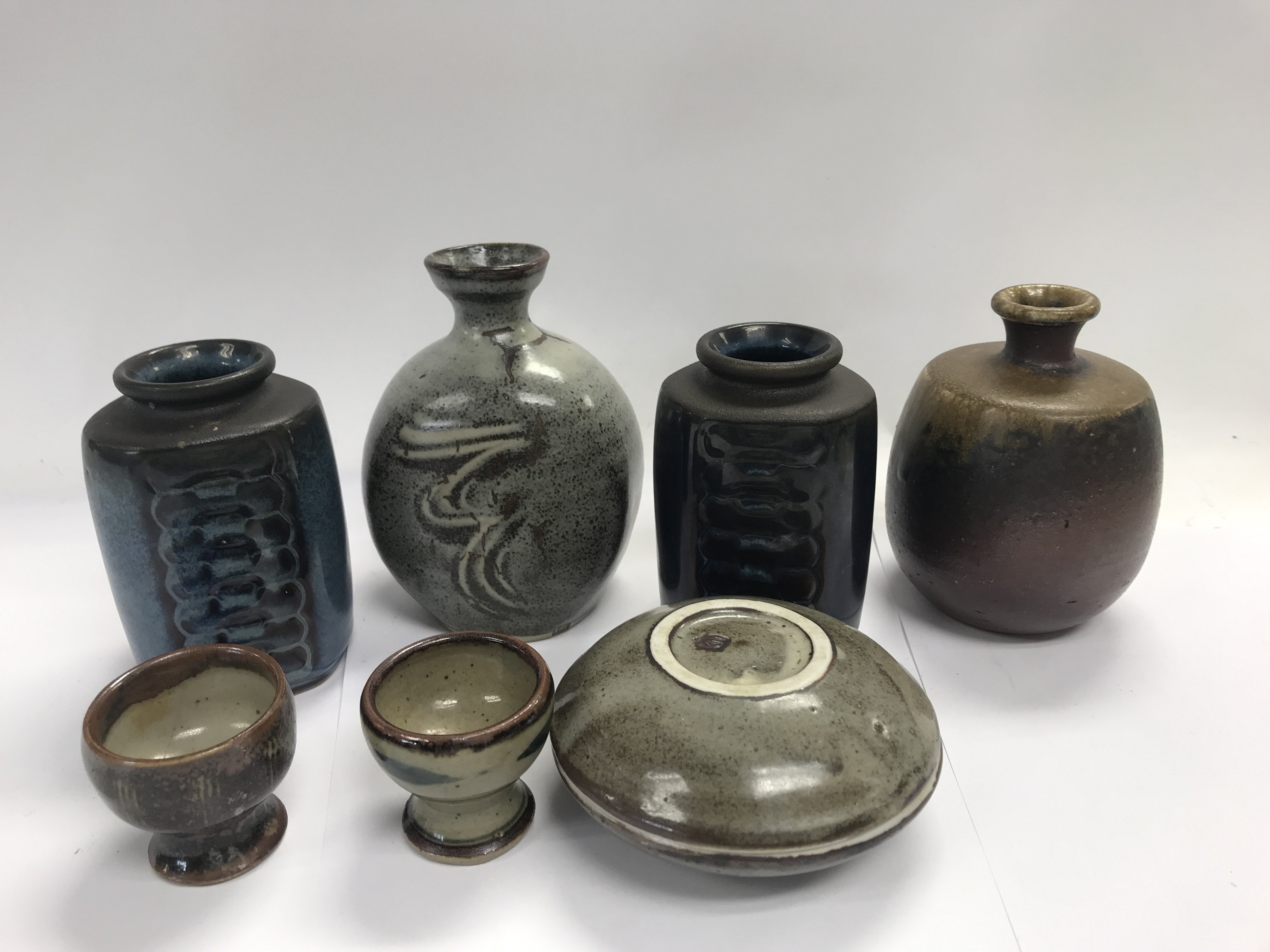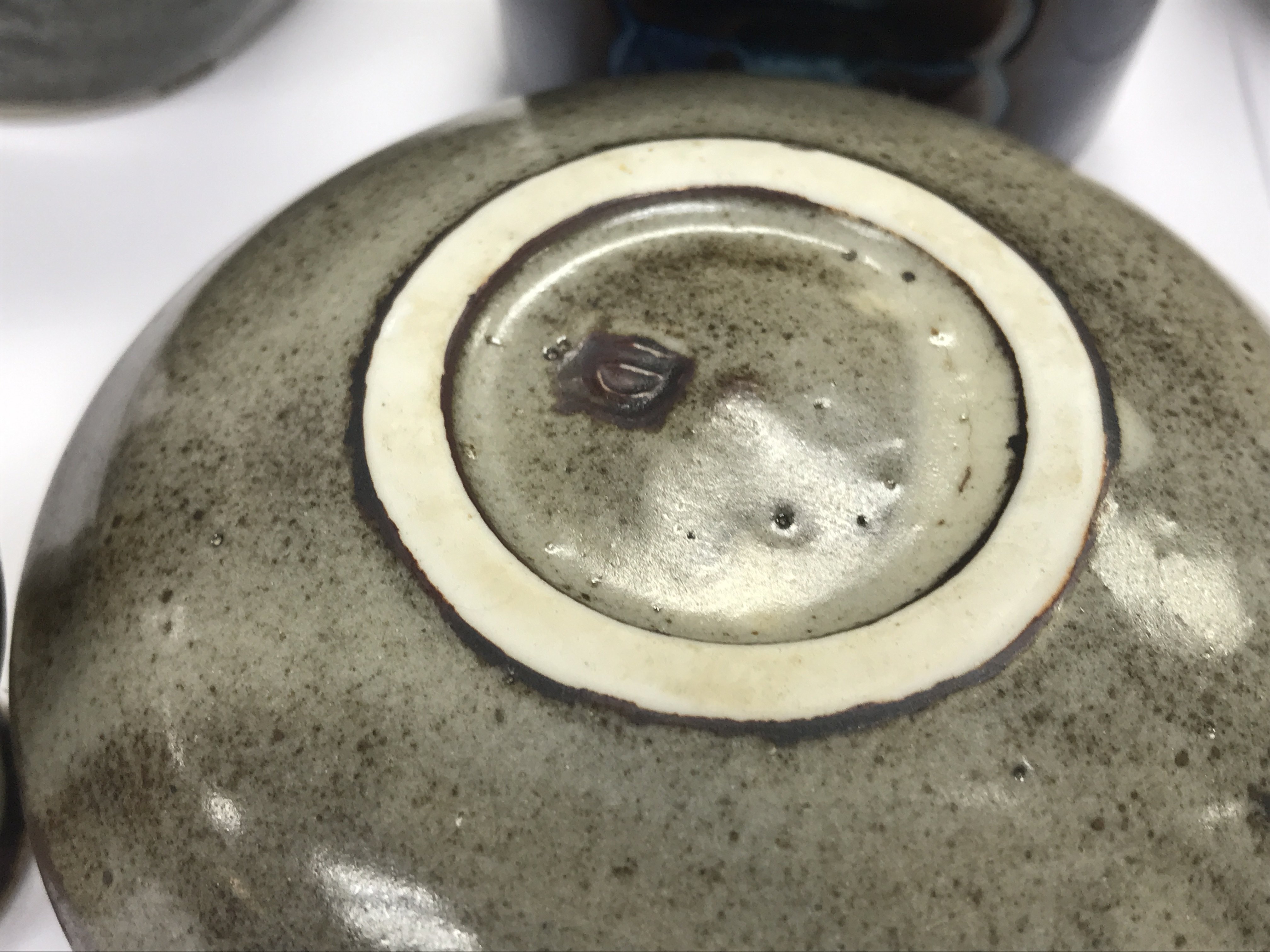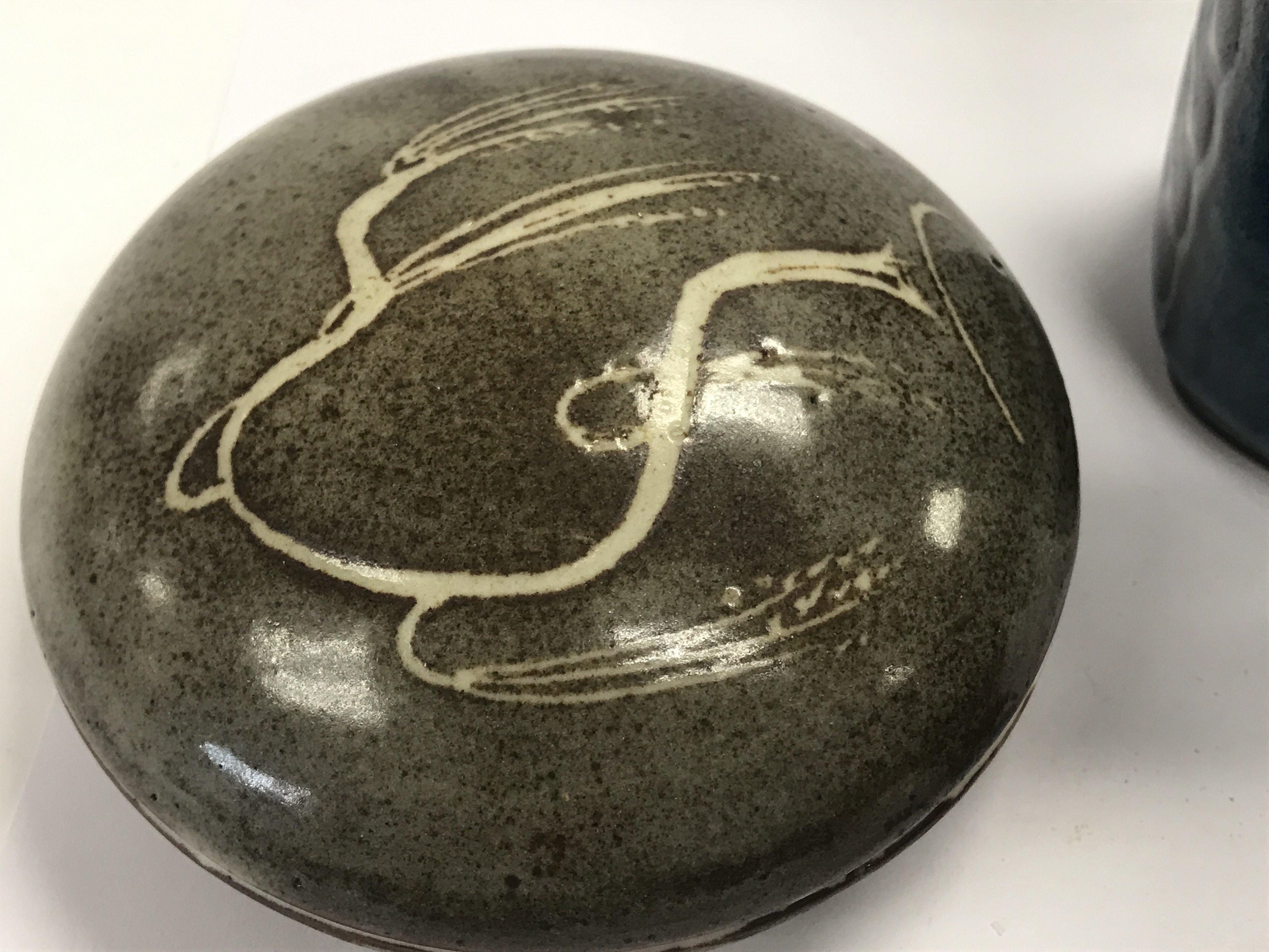 A collection of Art pottery including David Leach small jar and cover 11 cm a pair of danish vases , two vases and two egg cups .