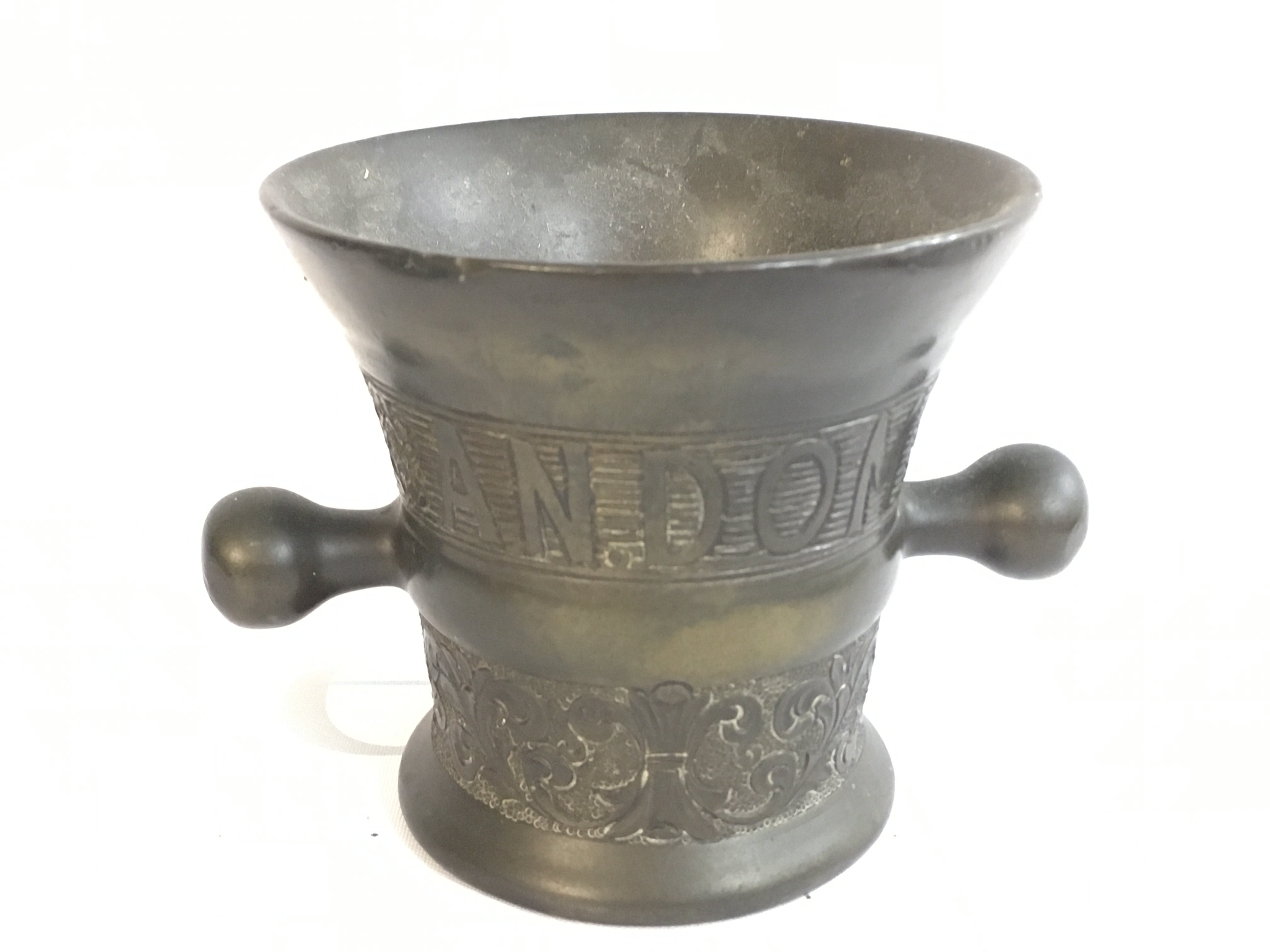 An antique bell shaped bronze mortar , with inscription 1640 Andom. 10cm tall. Postage category B