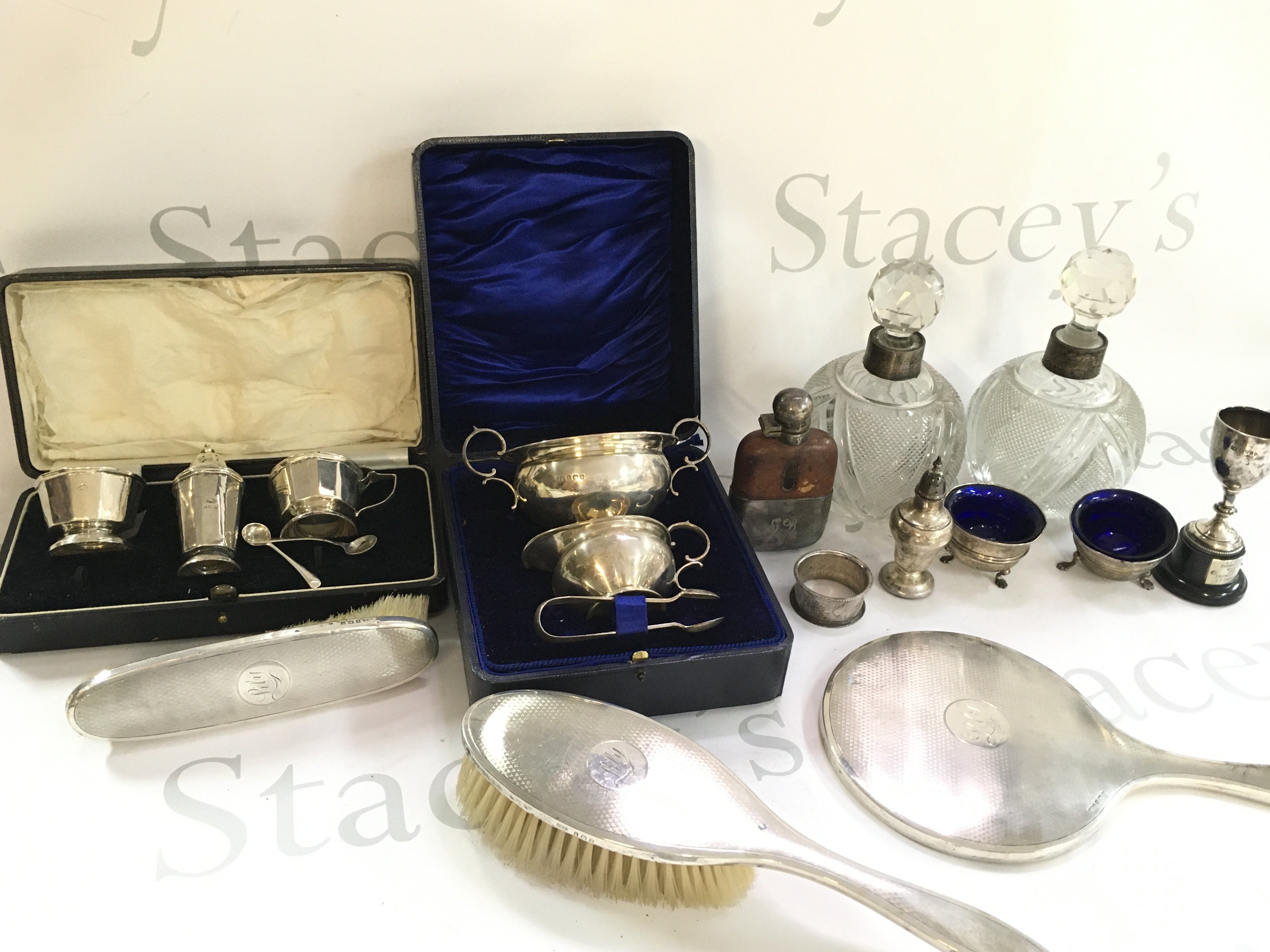 A Collection of silver hallmarked items including a grooming set, silver and leather flask, silver collared decanters, cased condiment set etc. This lot cannot be posted