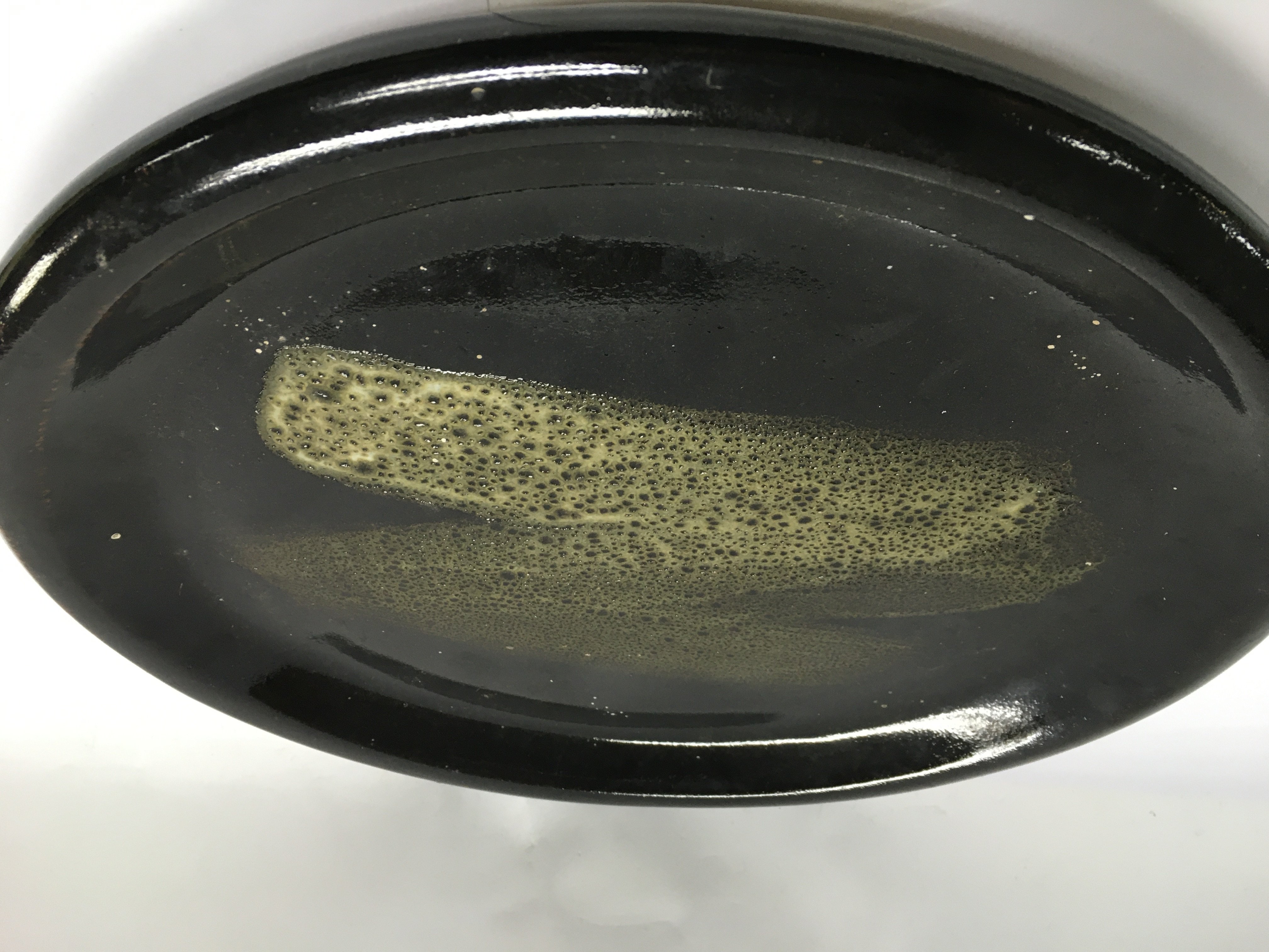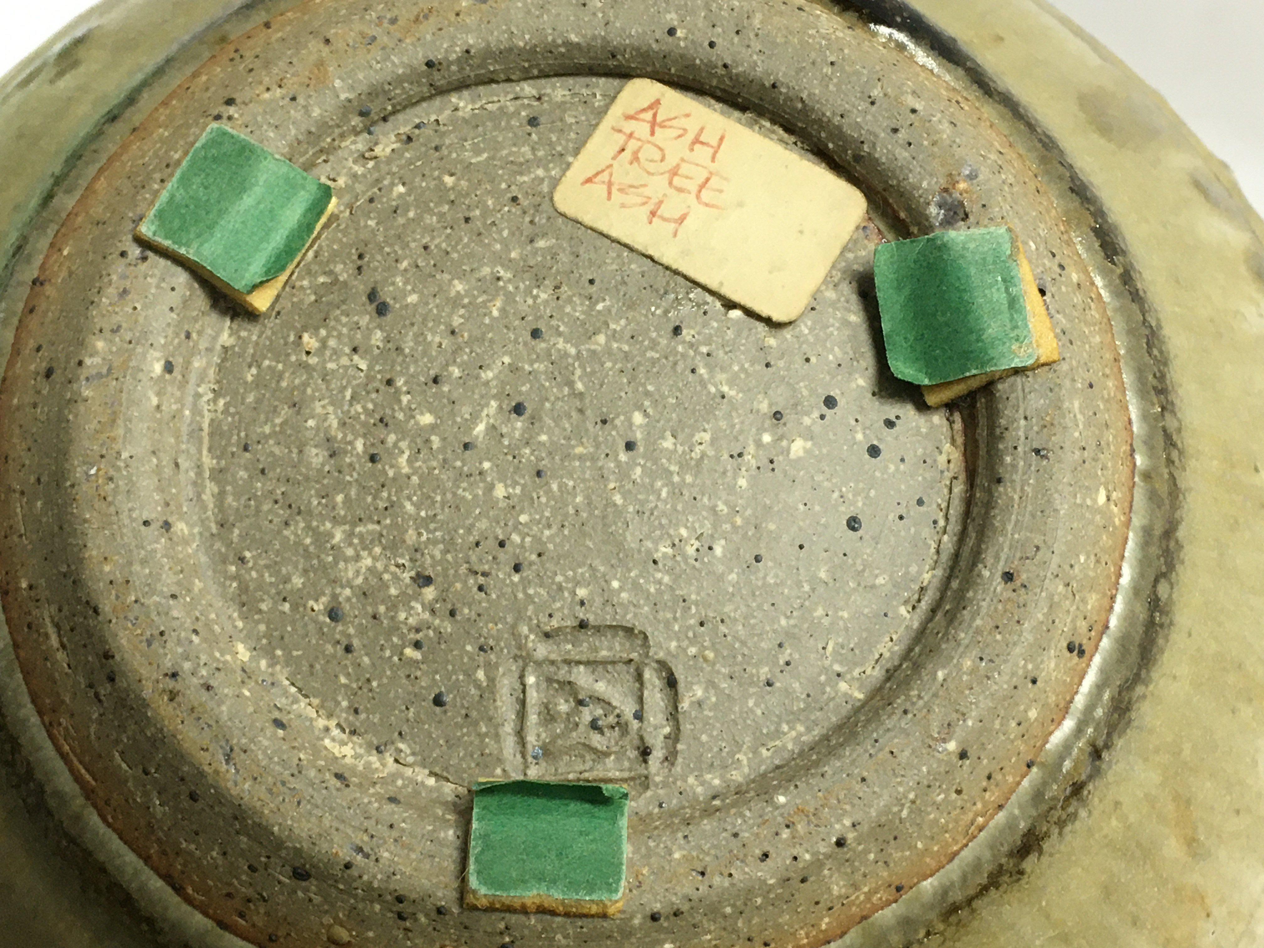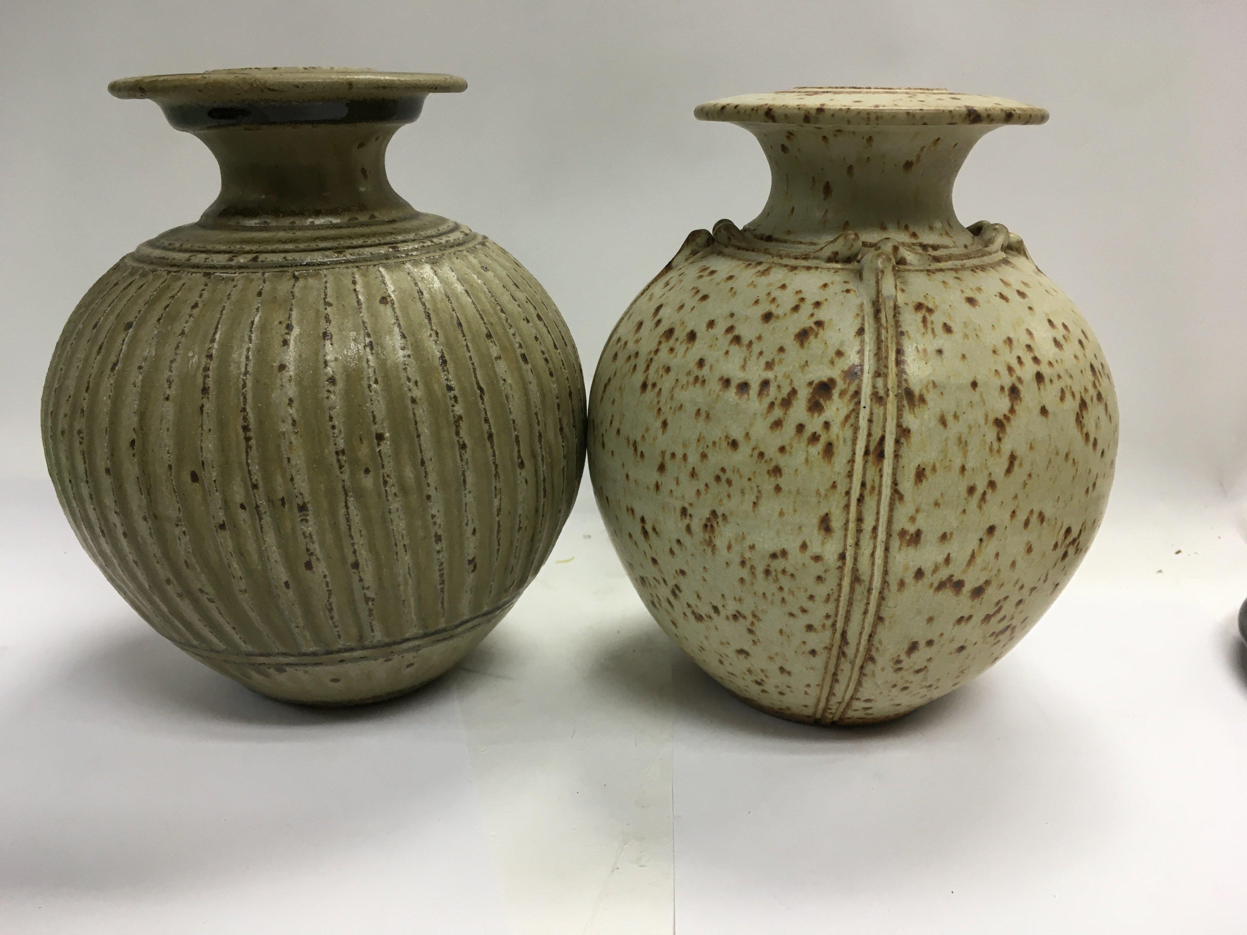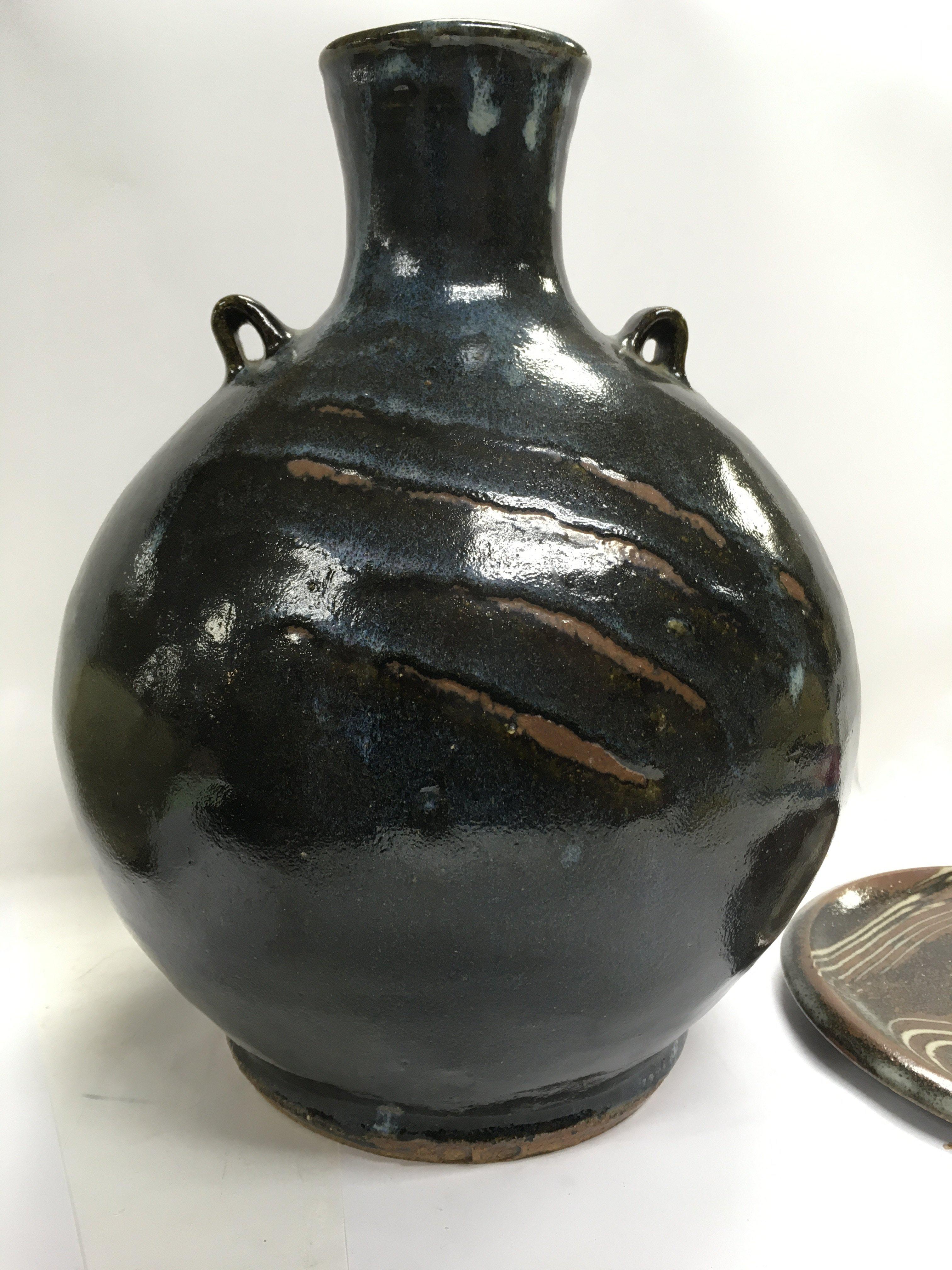 A collection of stone ware art pottery comprising twin handle blue and black glazz vase 30 cm Two stone ware vase with celadon glazz 20 cm a black glazz circular tray 30 cm and a small David Leach Dish .