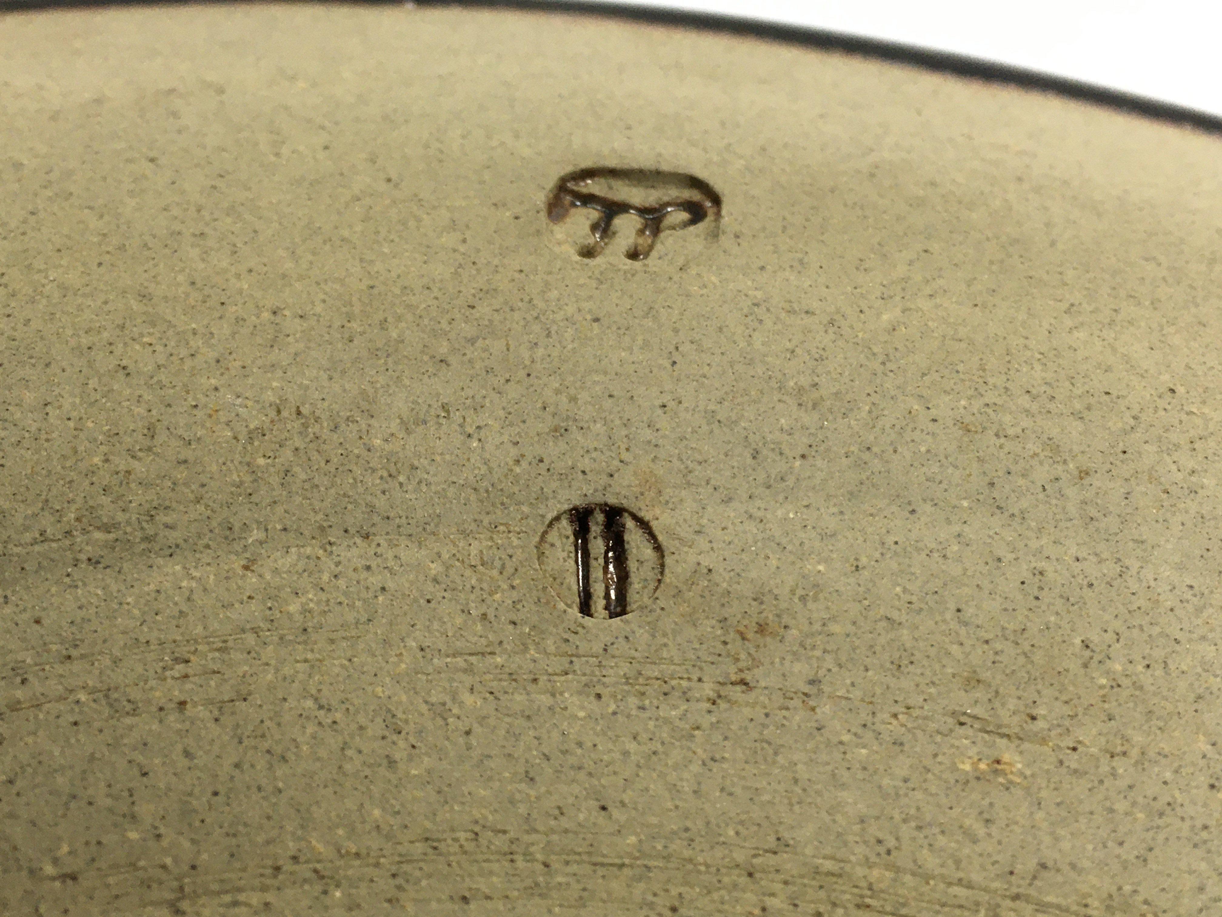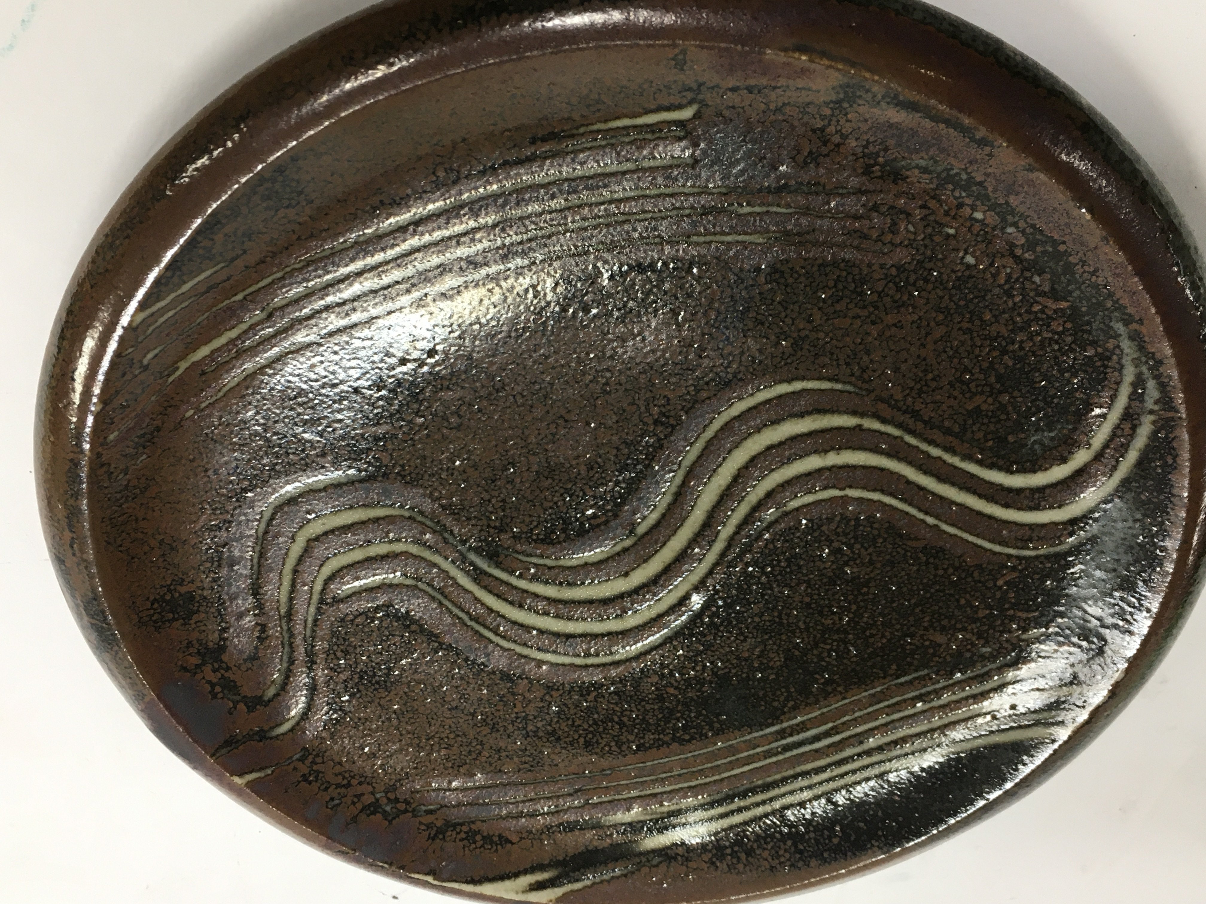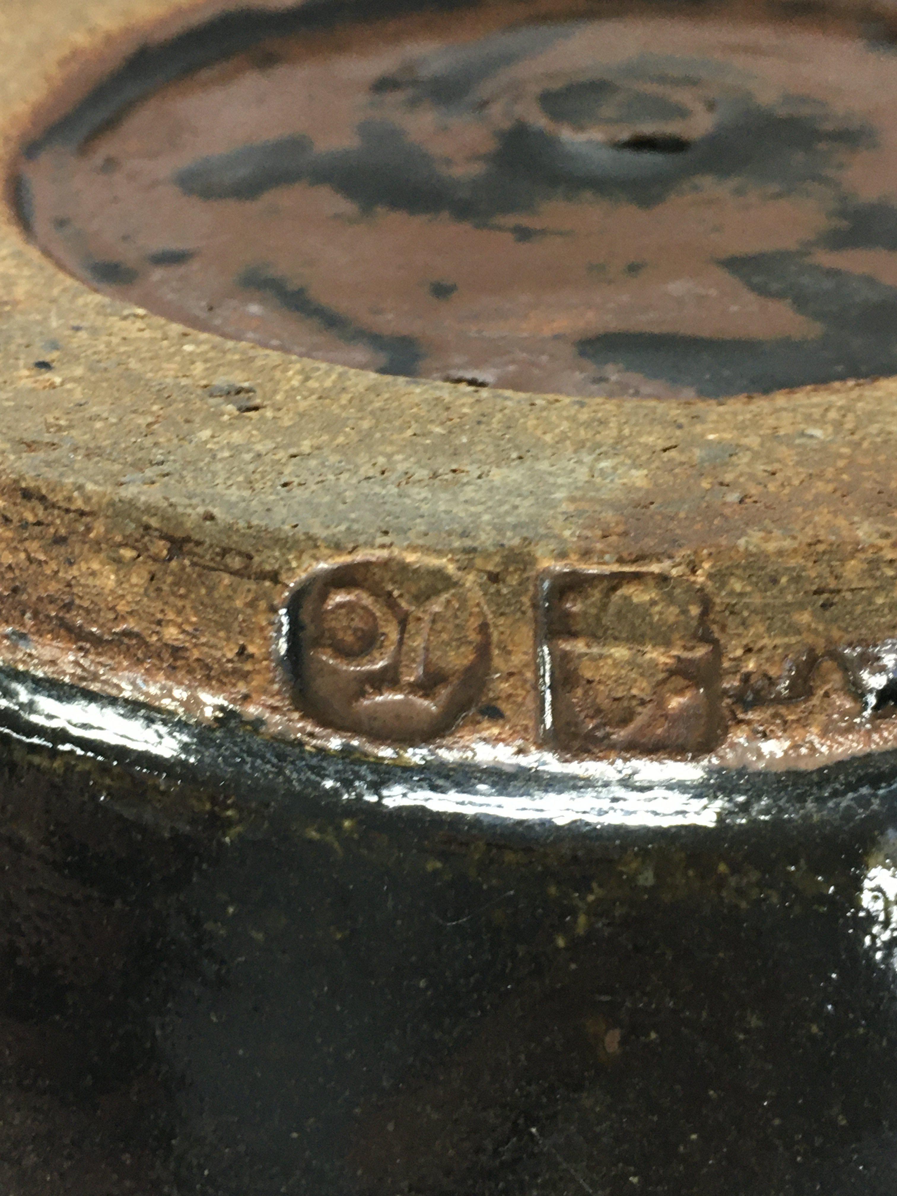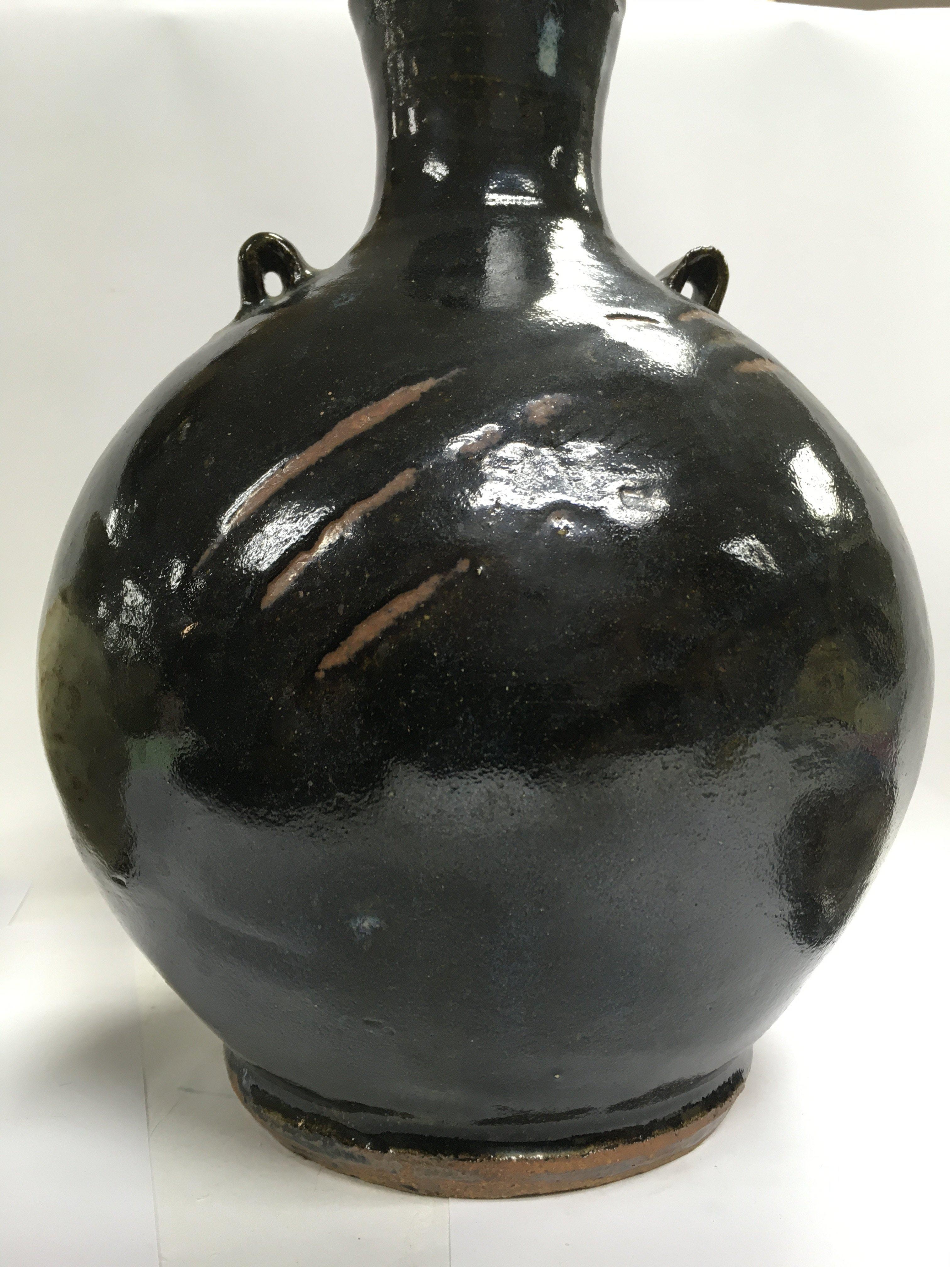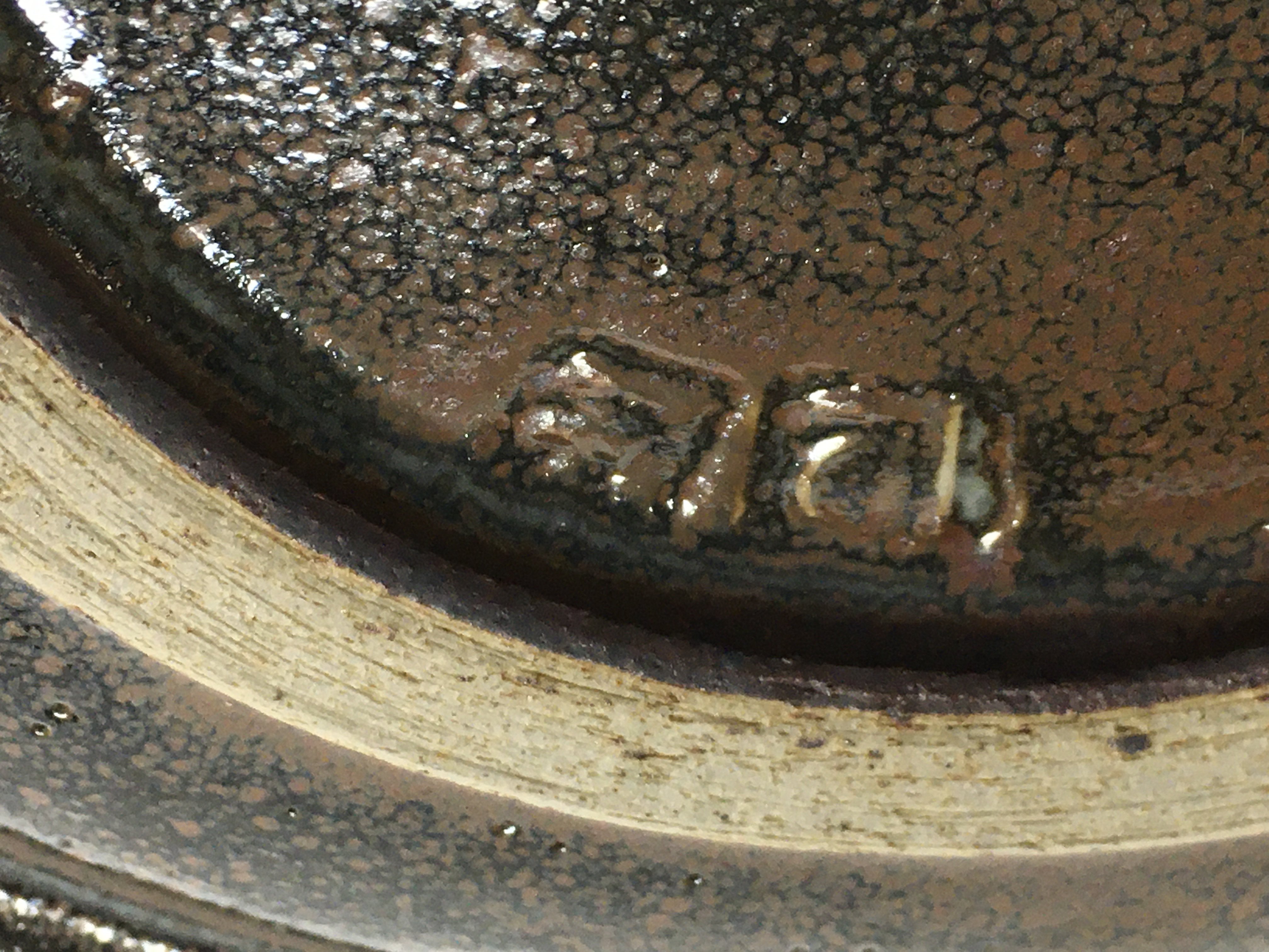 A collection of stone ware art pottery comprising twin handle blue and black glazz vase 30 cm Two stone ware vase with celadon glazz 20 cm a black glazz circular tray 30 cm and a small David Leach Dish .