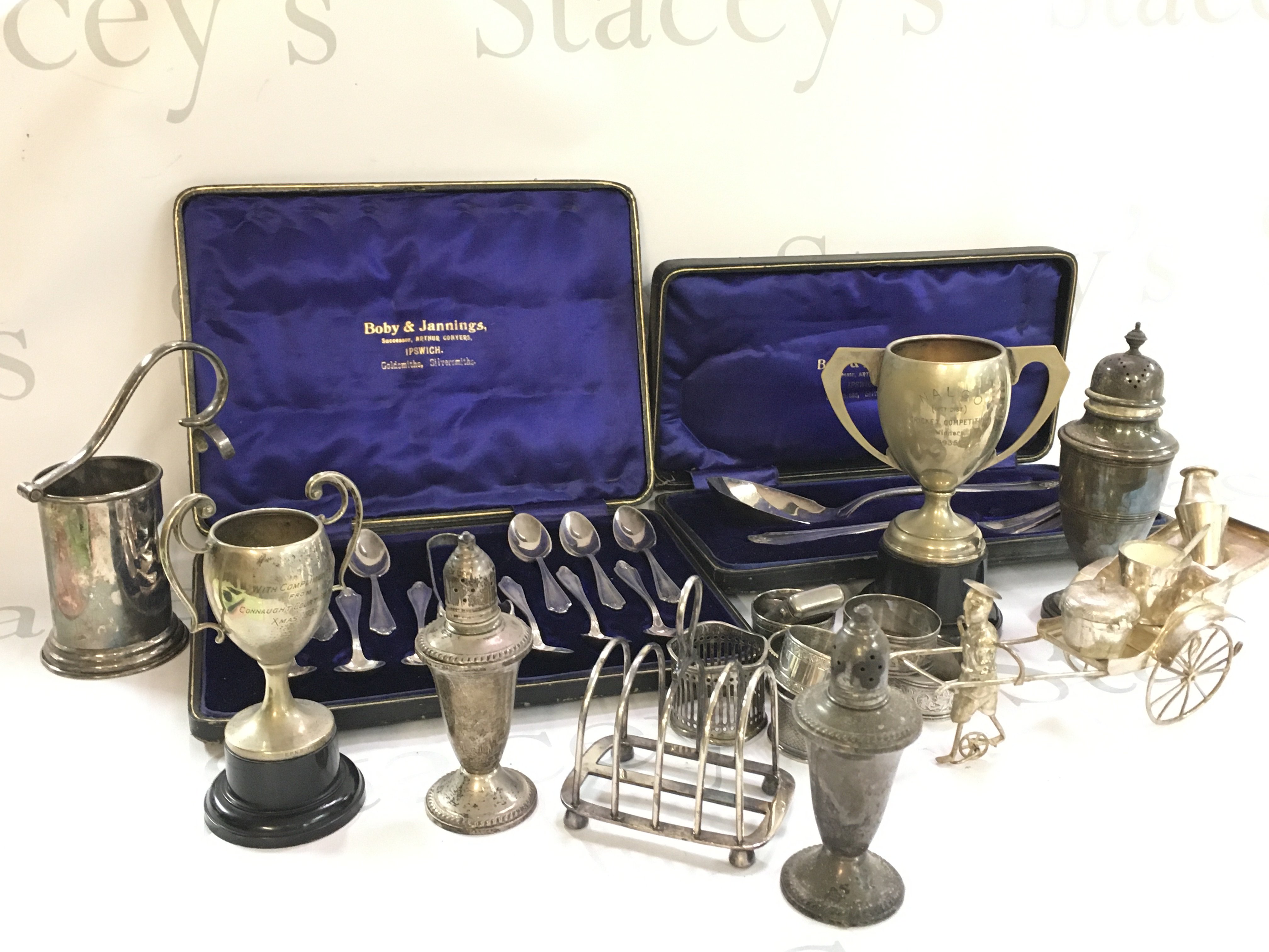 A Collection of silver plated ware including a cased set of spoons, salt and pepper shakers, napkin rings etc