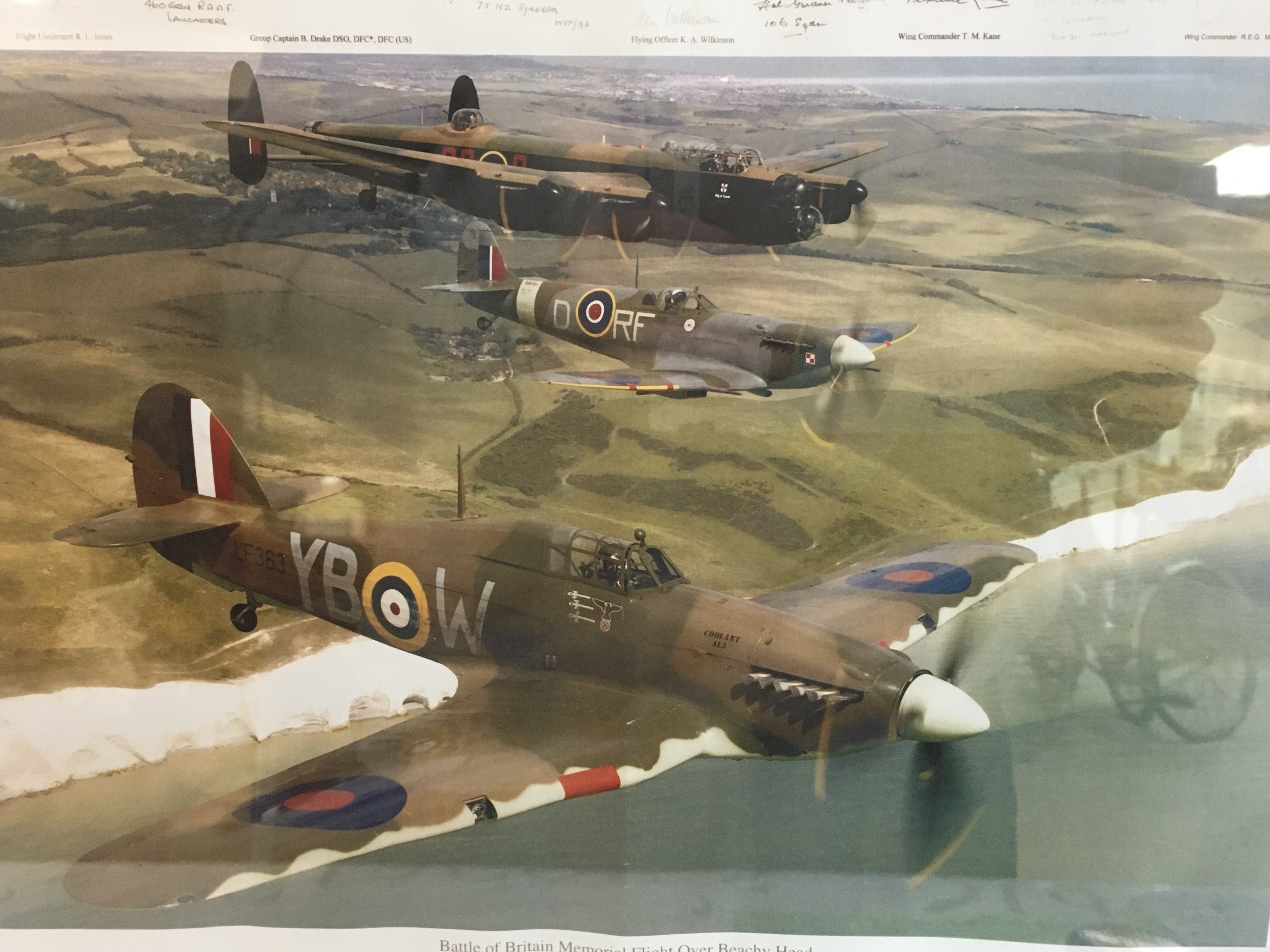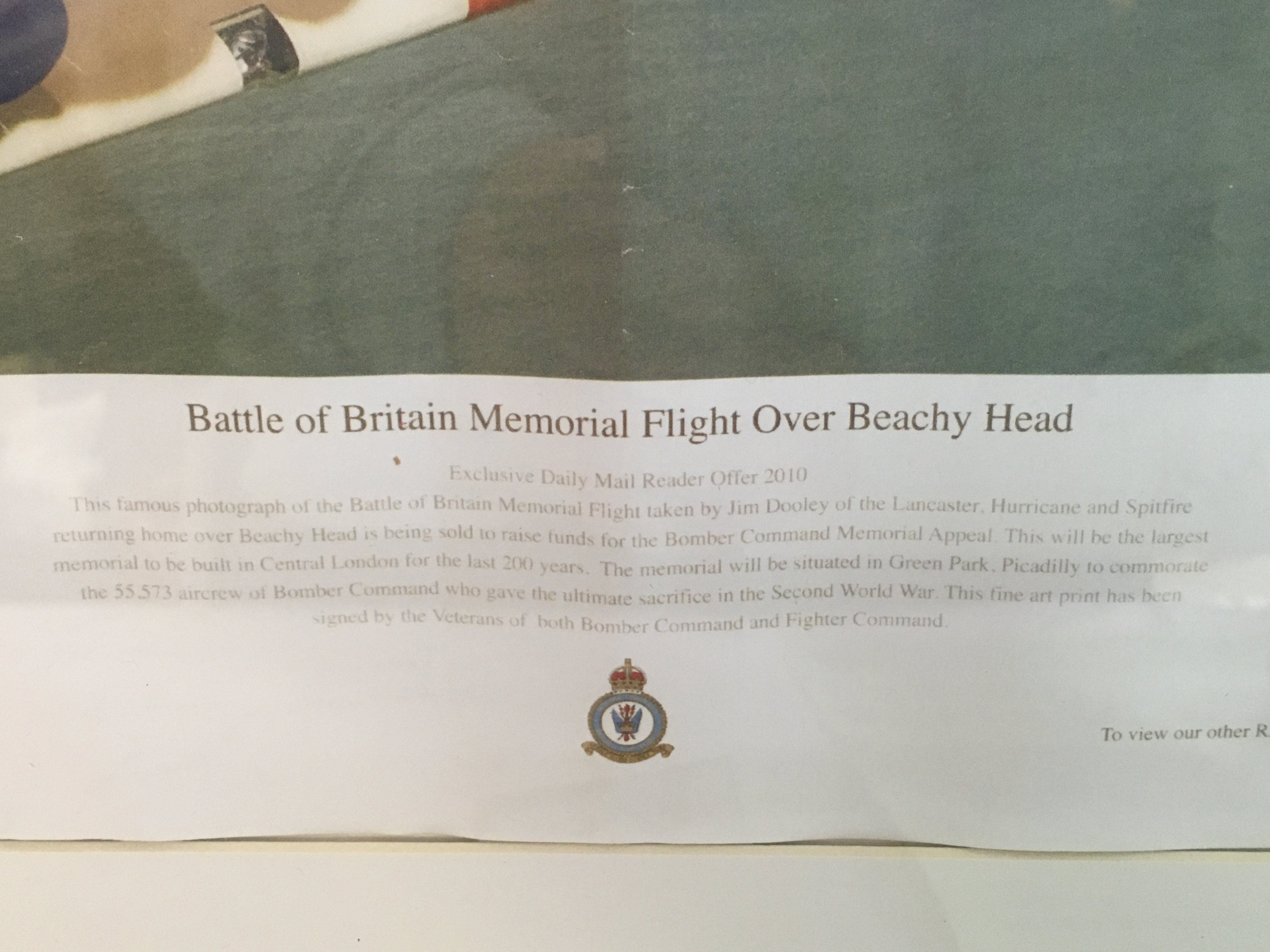 James Dooley, coloured print, Battle of Britain Memorial Flight Over Beachy Head, bearing facsimile signatures by the Veterans of both Bomber Command and Fighter Command, framed, dimensions 52x42cm