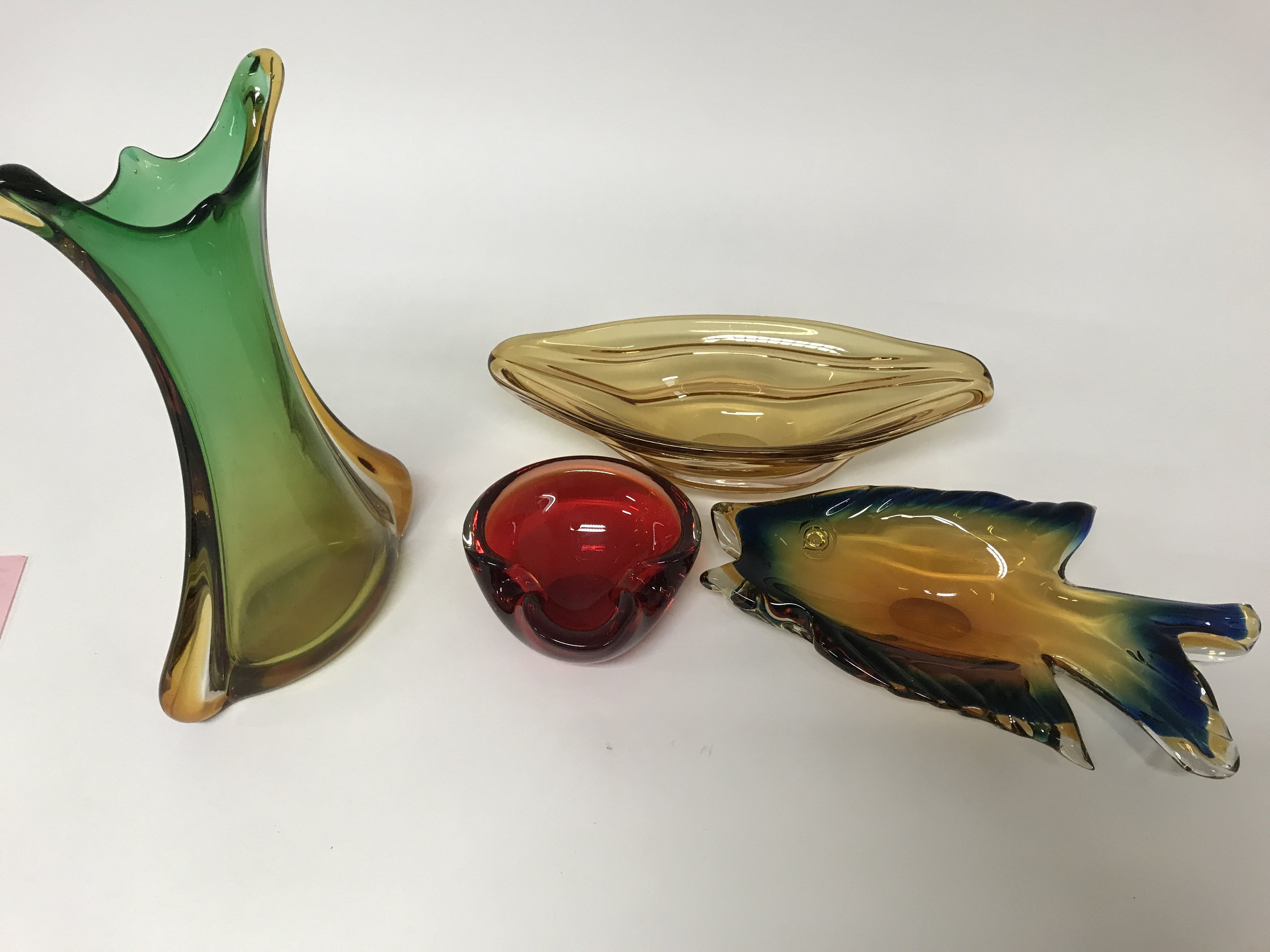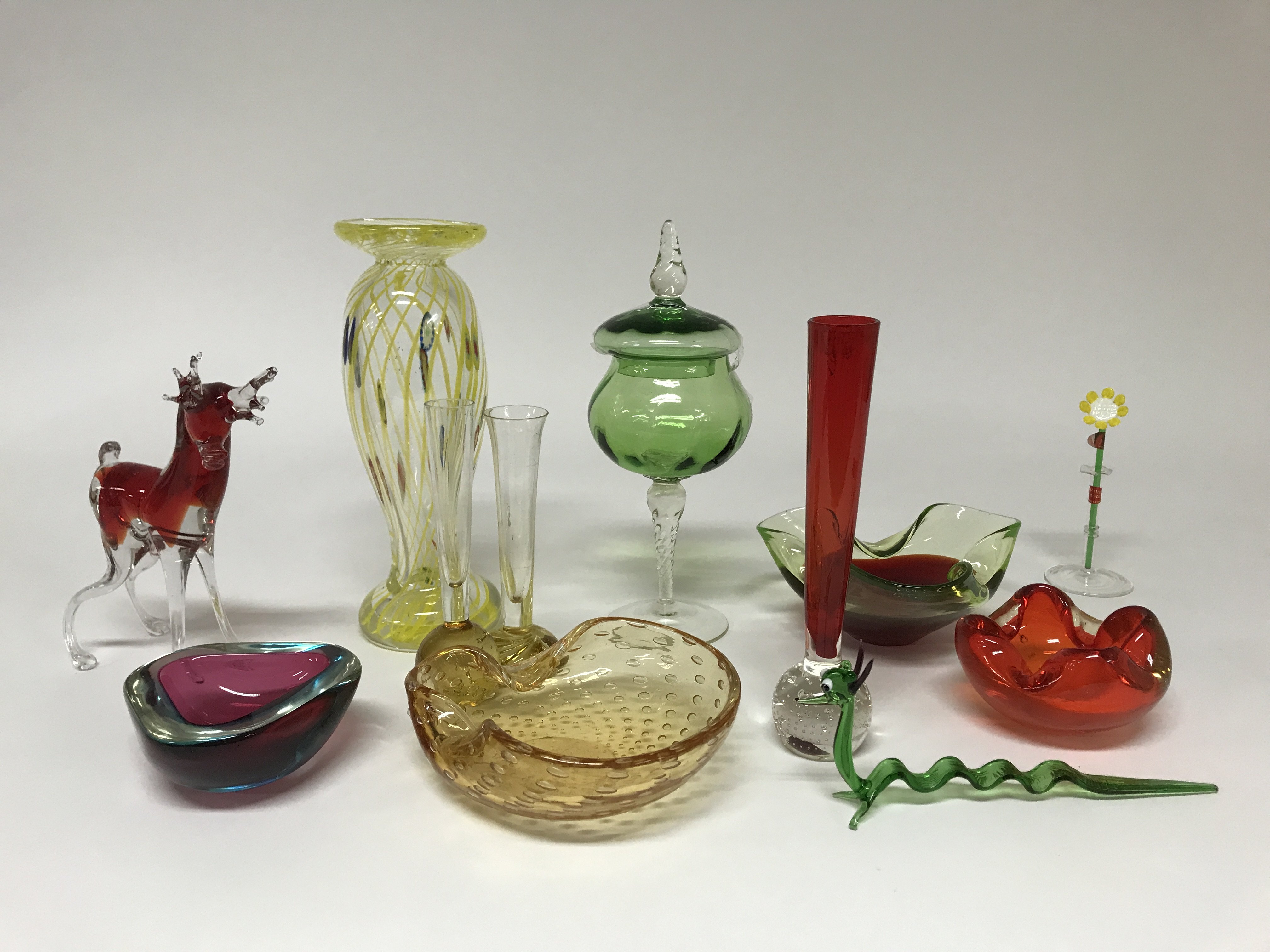 A collection of coloured glassware including Murano examples.