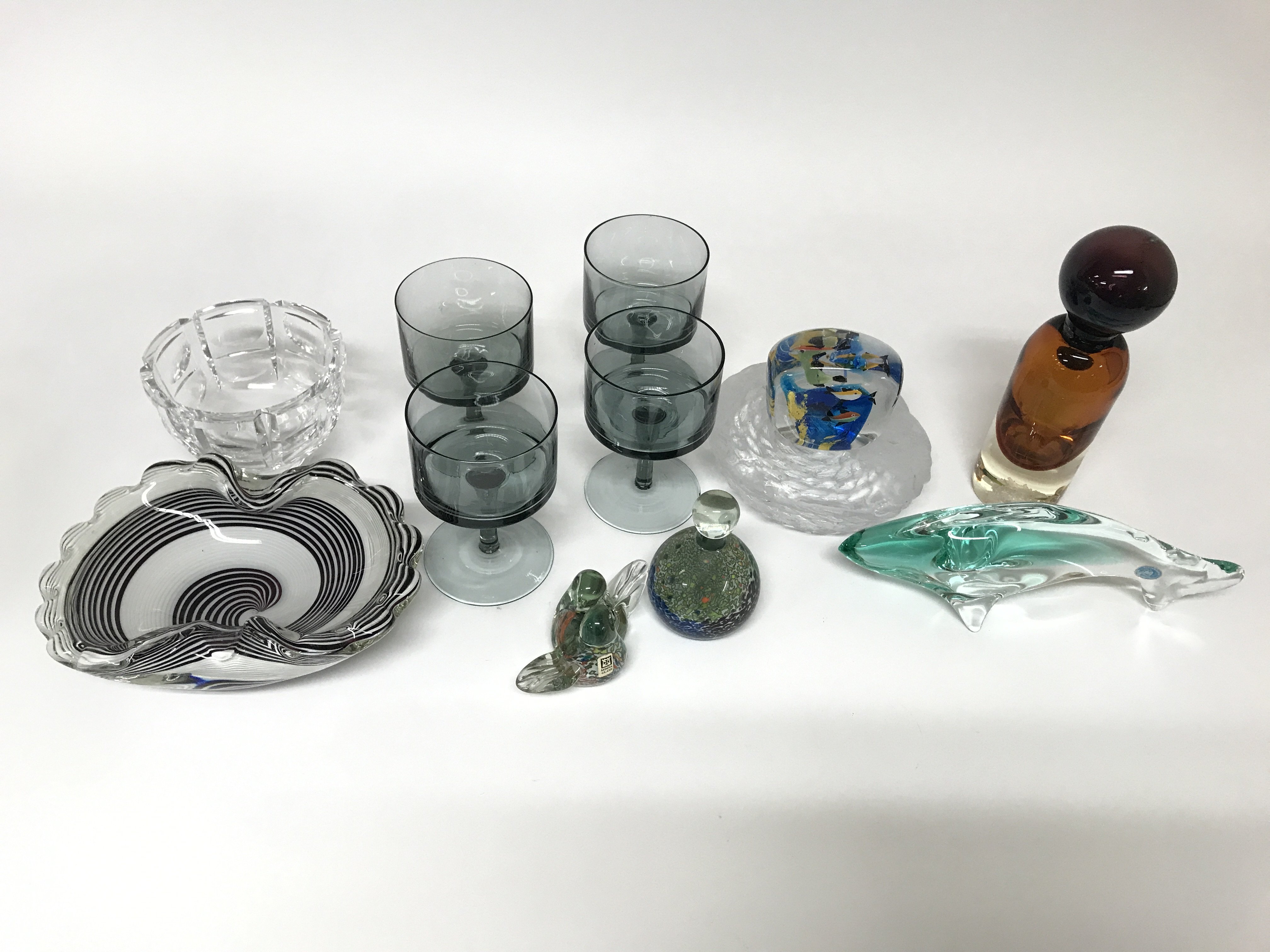 A collection of coloured and cut glass including some paperweights.