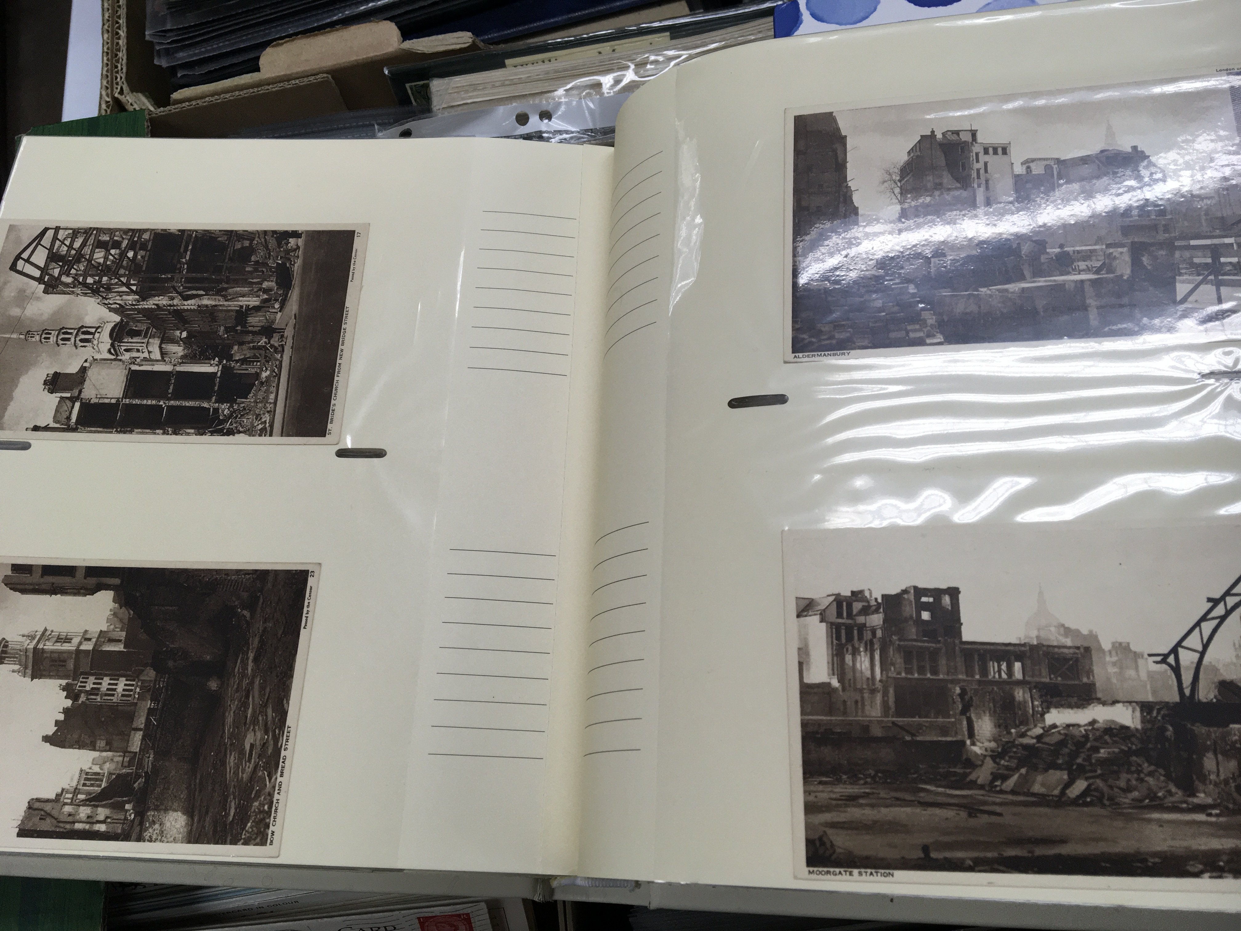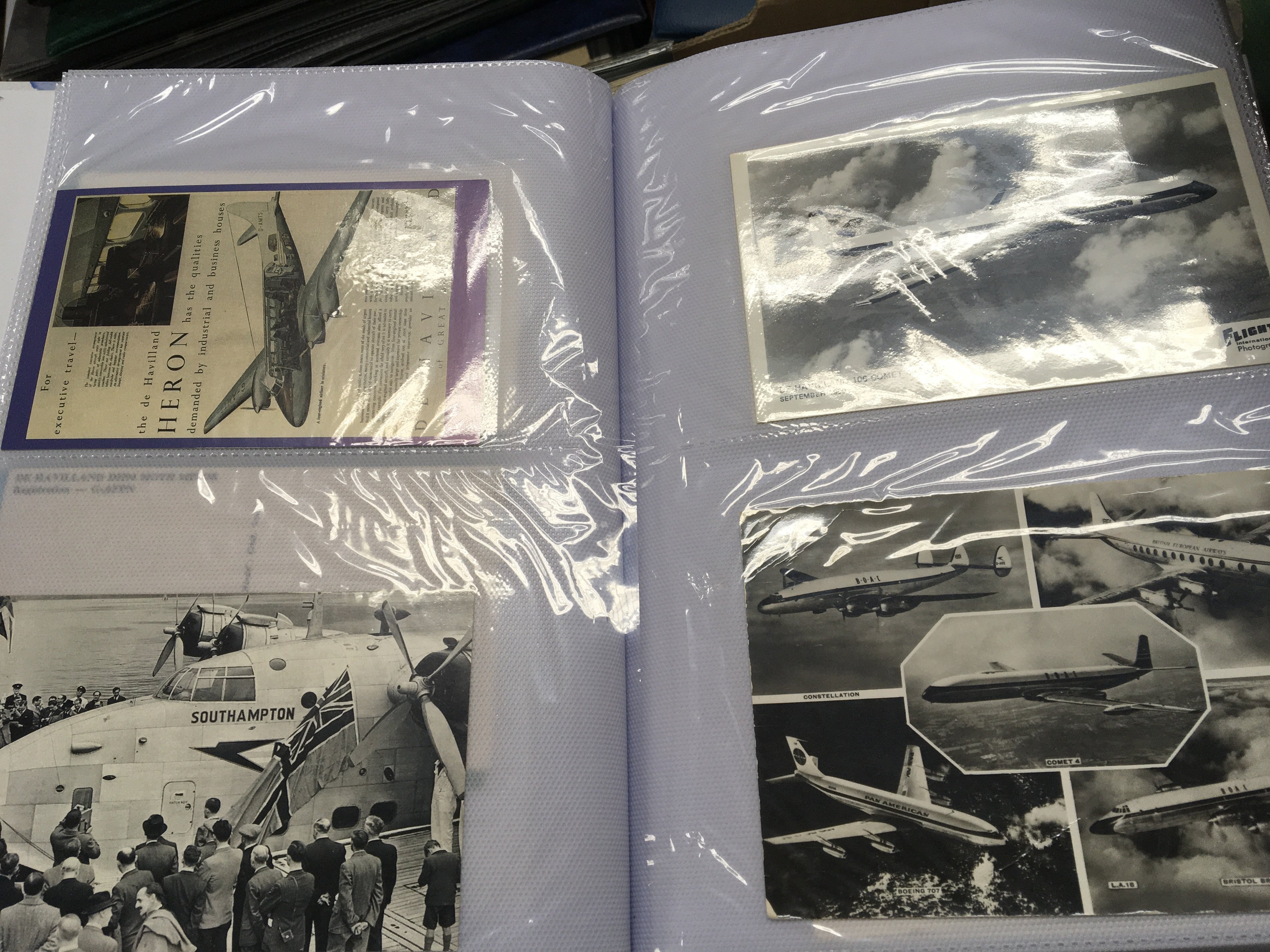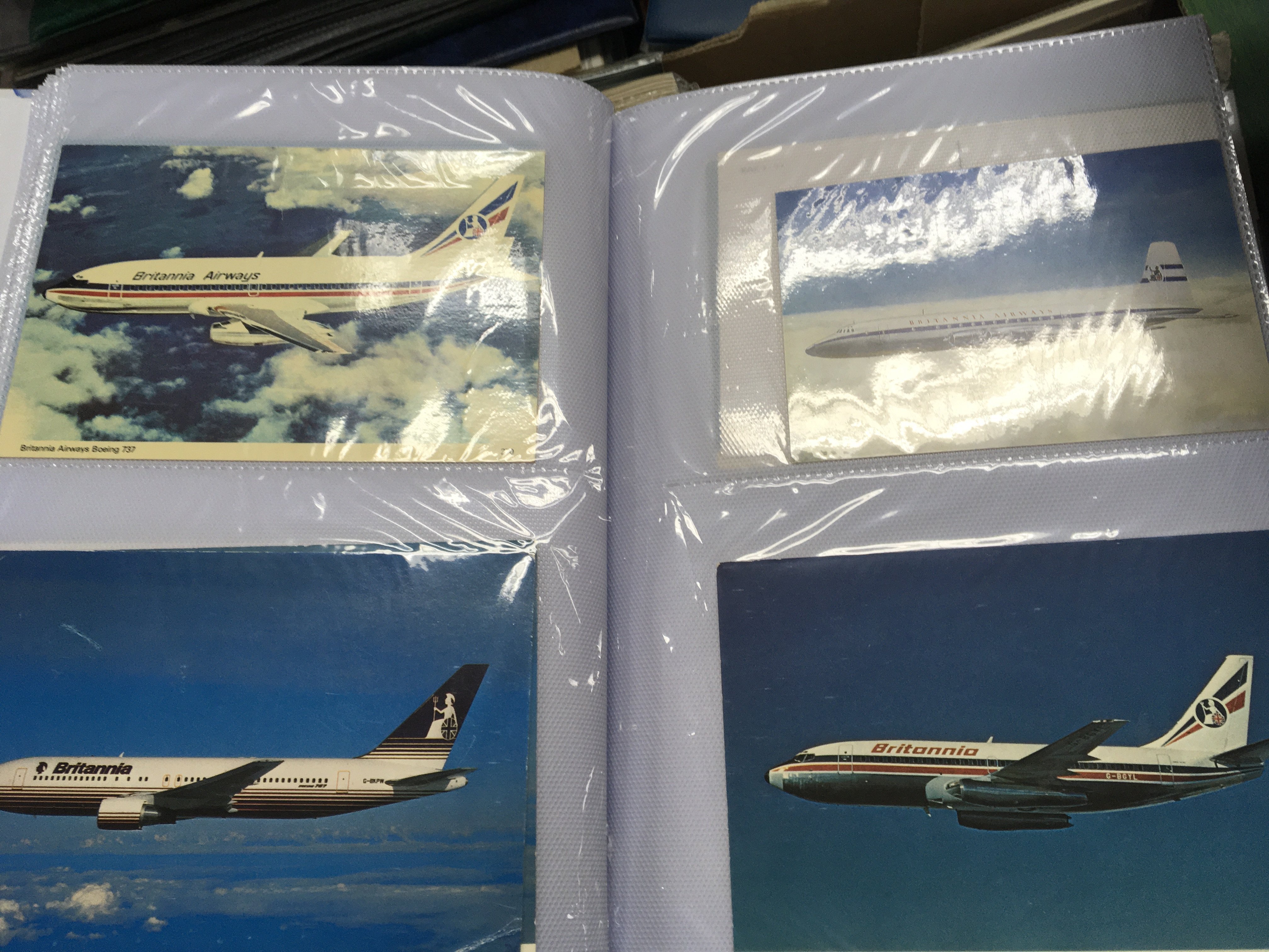 A box containing postcards including an album of Aviation postcards mainly commercial airlines 1960-70 an album of II world war cards and retrospective photos and many other postcards.