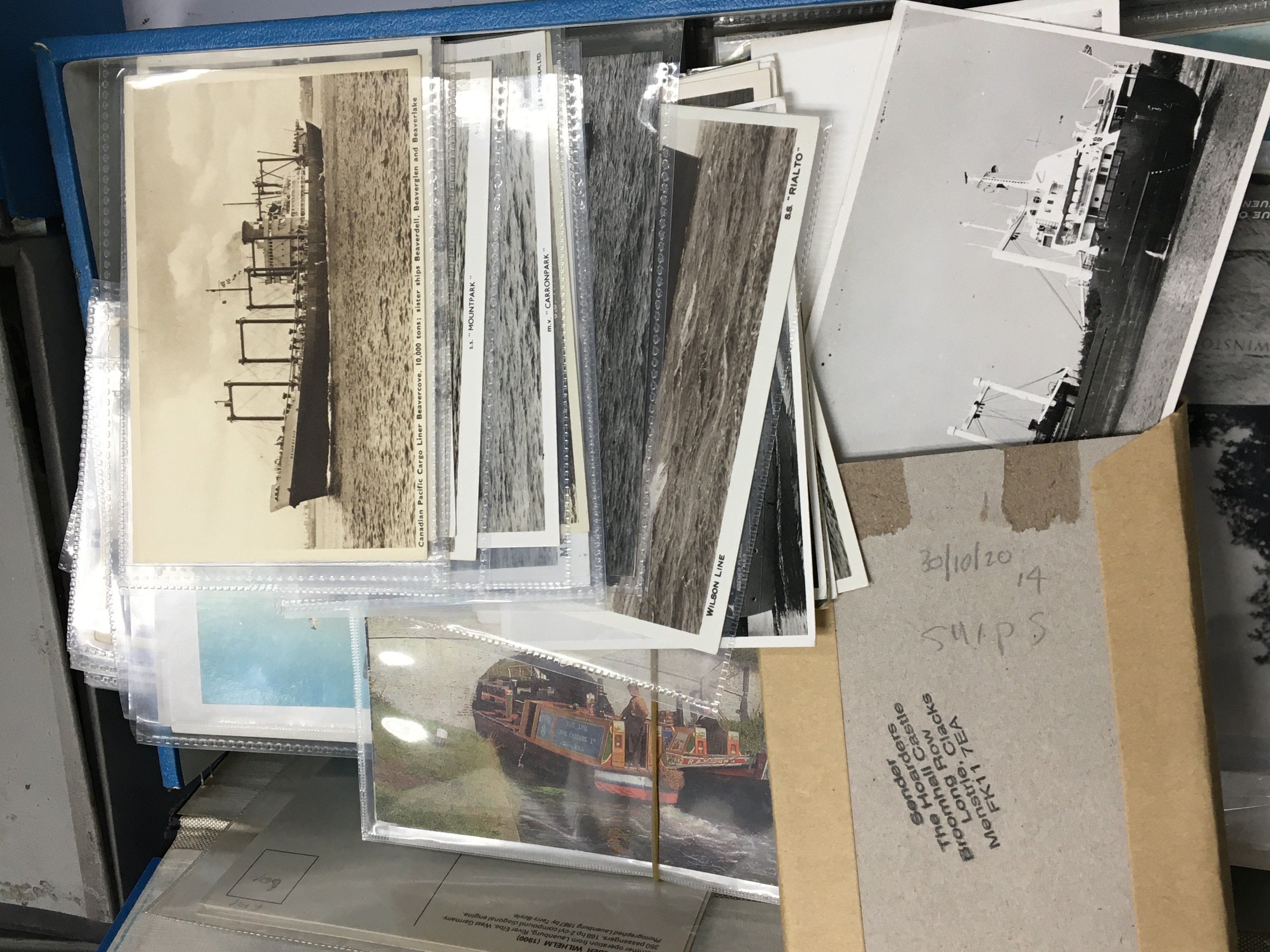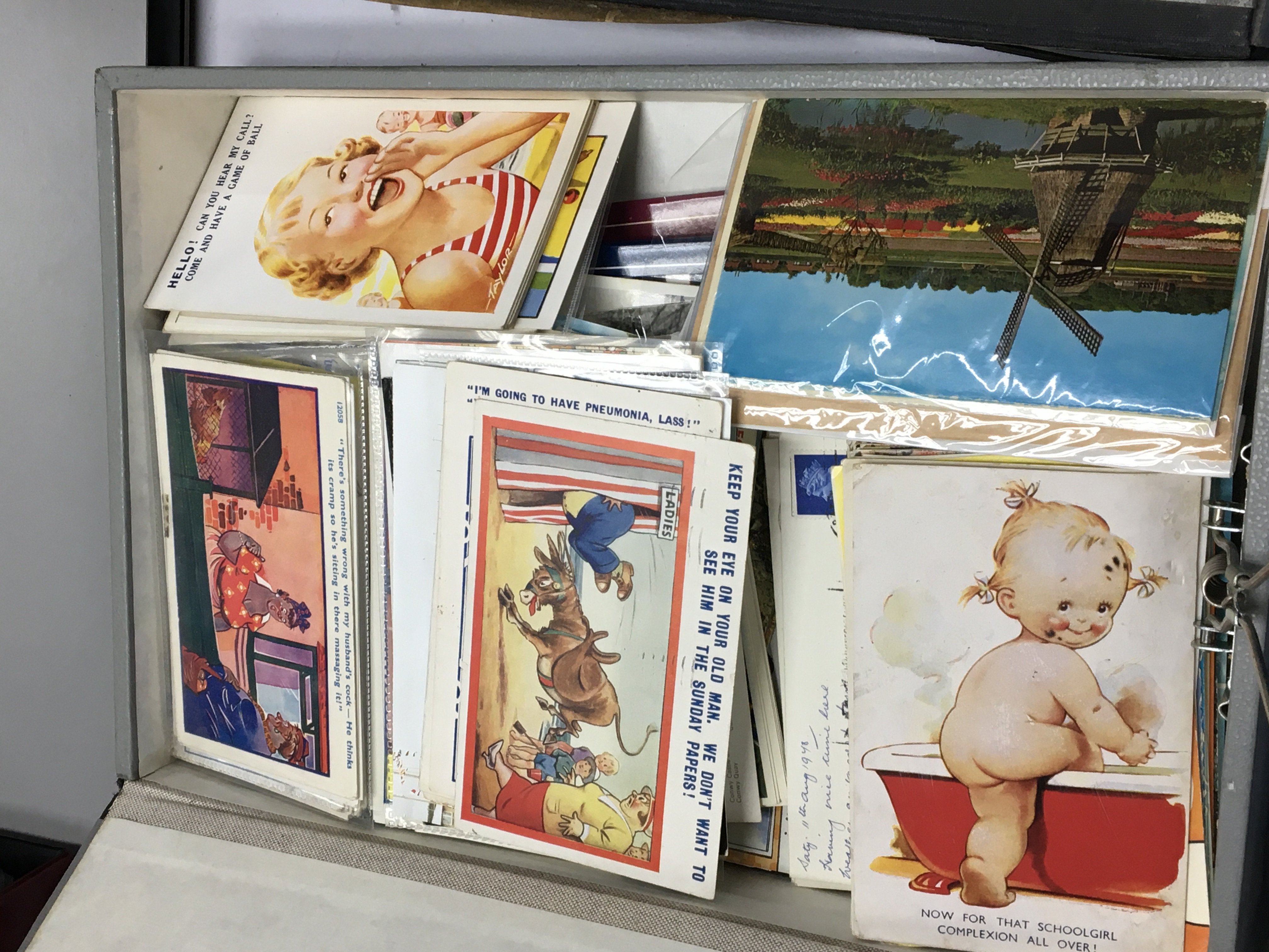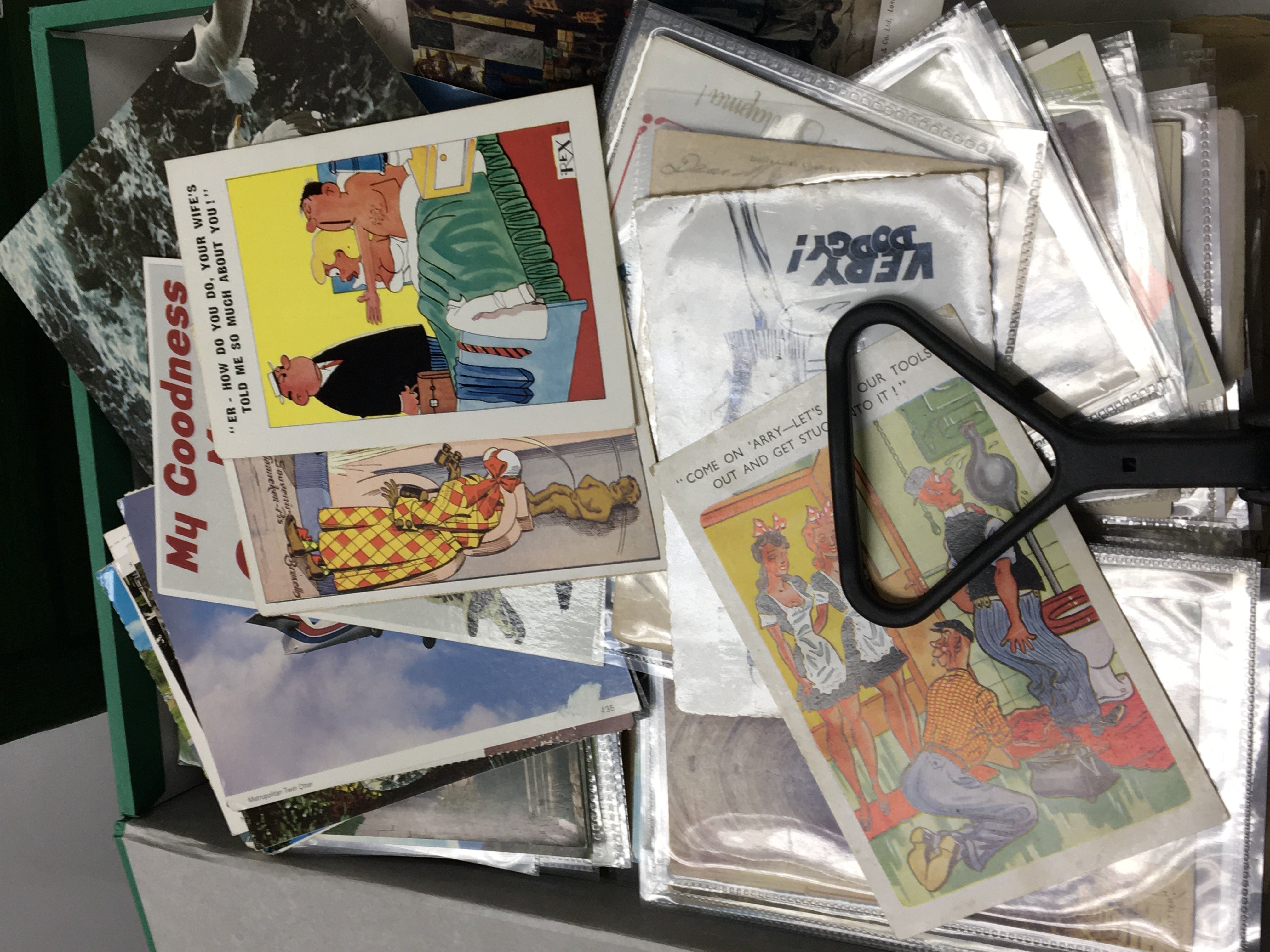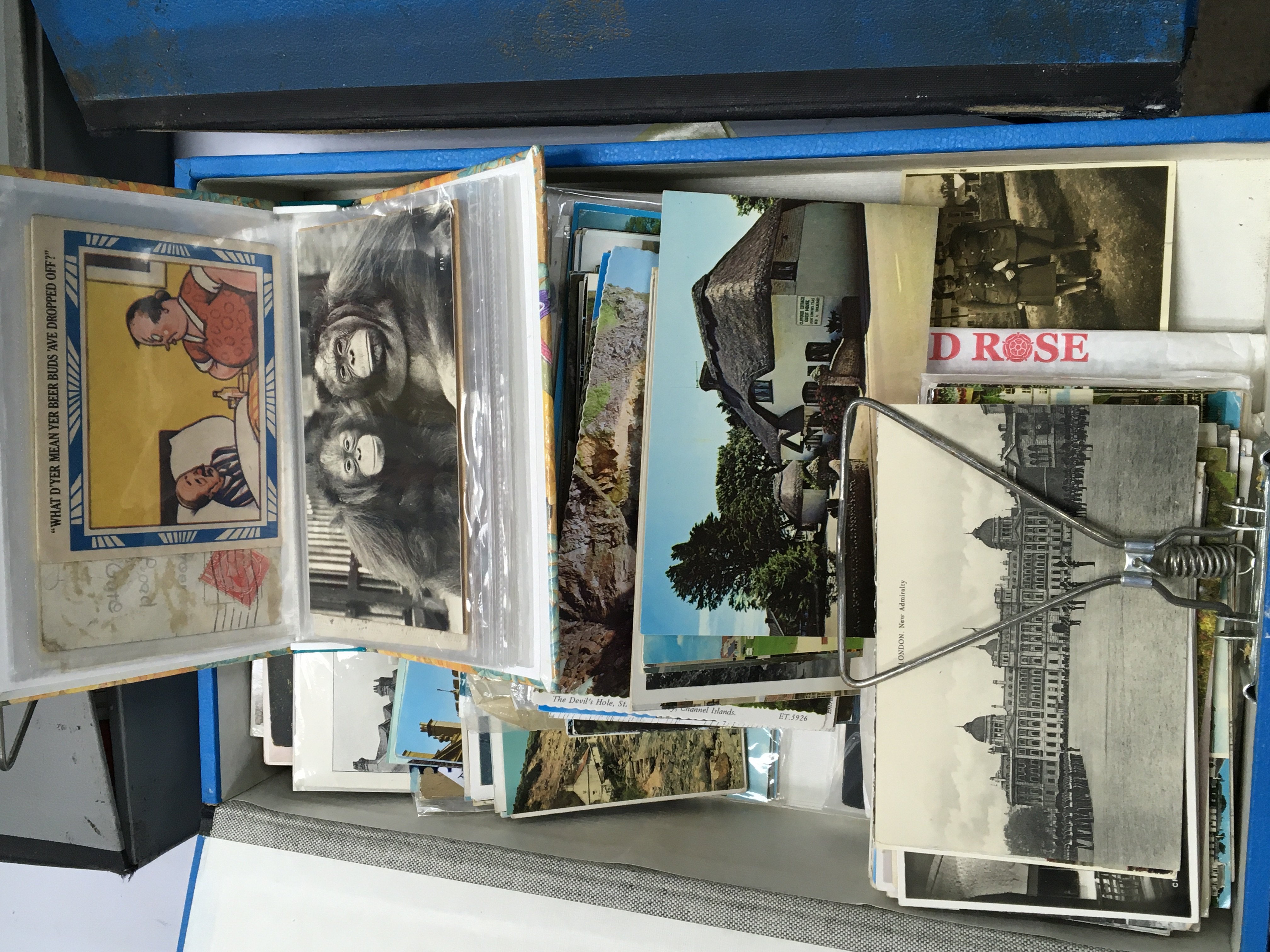 A collection of box files containing vintage postcards mixed subjects including comical cards shipping cards and many more