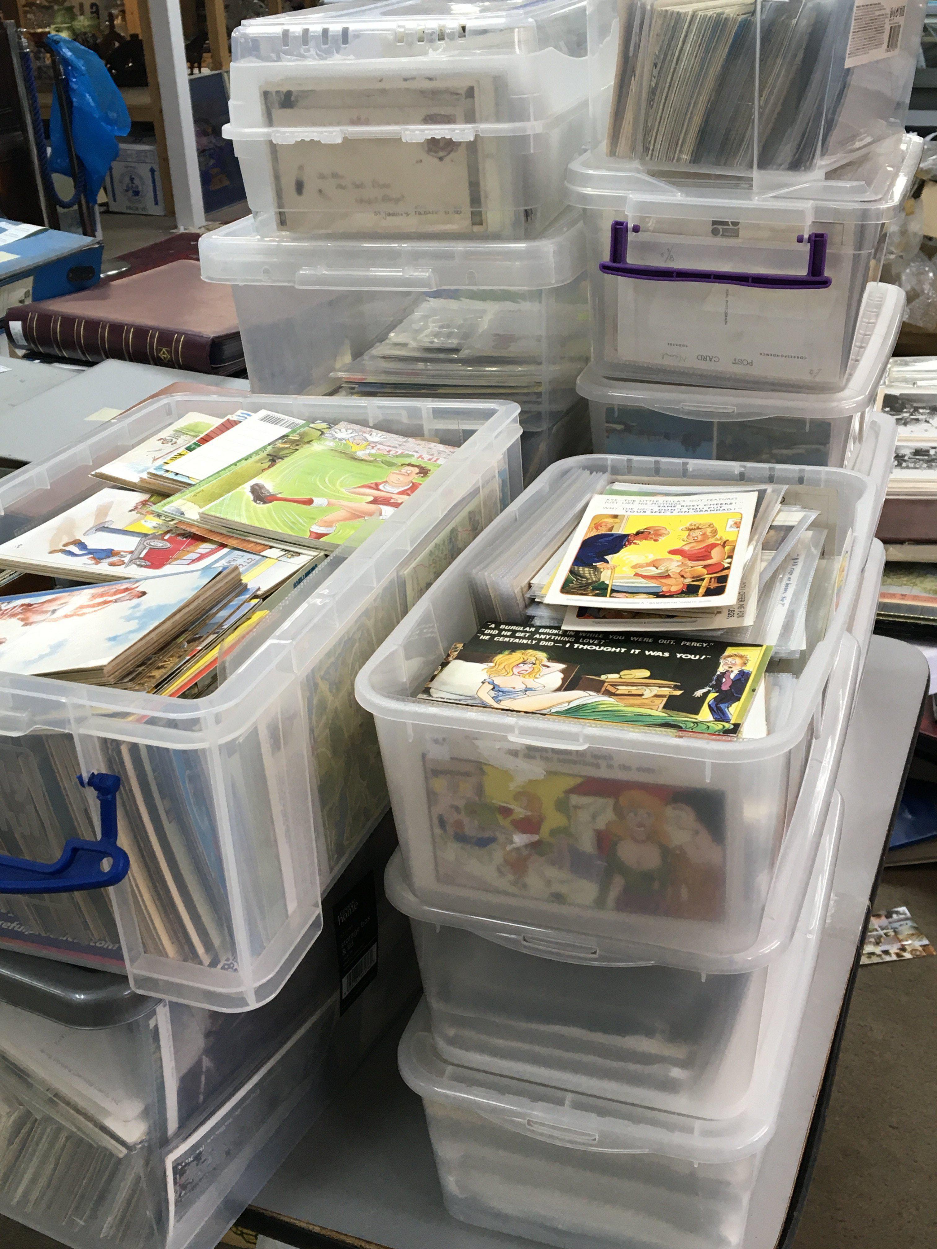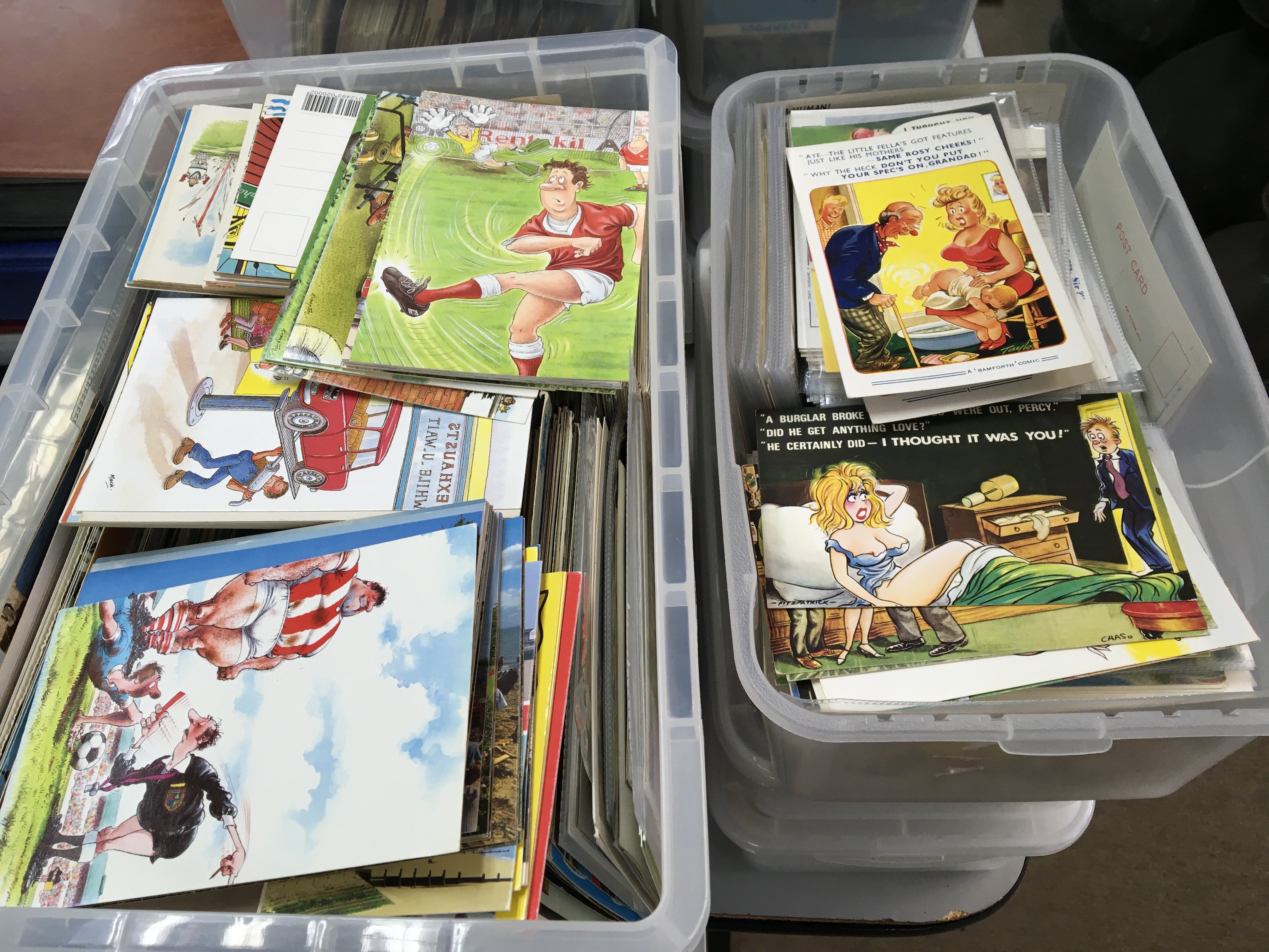 A collection of thirteen plastic boxes containing a large quantity of postcards mainly mid 20th century including a large collection of comical cards including early examples and numerous other postcards mixed subjects. (13)