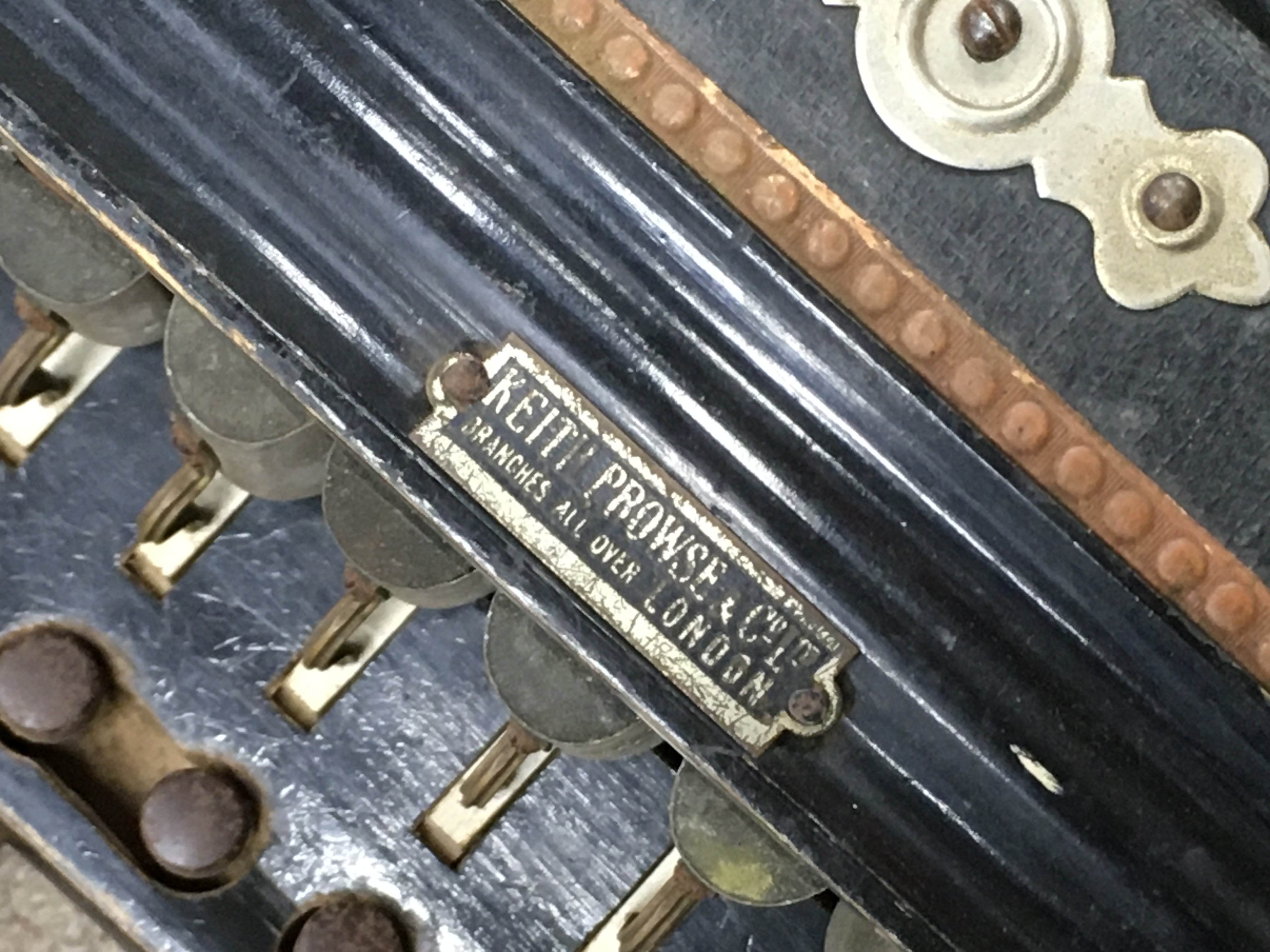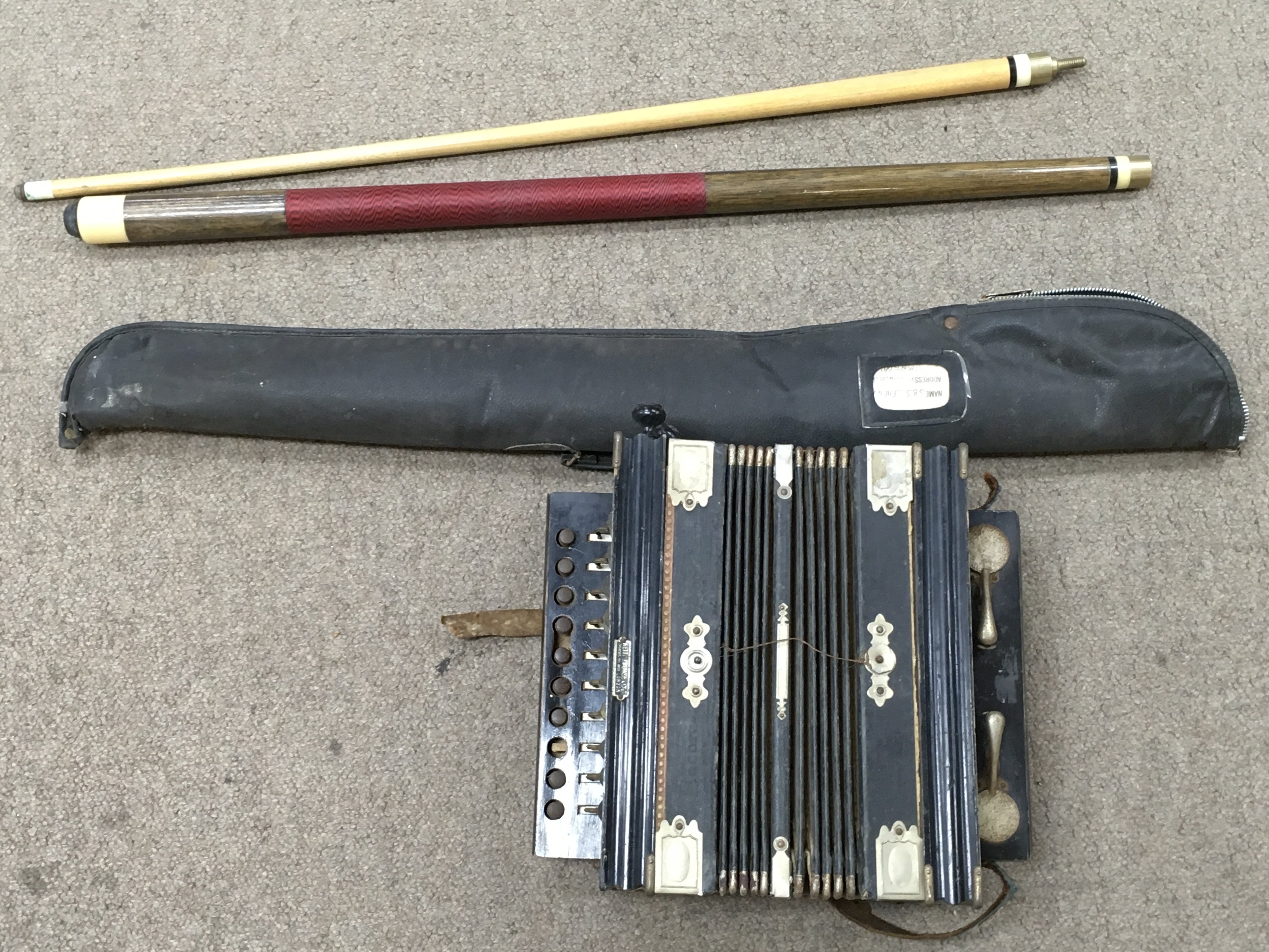 A Keith Prowse accordion and a pool cue. Postage category C