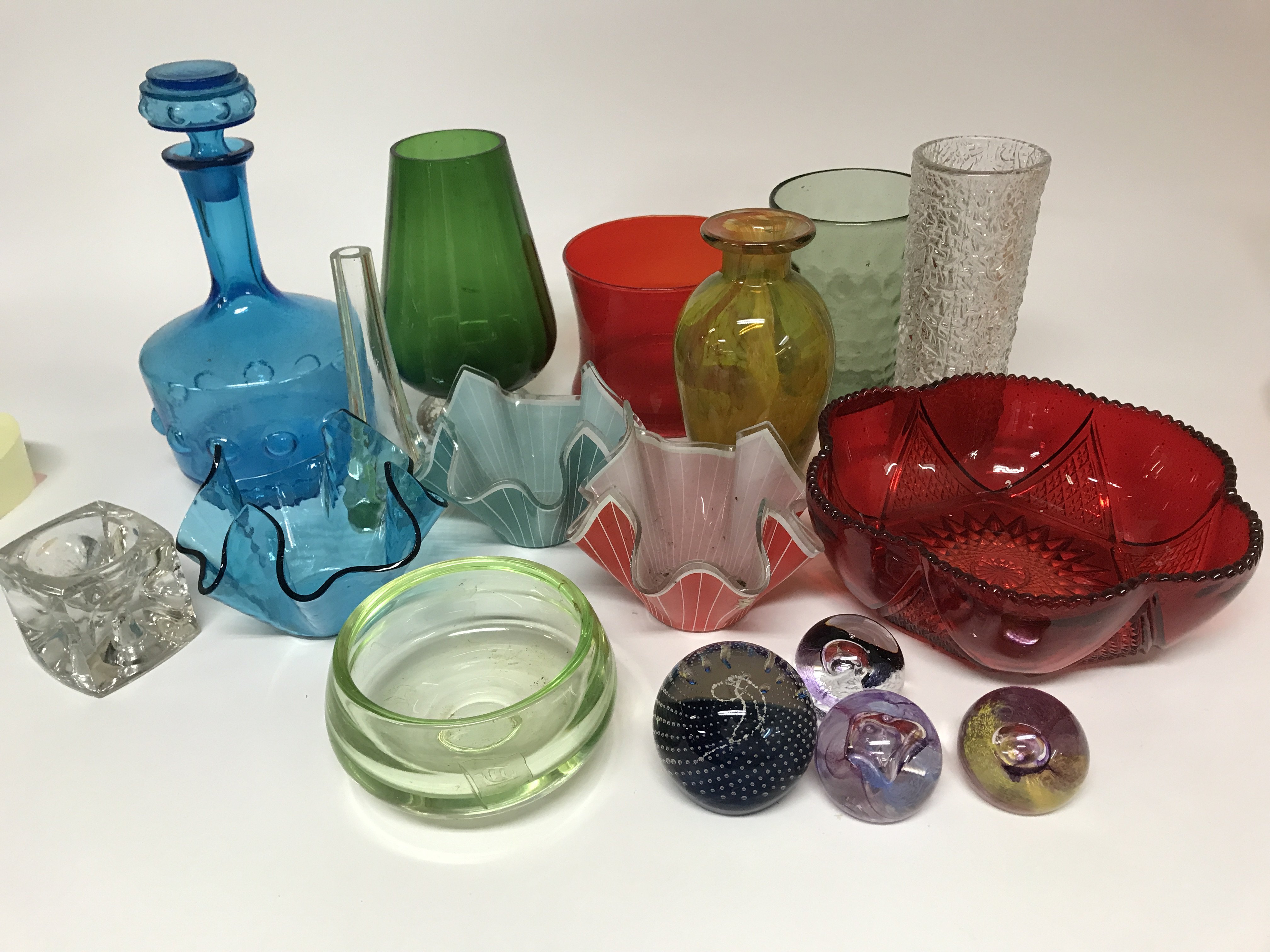 A mixed collection of cut and coloured glassware including paperweights.