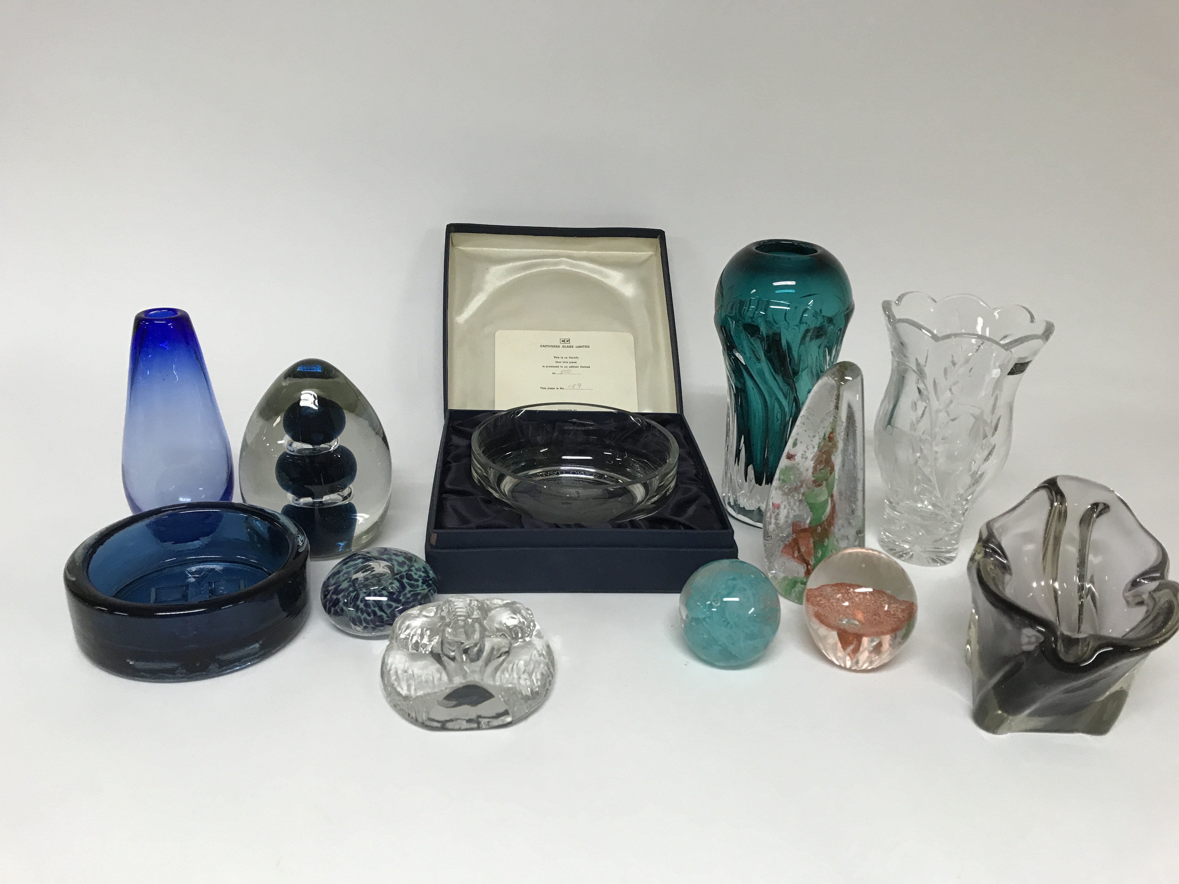 A mixed collection of glassware including paperweights bowls and vases as well as a limited edition Caithness mayflower piece and a Wedgwood elephant paperweight.