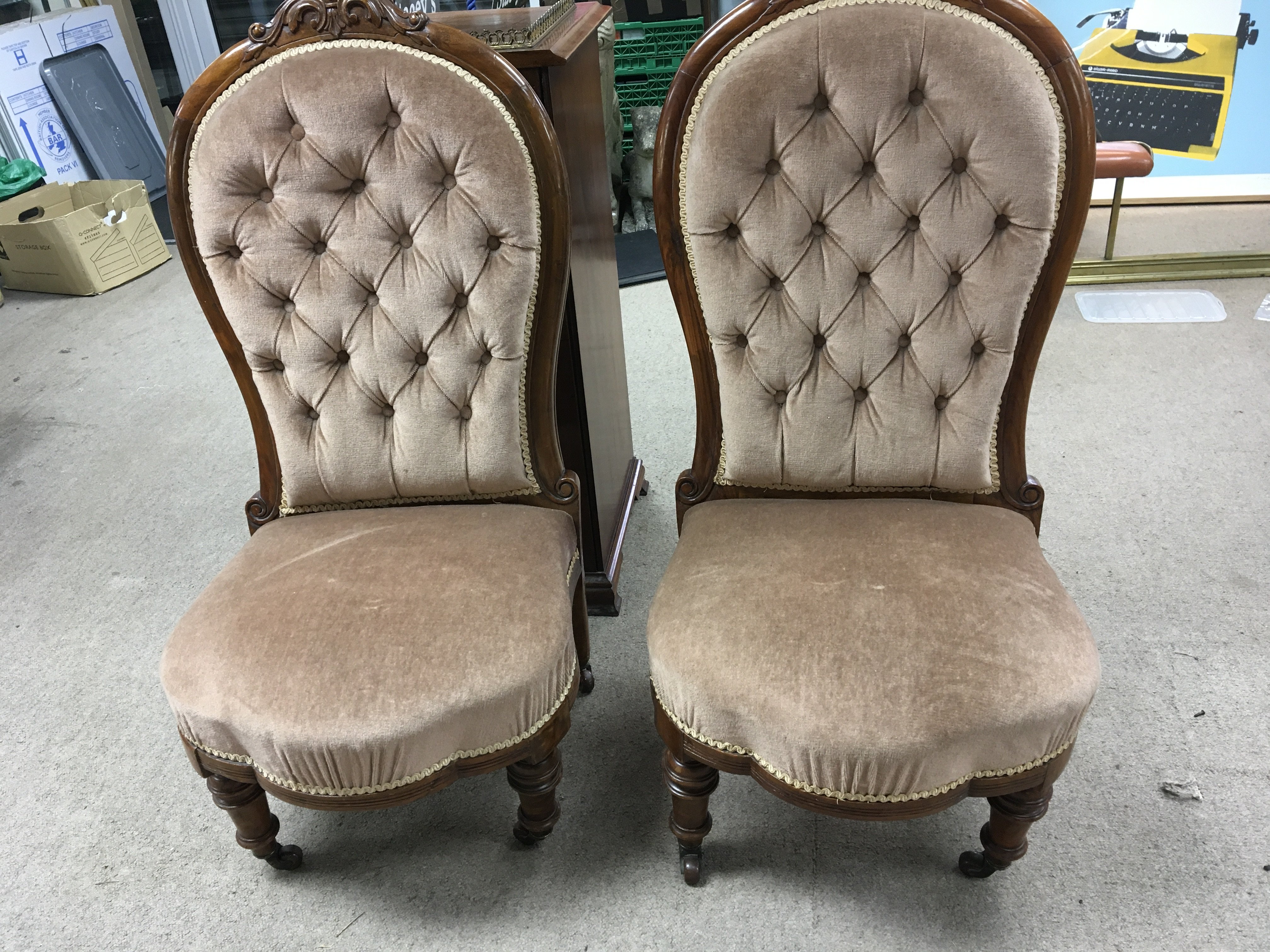 A pair of Victorian walnut occasional chairs with carved top rails and button down upholstery. Good condition. (2)