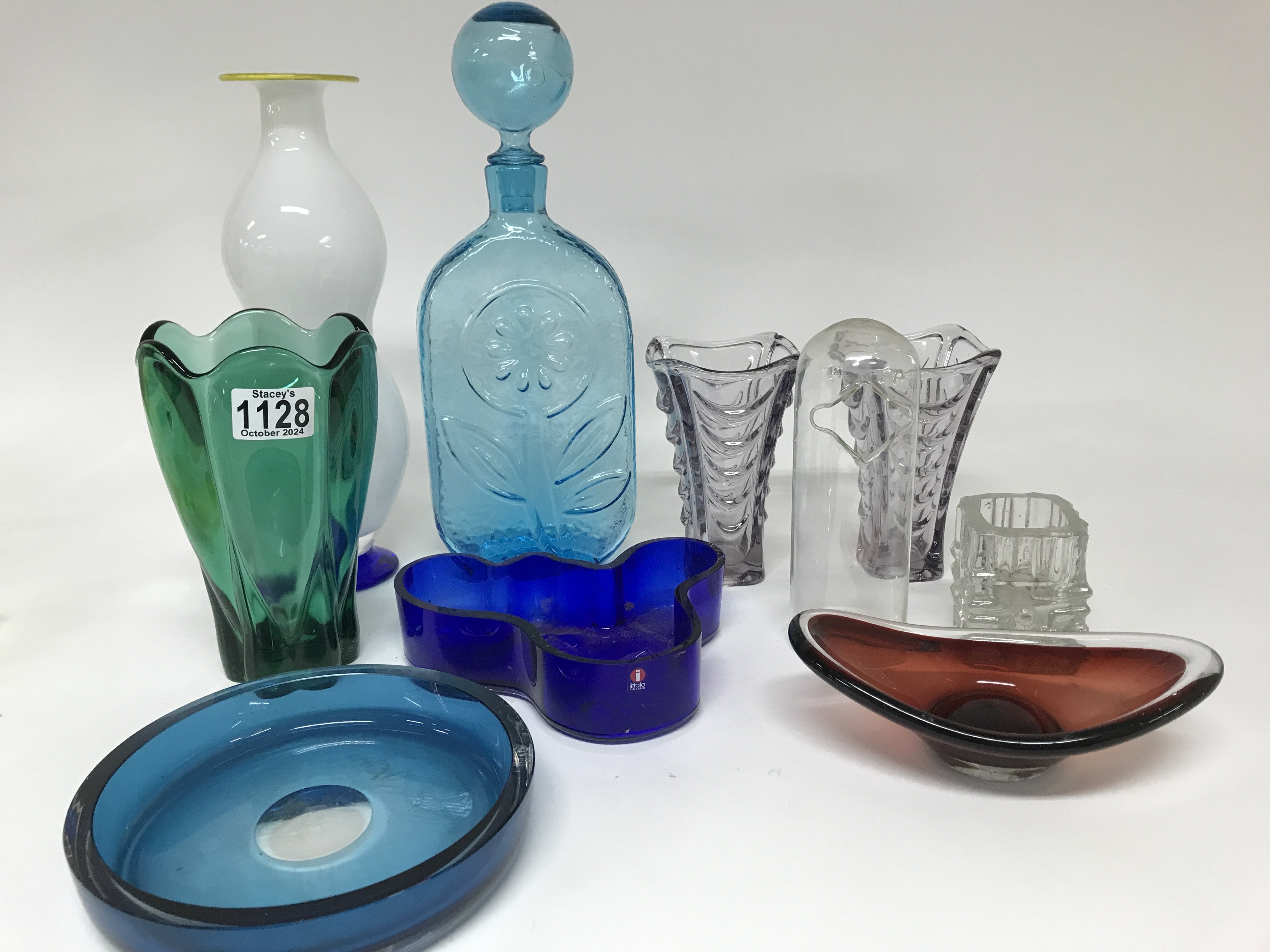 A collection of mid 20th century coloured trays, vases, decanters and other.