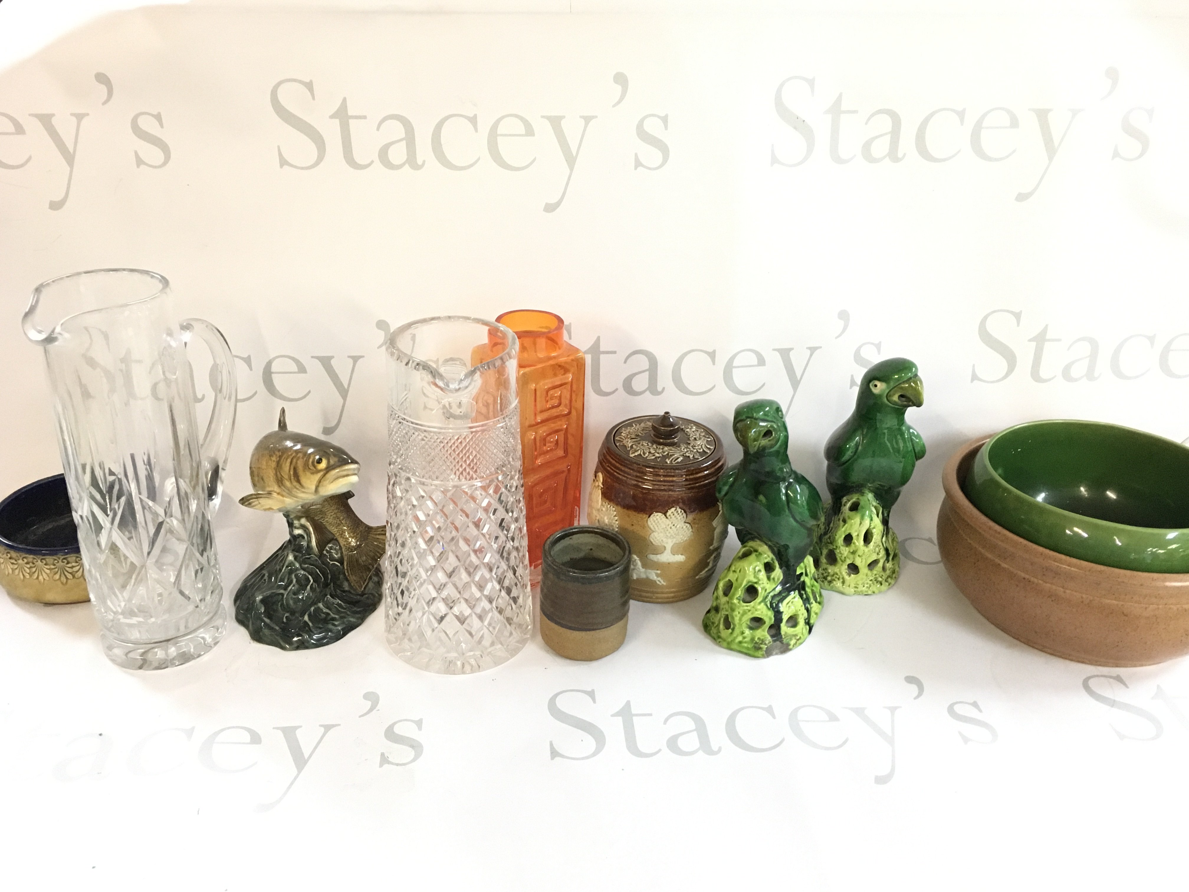 A Collection of mixed ceramics including a Beswick Brown trout, Royal Doulton Lambeth, cut glass jugs etc. this lot cannot be posted