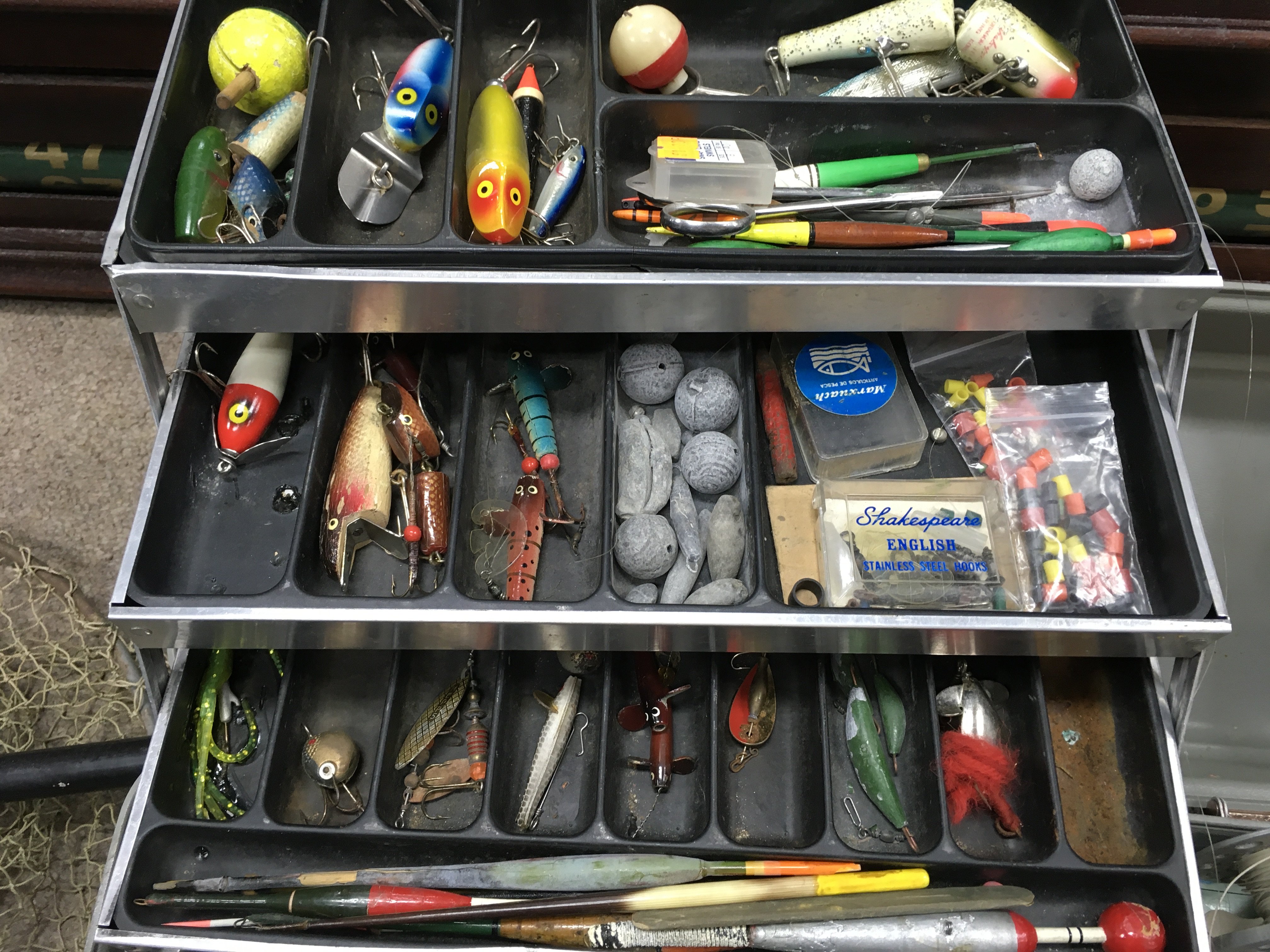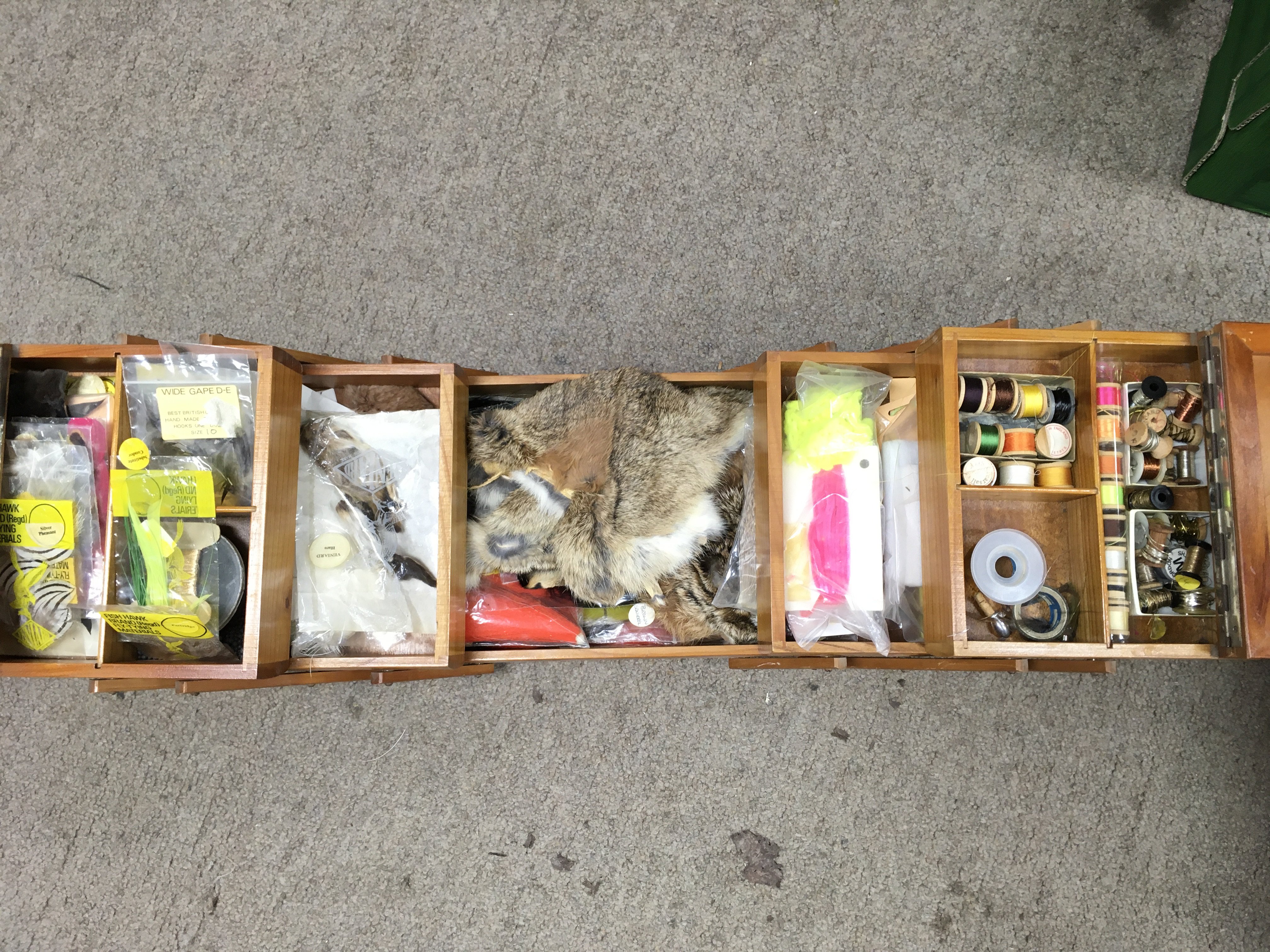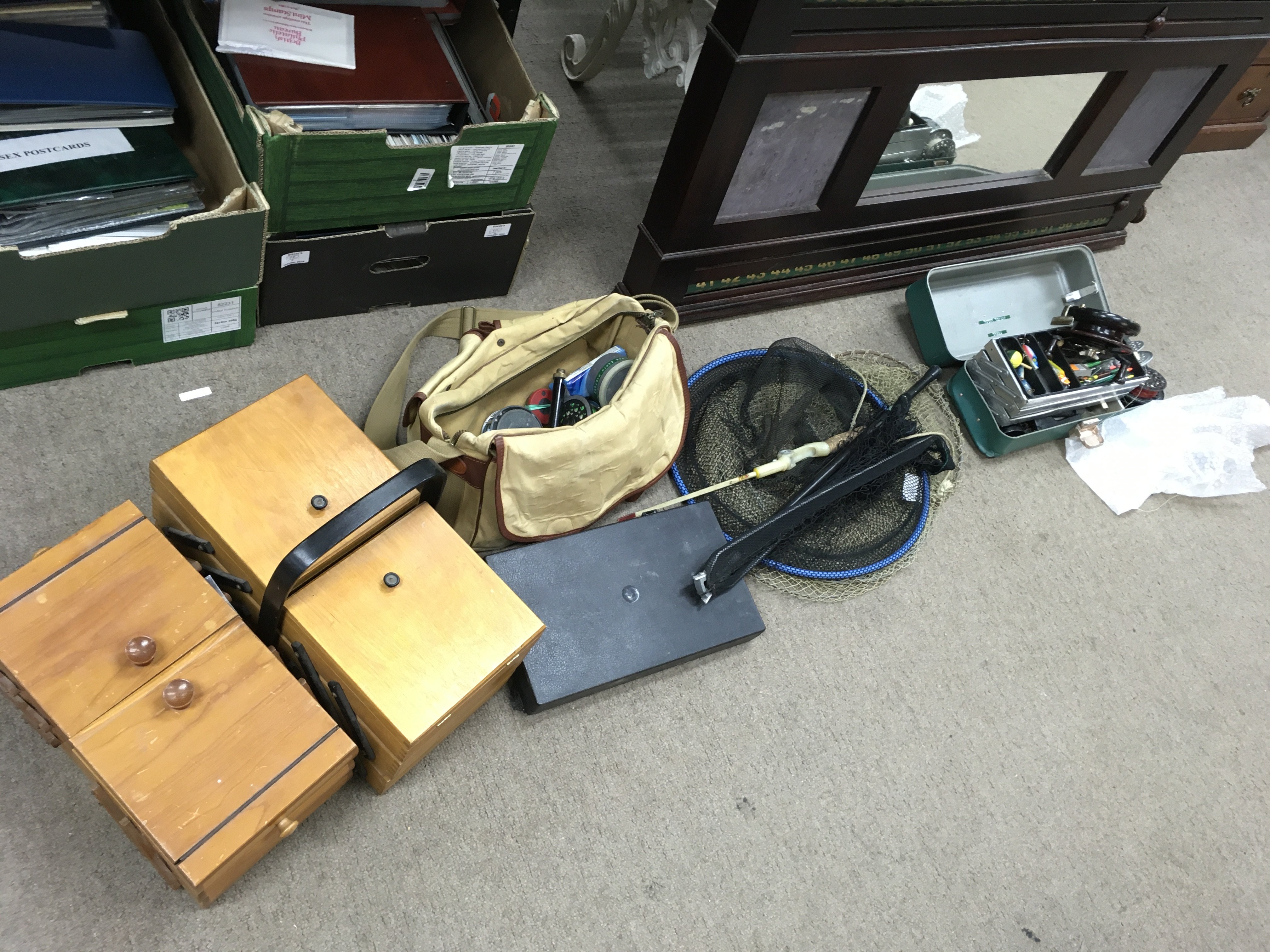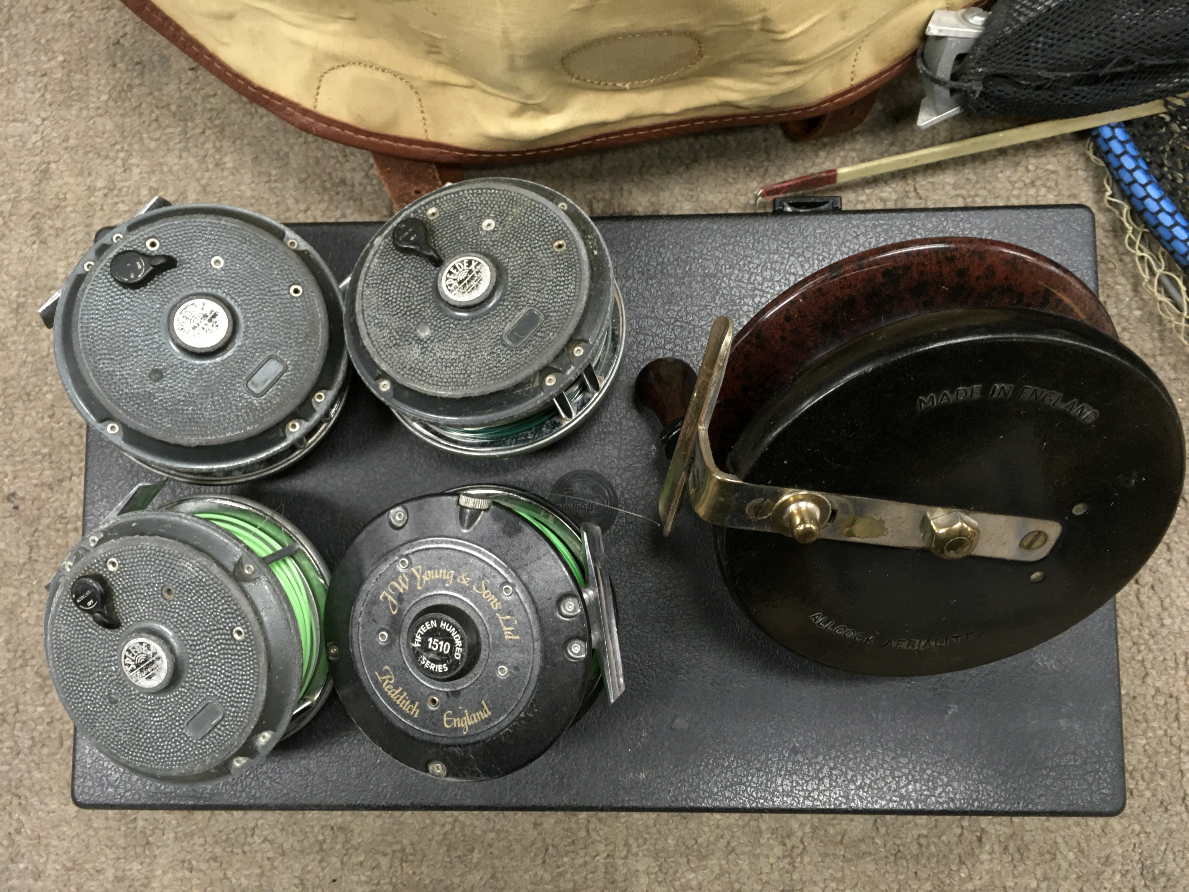 A Collection of fly fishing equipment including fly reels, Shakespeare, a J.W Young and sons reel, Alcock Aerialite, Acra Mitchell 300 spinning reel and a collection of rods including Daiwa, Hardy, Shakespeare. Fly tying equipment including feathers etc. this lot cannot be posted