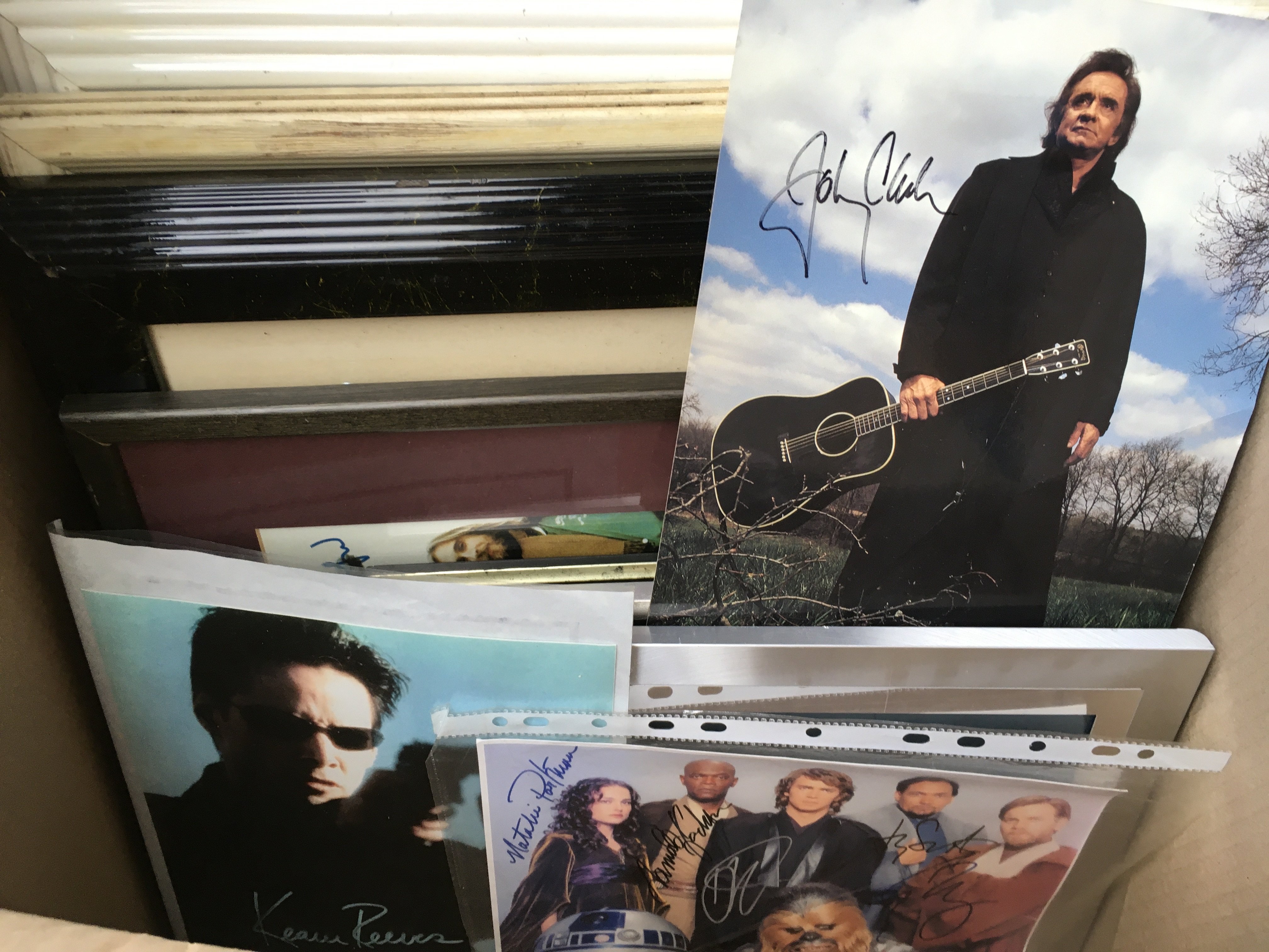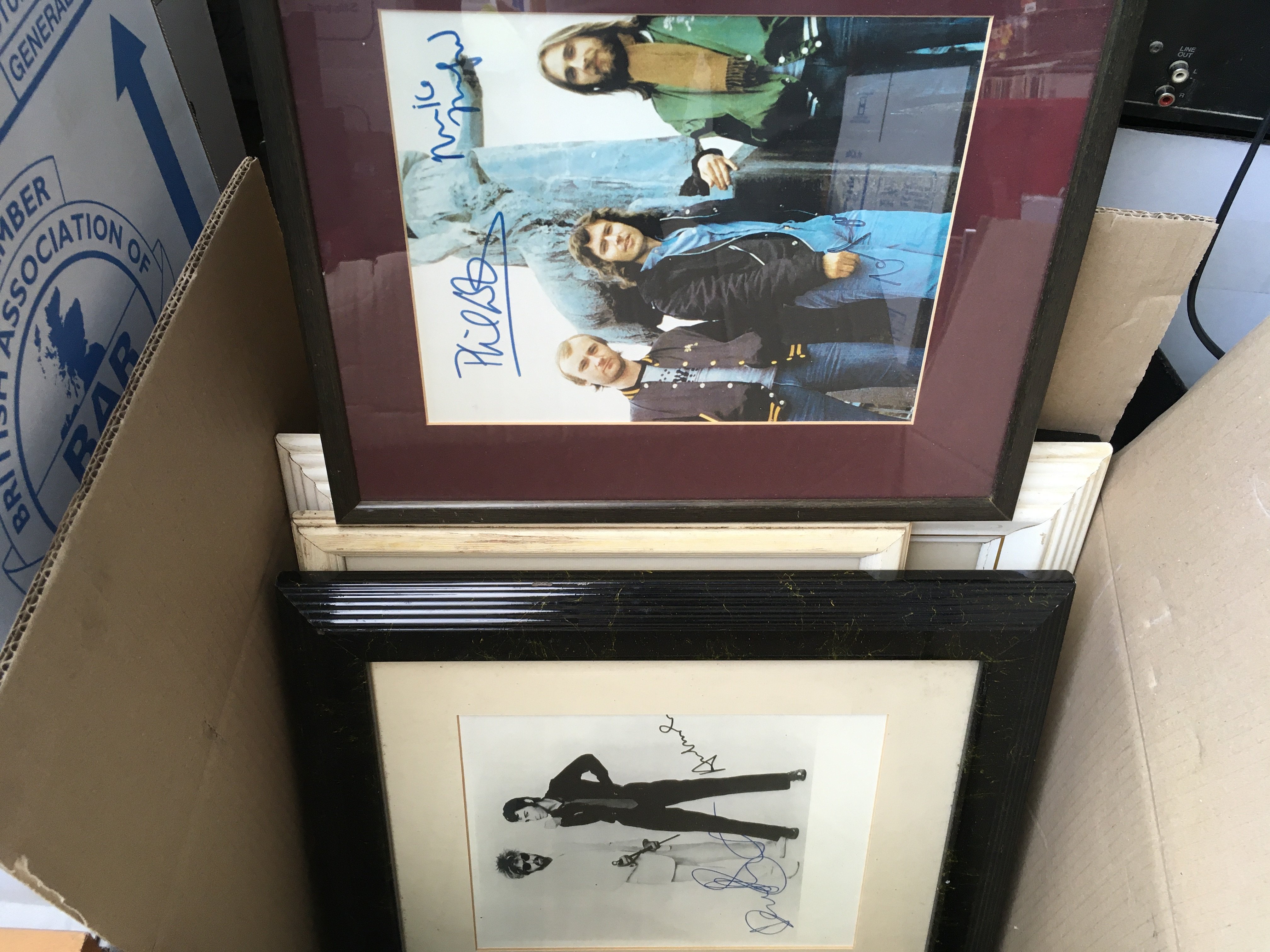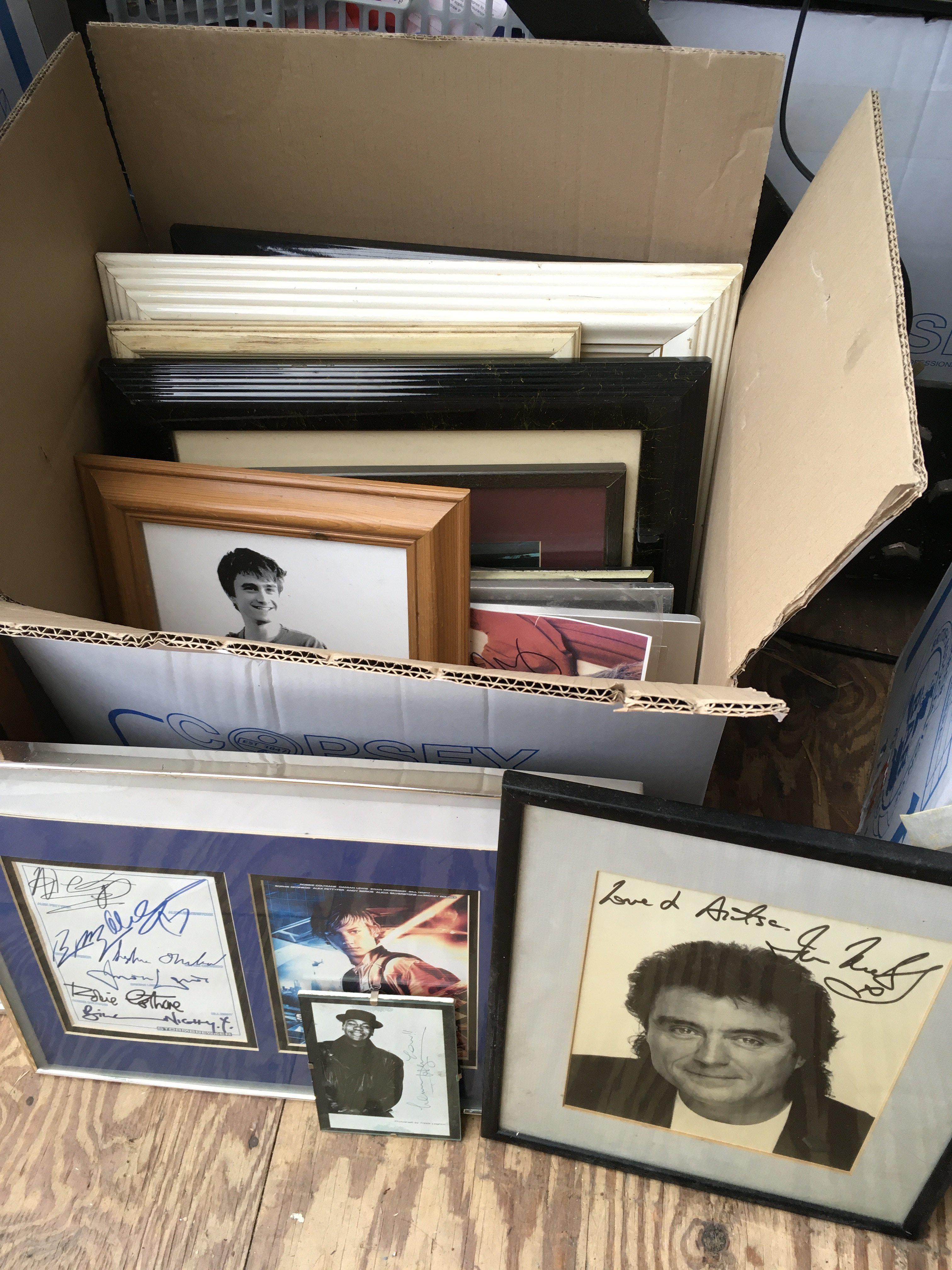 A box of framed and signed publicity prints of various actors and musicians, mostly printed. Please note that buyers must satisfy themselves as to the authenticity of any signed items before bidding as we are not experts in this field and will not be held responsible should they prove to be anything other than genuine.