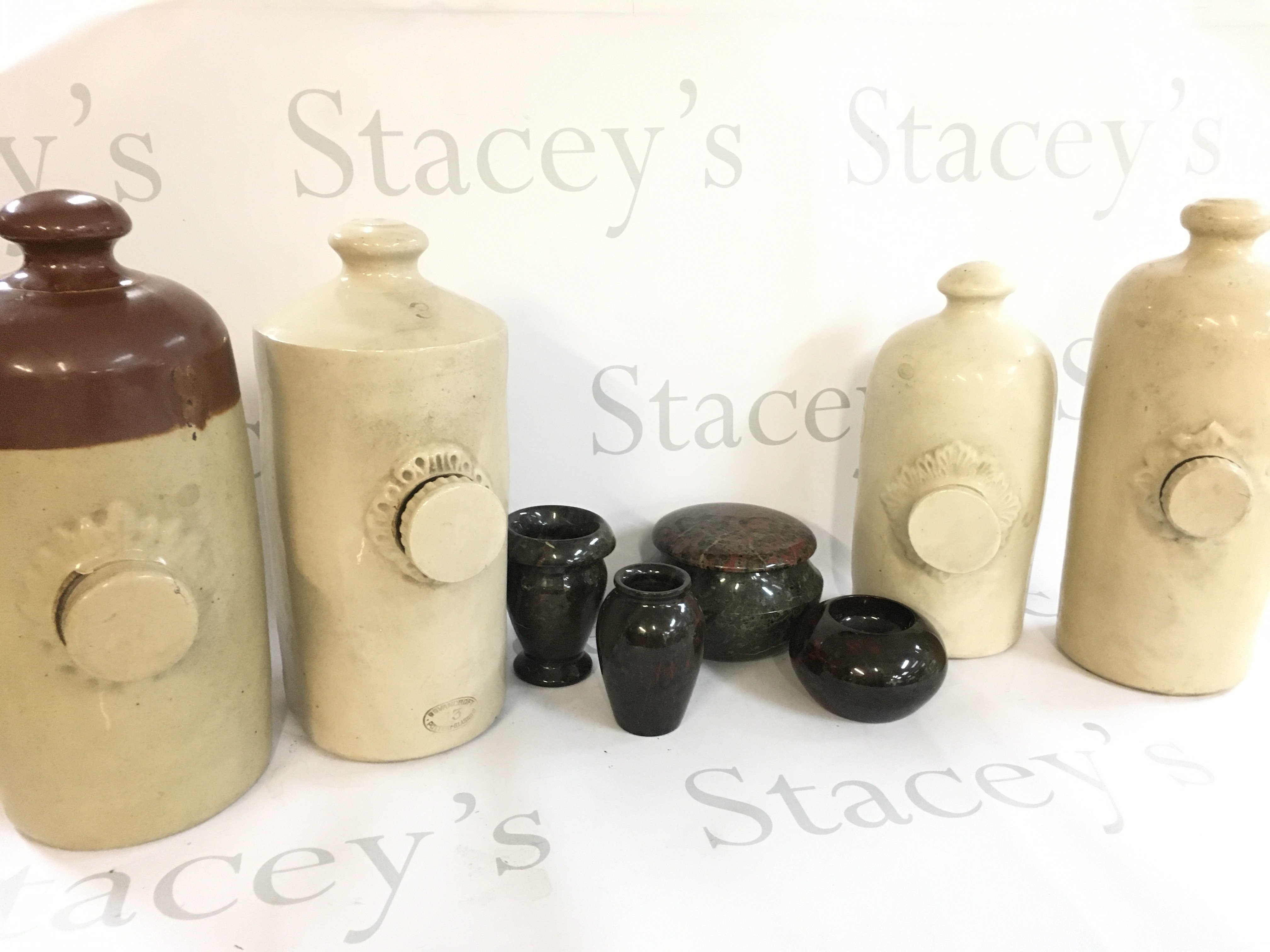 A Collection of Cornish art glass serpentine vases and stoneware bottles. This lot cannot be posted