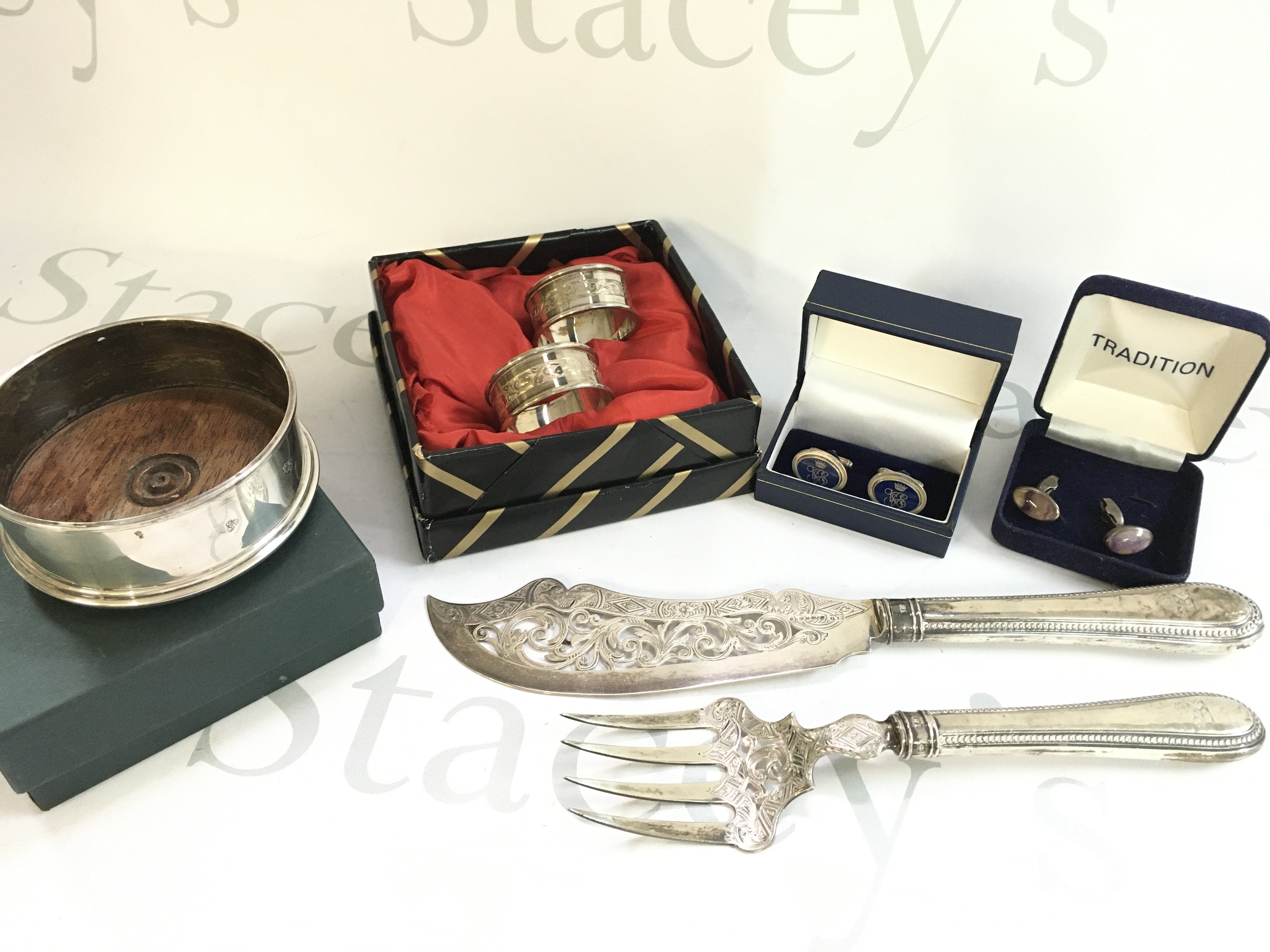 A Collection of silver hallmarked items including a fish knife and fork, cufflinks, napkin rings, dish.postage category B