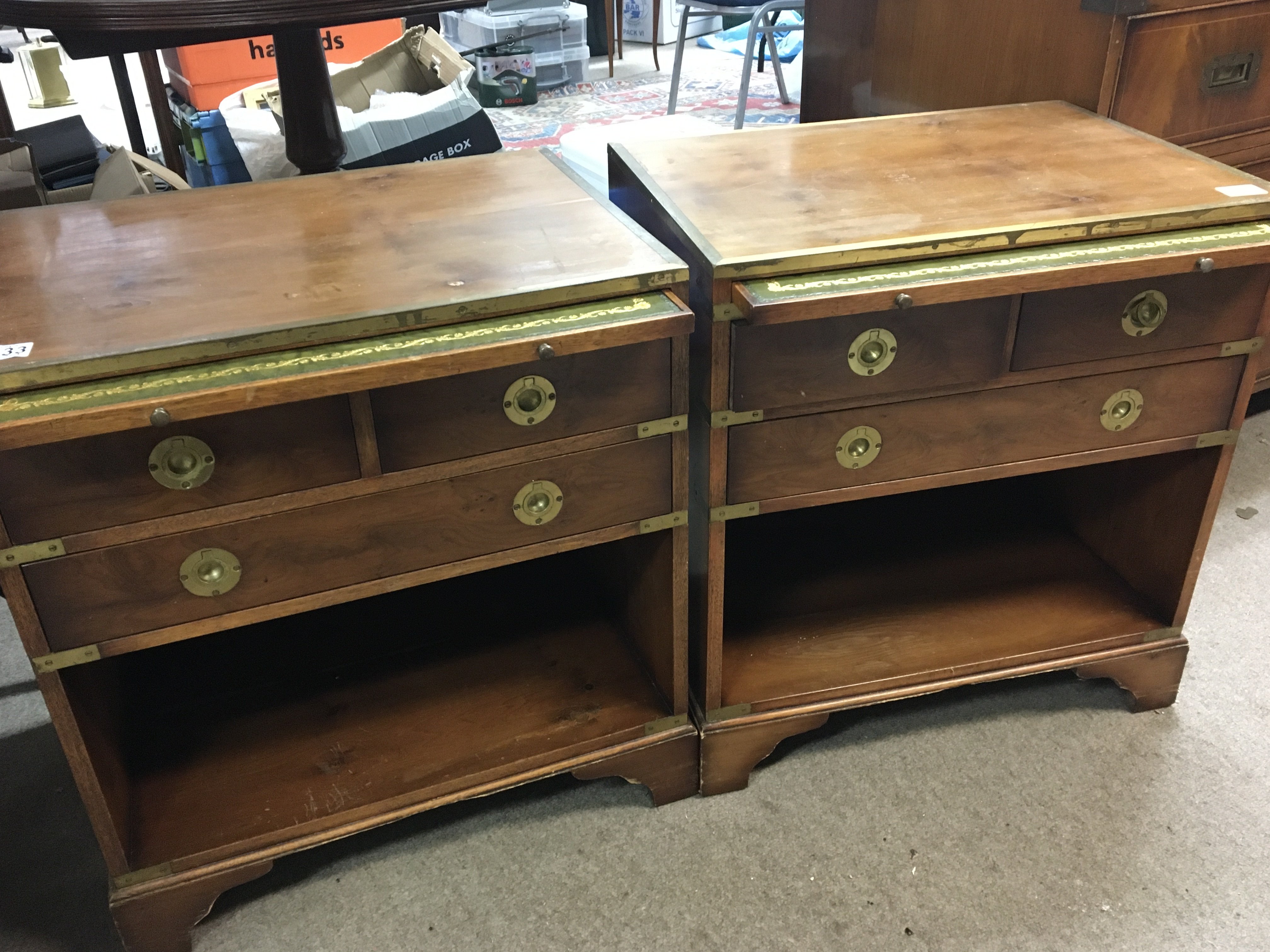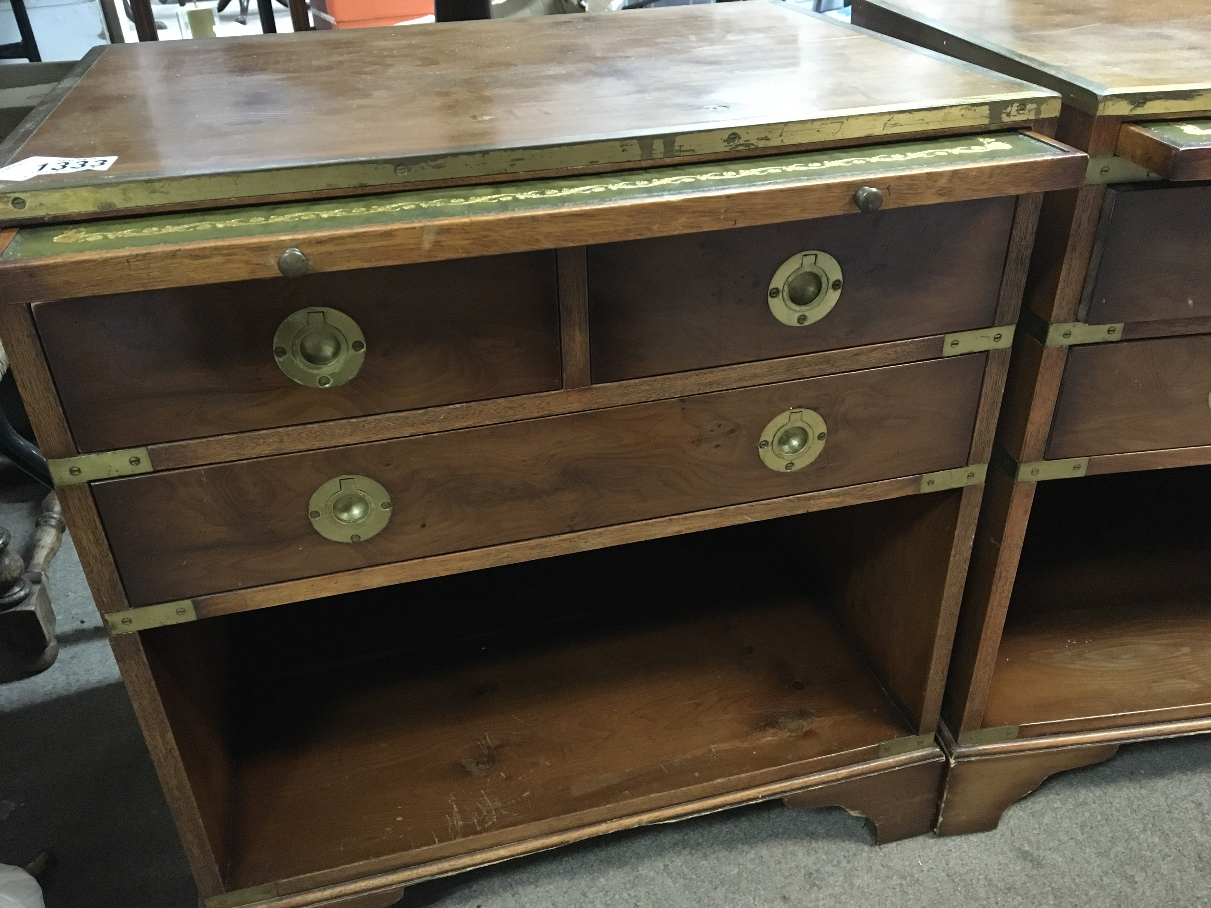 A pair of Yew wood campaign style cabinets with inset brass fittings and tooled leather brushing slides (2)