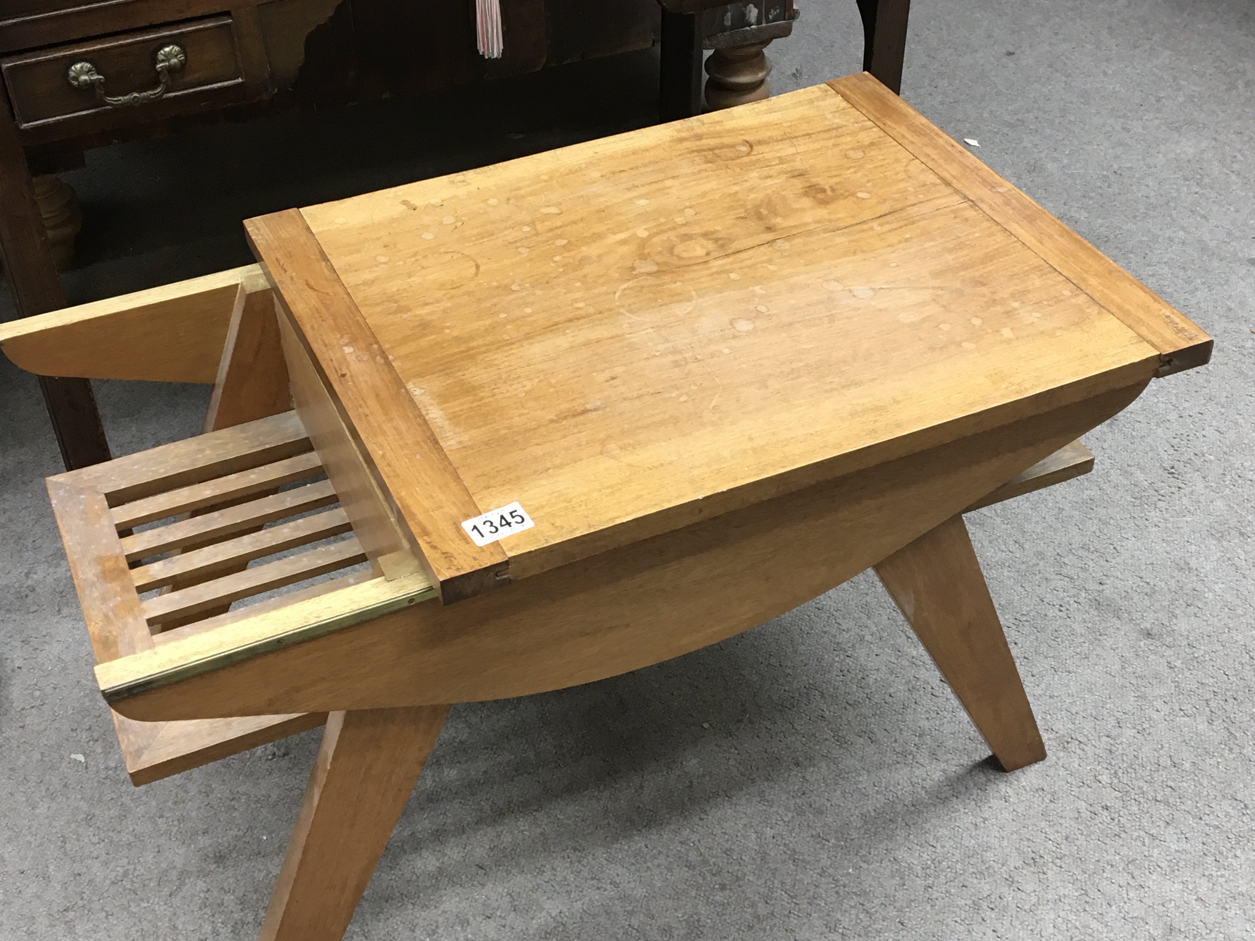 A modern design teak occasional table with a sliding top above shelves on splayed legs.