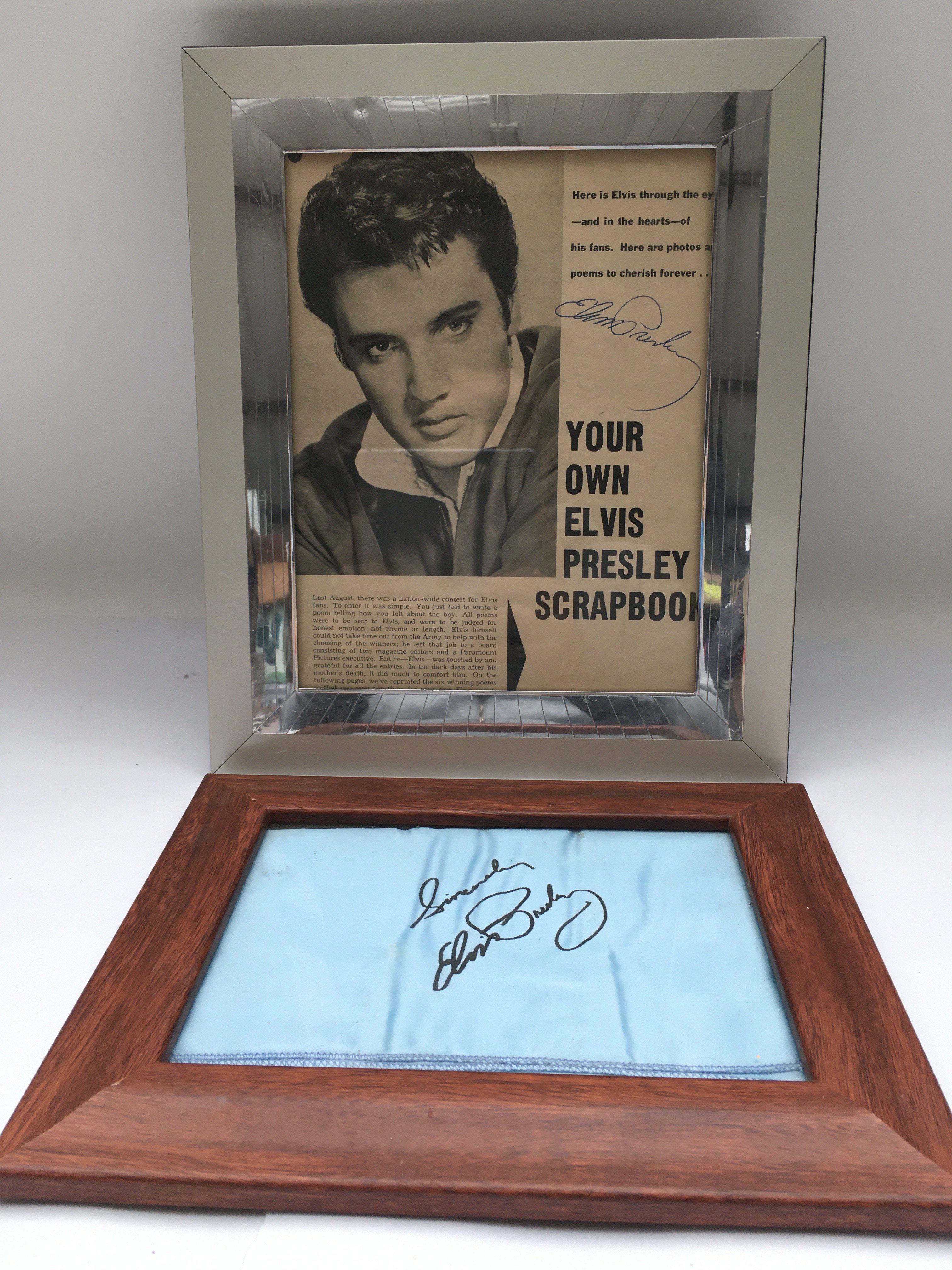 A framed Elvis Presley signed magazine page and a framed Elvis Presley light blue stage scarf with facsimile autograph of Elvis (2). These scarves were handed out at concerts in the 1970s. No COAs. Please note that buyers must satisfy themselves as to the authenticity of any signed items before bidding as we are not experts in this field and will not be held responsible should they prove to be anything other than genuine.