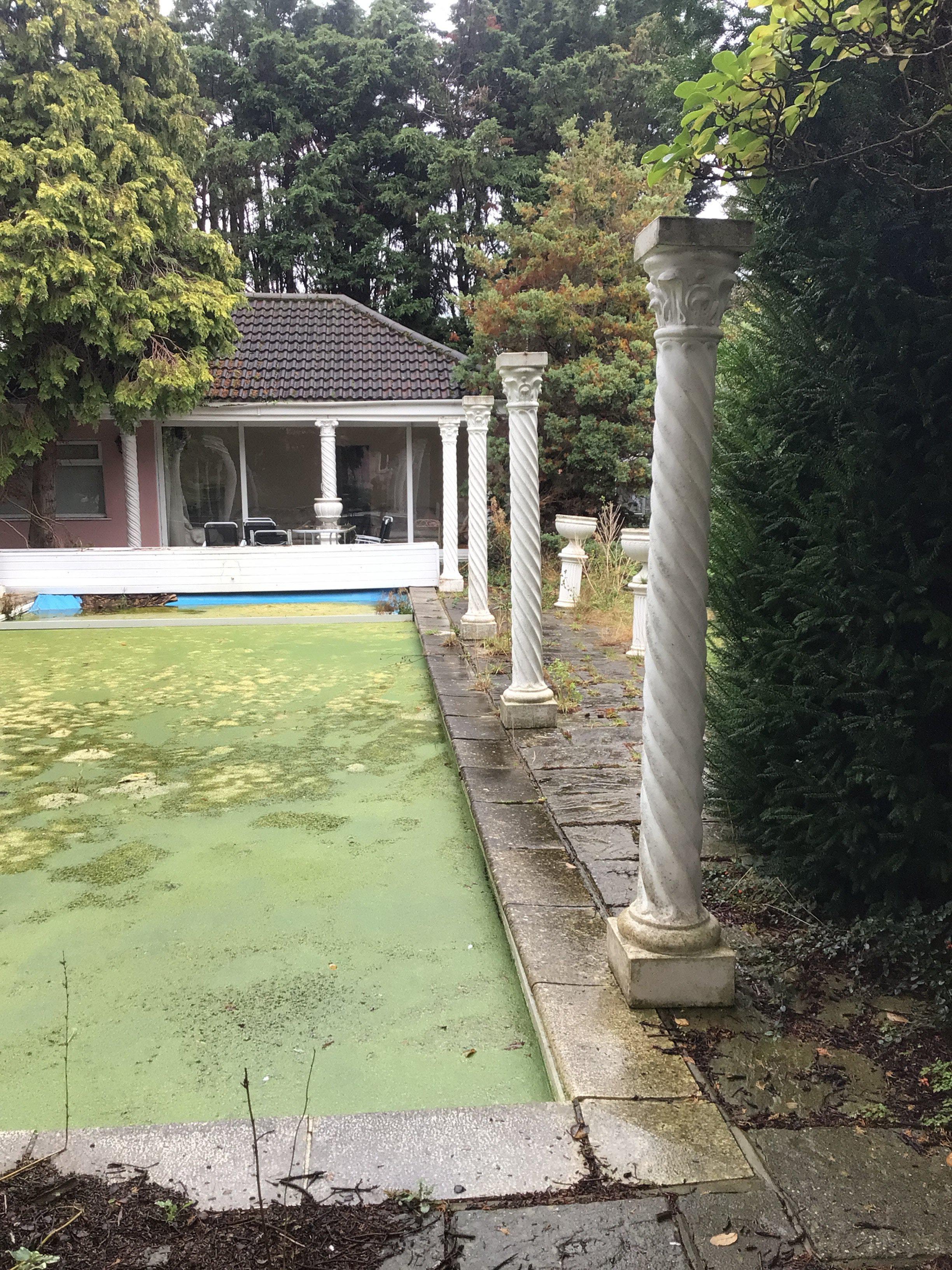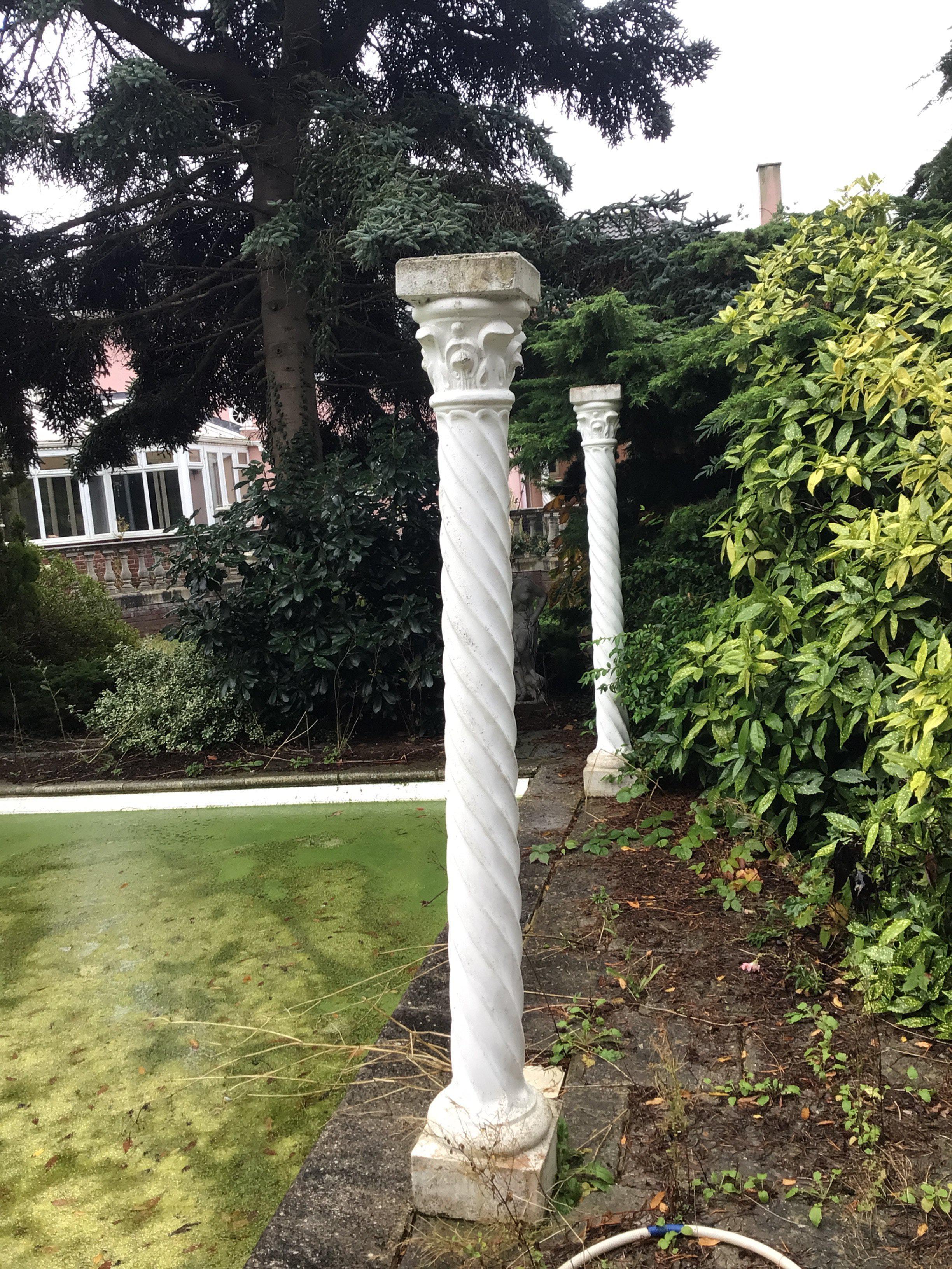 A set of eight composition garden pillars free standing stylised Corinthian columns with acanthus leave capitals and spiral coloums. Good condition not fixed to the ground so easy to collect sold in situ buyer to collect height 213cm high.