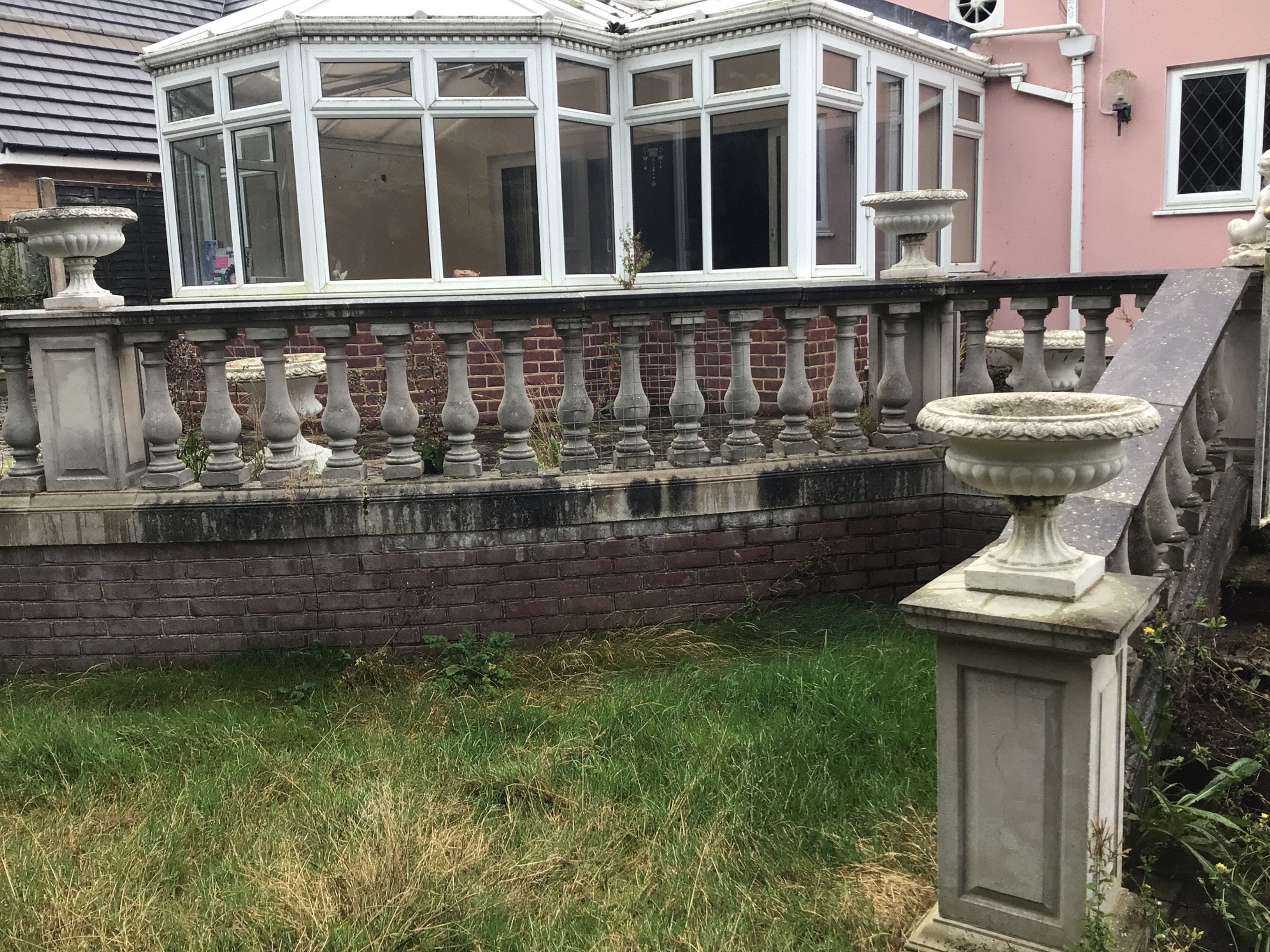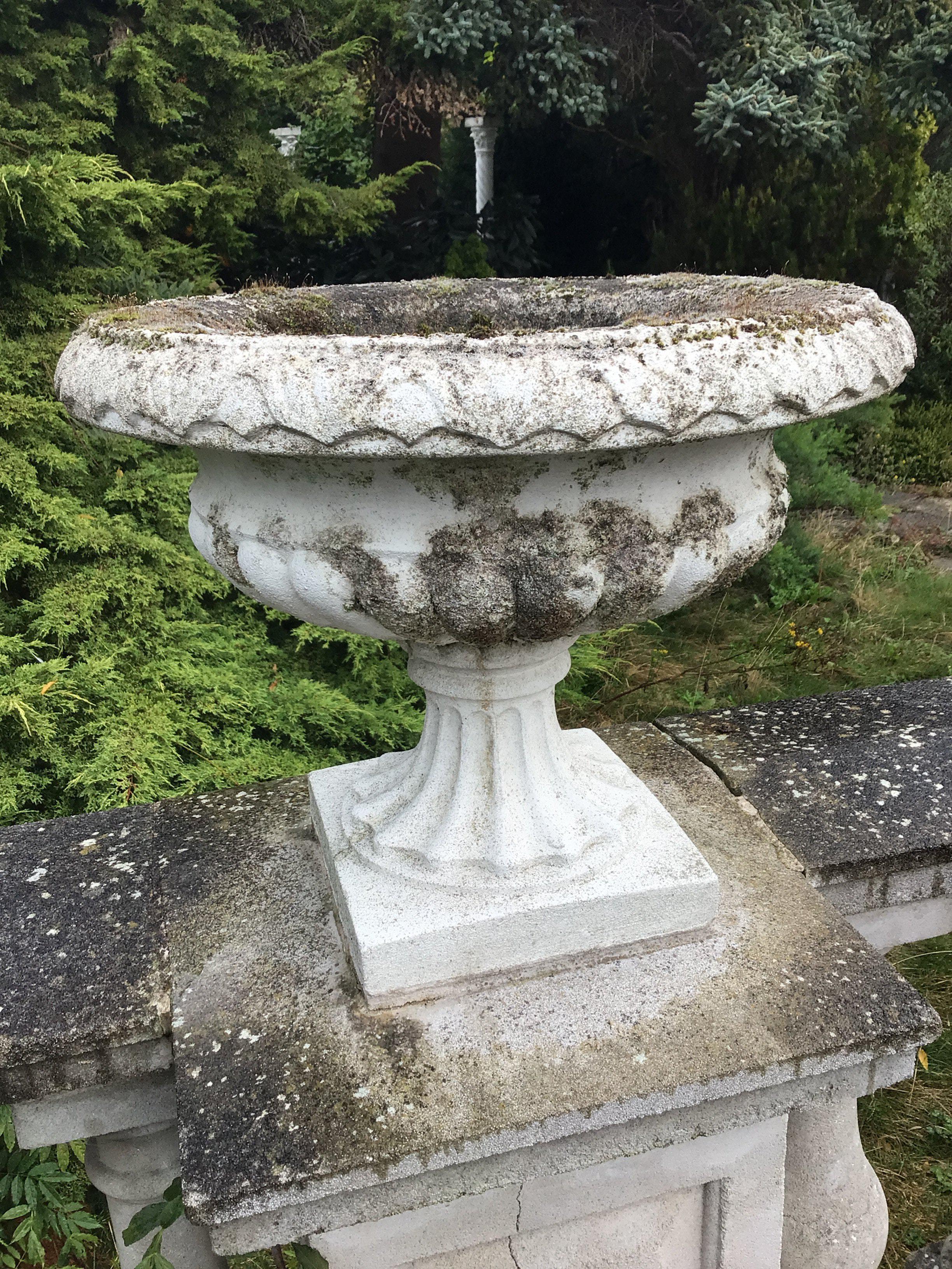 A set of Seven composition, concrete garden, ornaments in the form of classical urns these are cemented to a balustrade, but will come off quite easily sold in situ buyer to collect. Height 39cm